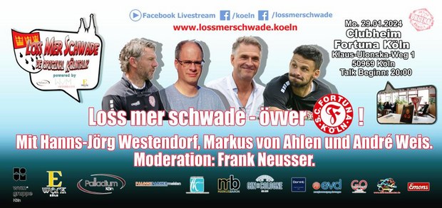 Moderator Frank Neusser hat eine illustre Reihe an interessanten Gästen am Start. Präsident Hanns-Jörg Westendorf, Trainer Markus von Ahlen, Kapitän Andre Weis bilden an diesem Abend das Fortuna-Dreigestirn. Es wird zudem aus den Reihen des Profikaders einen weiteren Überraschungsgast geben.