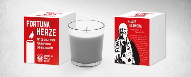 Die Kerze ist von einer Banderole umgeben, die neben dem Abbild von Klaus Ulonska die Worte Solidarität und Hoffnung trägt. Die Kerze ist für einen Preis von 19,48 Euro im Fortuna-Onlineshop erhältlich. Während davon 5,00 Euro direkt an die Jugend der Fortuna gespendet werden, gibt es zudem einen 5,00 Euro Gutschein für den Fanshop am Südstadion.