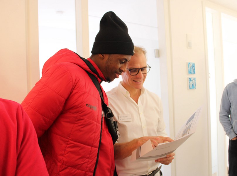 Weiter ging die Tour schließlich zu Dr. Ulrich Müller Lung. Bereits seit 2017 unterstützt er gemeinsam mit seinem Team der Radiologischen Praxis Köln die Fortuna. Die Praxis befindet sich im Gebäude des Malteserkrankenhauses St. Hildegardis und verfügt über ein Untersuchungsgerät für Kernspintomografie (MRT) sowie ein Untersuchungsgerät für die Computertomographie (CT). Im Vergleich wirkt die Praxis relativ klein, bietet jedoch genau durch diese Aspekte die perfekte und persönliche Unterstützung für die Spieler. Mit seinem Team sorgt Dr. Ulrich Müller Lung für die genaue Abbildung der Verletzung, die die Grundlage der Diagnose und der späteren Behandlung darstellt.