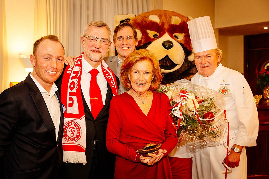 Nach einem Sektempfang wartete auf Mannschaft und Partner ein vier-Gänge Menü von Sternekoch Erhard Schäfer. Dabei saßen Spieler und Partner gemischt an den Tischen, damit sich die Fortuna-Familie weiter näher kennenlernen konnte. Ein Rahmenprogramm zwischen den Gängen sorgte für gute Unterhaltung. So bekam Helge Ulonska eine in Bronze gegossene Original-Stadionwurst überreicht für ihr jahrelanges Engagement beim Südstadtclub. Die Fortuna-Freunde Cornel Wachter (Künstler), Irmgard Stoffels (EXPRESS), Andreas Hupke (Bezirksbürgermeister), Hartmut Priess (Bläck Fööss), Heribert Rösgen (Kölner Stadt-Anzeiger), Wolfgang Fahrian (Fortuna-Torwartlegnde), Pfarrer Hans Mörtter und Erhard Schäfer hatten den Preis ins Leben gerufen, der regelmäßig für besondere Leistungen zu Gunsten der Fortuna verliehen werden soll.
