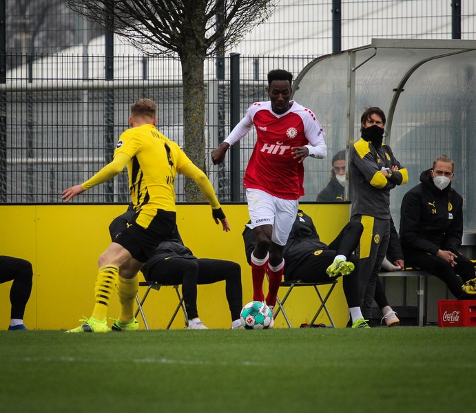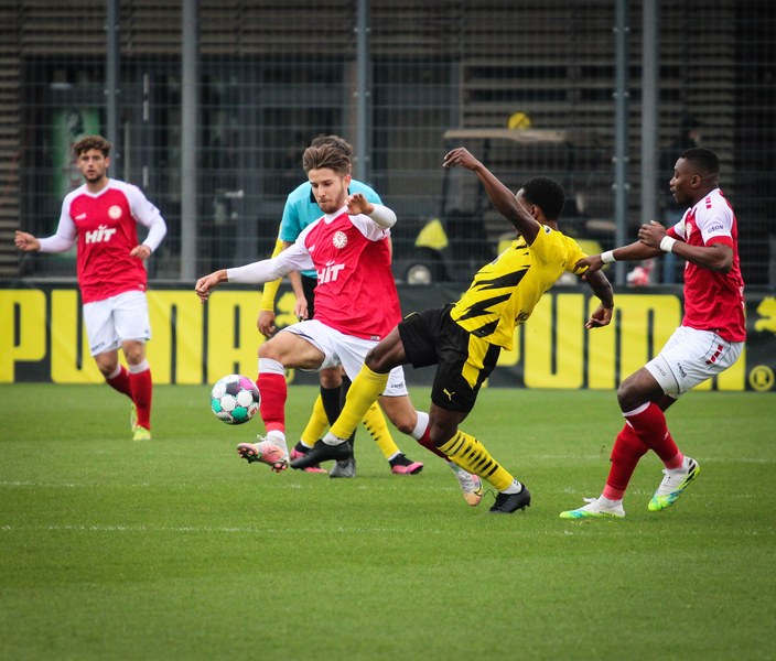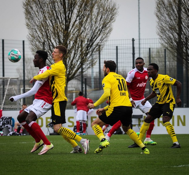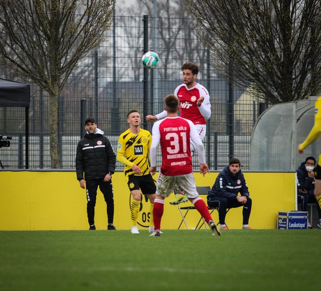 Beide Mannschaften kamen personell unverändert aus den Kabinen zurück, ehe Prokoph zur zweiten Halbzeit anstieß. Die Fortuna kam sichtlich motiviert zurück auf das Spielfeld und erspielte sich sofort die erste große Gelegenheit. Poggenbergs Flanke landete am hinteren Fünfereck bei Owusu, welcher sofort draufhielt. Der Keeper der Dortmunder war noch rechtzeitig zur Stelle und lenkte den Ball zur Ecke (46.). Fast dieselbe Chance erspielten sich die Kölner zwei Minuten später. Diesmal war es Salman, der einen Freistoß auf Höhe der Mittellinie ausführte und den Ball somit in den gegnerischen Sechzehner brachte. Durch die Kopfball von Löhden wurde das Spielgerät auf den am zweiten Pfosten stehenden Owusu verlängert. Diesmal war der Winkel aber zu spitz, sodass Unbehaun den Schuss problemlos festhalten konnte (48.). Fortuna kam mit viel Schwung aus der Kabine, musste in der 51. Minute dann aber einen Rückstand hinnehmen. Poggenberg bekam auf der linken Verteidigerposition den Ball nicht entscheidend aus der Gefahrenzone, wodurch die Kugel letzten Endes unglücklich beim Dortmunder Toptorschützen Tigges landete. Tigges behielt die Nerven, legte sich den Ball in aller Ruhe im Strafraum der Fortuna zurecht und schob gekonnt rechts neben Rauhut zum 1:0 ein. Kurz nach der Führung des BVB schlich sich wieder die Ungenauigkeit in das Aufbauspiel der Fortuna. Durch unkonzentrierte Zuspiele brachte sich die Fortuna teilweise selbstverschuldet in Bedrängnis und hatte Glück, dass die Dortmunder die Fehler bislang nicht ausnutzten. Je mehr Minuten vergangen, desto mehr kämpfte sich die Fortuna zurück in die Partie. Kapitän Löhden ging voran und setzte ein starkes Zeichen, nachdem er gut aufgepasste und Bakir den Ball in aussichtsreicher Position im Strafraum klaute (61.). Die Borussen forderten zwar lautstark einen Elfmeter ein, jedoch war Löhdens Einsatz sauber und auch enorm wichtig. Die erste gelbe Karte des Spiels sah Mittelfeldmann Brandenburger, nachdem er an der Mittellinie zu hart gegen Tigges einstieg (62.). Durch eine von Ubabuike getretene Ecke kam Rumpf im gegnerischen Strafraum vielversprechend zum Abschluss. Sein Kopfball ging aber knapp am Kasten des BVB vorbei. Die Fortuna griff jetzt sichtlich früher den Gegner an und brachte ihn dadurch immer wieder in Bedrängnis. Sie ließen die Dortmunder jetzt nicht mehr ungestört in die eigene Hälfte marschieren, sondern wollten das Spiel selbst spielerisch gestalten. Nichtsdestotrotz kam der BVB im Anschluss zur nächsten riesen Tormöglichkeit. Diesmal war es Ercan, der nach einem durchgesteckten Pass frei vor Rauhut auftauchte. Er nutzte die Chance aber nicht und schlug den Ball aus kurzer Distanz über die Latte (72.). Nach der Aktion wechselte Trainer Alexander Ende das erste Mal und brachte Najar für den gelb vorbelasteten Brandenburger (73.) Außerdem verließ Salman den Platz für Kegel (80.) und Baba kam für Ubabuike (83.). Fortuna gab sich bis zum Schluss nicht auf und versuchte immer wieder den Weg in das letzte Drittel zu finden. Auf der rechten Außenbahn überspielten Ochojski und Owusu die gegnerische Abwehr mit einem schönen Doppelpass, wodurch Owusu an der Grundlinie frei zum Flanken kam. In der Mitte lief Löhden ein und köpfte den Ball wuchtig ganz knapp am linken Pfosten vorbei (83.). Anschließend brachte Ende den jungen Özden für Poggenberg (84.). Die Dortmunder bekamen in den Schlussminuten kaum mehr Entlastung und schlugen die Bälle nur noch raus, sodass Fortuna immer wieder neu anlaufen musste. In der 87. Minute war es erneut Löhden, der den Ausgleich auf dem Kopf hatte. Ochojskis präzise Hereingabe setzte er aber auch wenige Zentimeter am Tor vorbei (87.). Am Ende musste sich die Fortuna gegen den Tabellenführer knapp mit 1:0 geschlagen geben. Die Schlussoffensive kam etwas zu spät.