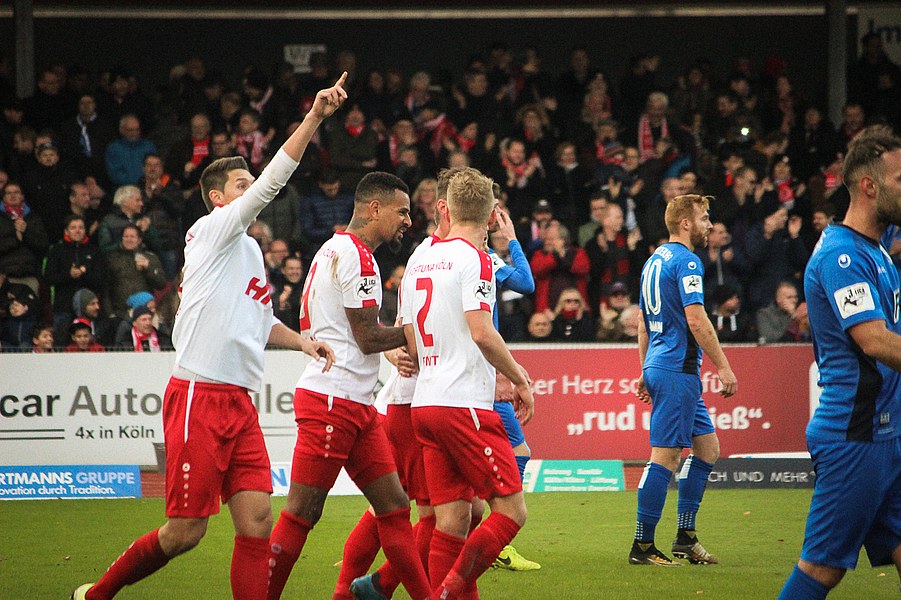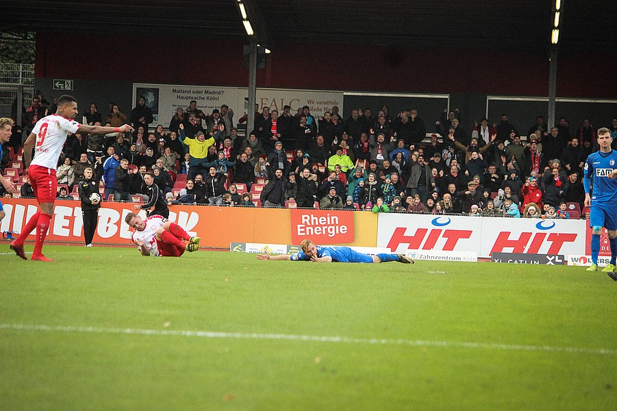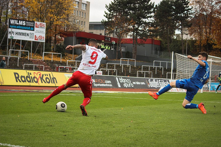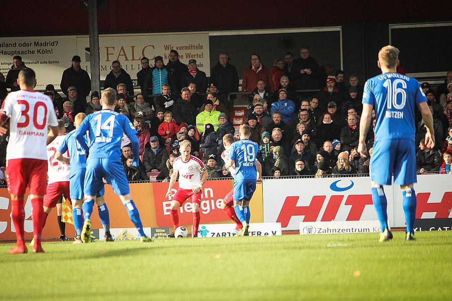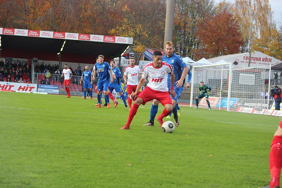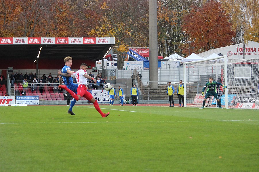 Beide Teams schlugen von Beginn an eine hohe Intensität im Südstadion an. So setzte man sich gegenseitig früh unter Druck und ließ dem anderen kaum Platz, um sich zu entfalten. Die Fortuna schaffte es häufiger mal den Strafraum zu attackieren, aber es war Magdeburgs Beck, der den ersten gefährlichen Torschuss verbuchte (5.). Die Fortuna hatte vorsichtige Annäherungen von Dahmani und Keita (10./13.). Es war aber schließlich der Gast, der die erste Unachtsamkeit eiskalt bestrafte: Nach langem Ball von Butzen tauchte Niemeyer frei vor Boss auf und ließ dem Kölner Keeper keine Chance (17.). Die Kölner antworteten mit Torschüssen von Kurt und Dahmani (20./21.). Man tat sich aber schwer in die Magdeburger Hälfte zu kommen, weil man früh am Spielaufbau gestört wurde. So war der FCM mit einem Kopfball von Beck und einem Freistoß von Niemeyer dem nächsten Tor näher (25./33.). Aus dem Nichts bot sich dann aber die Chance zum Ausgleich, als Kegel Scheu im Strafraum freispielte und der von Hammann gefoult wurde. Den fälligen Elfmeter verwandelte Keita-Ruel sicher (44.). Nachdem Brandenburger im Gegenzug ein Zuspiel von Niemeyer in höchster Not klärte (45.), ging es mit dem Remis in die Kabine.