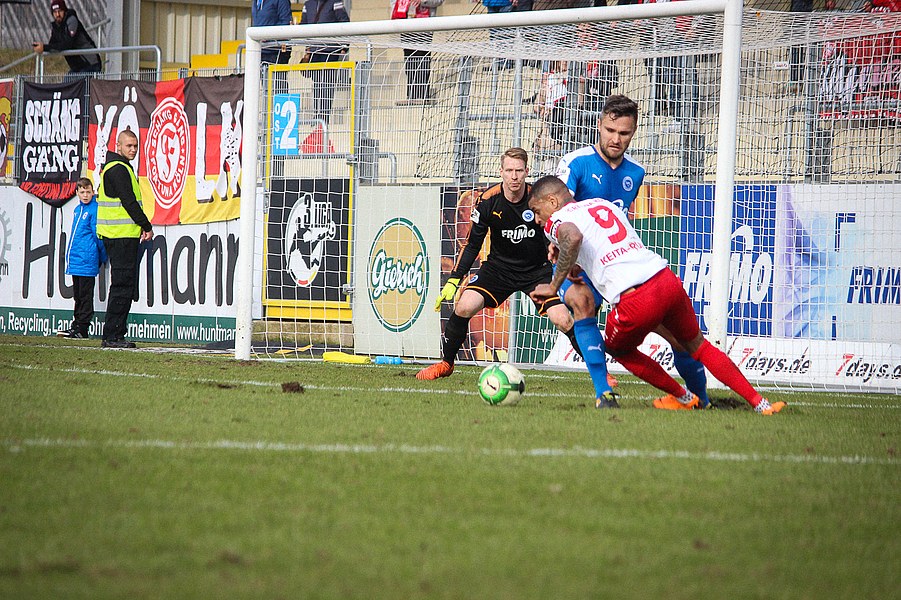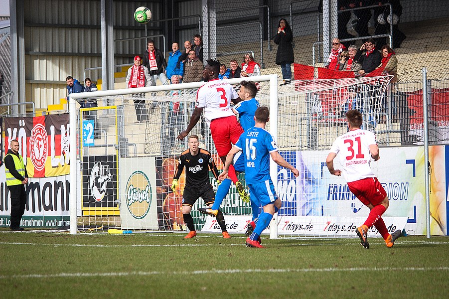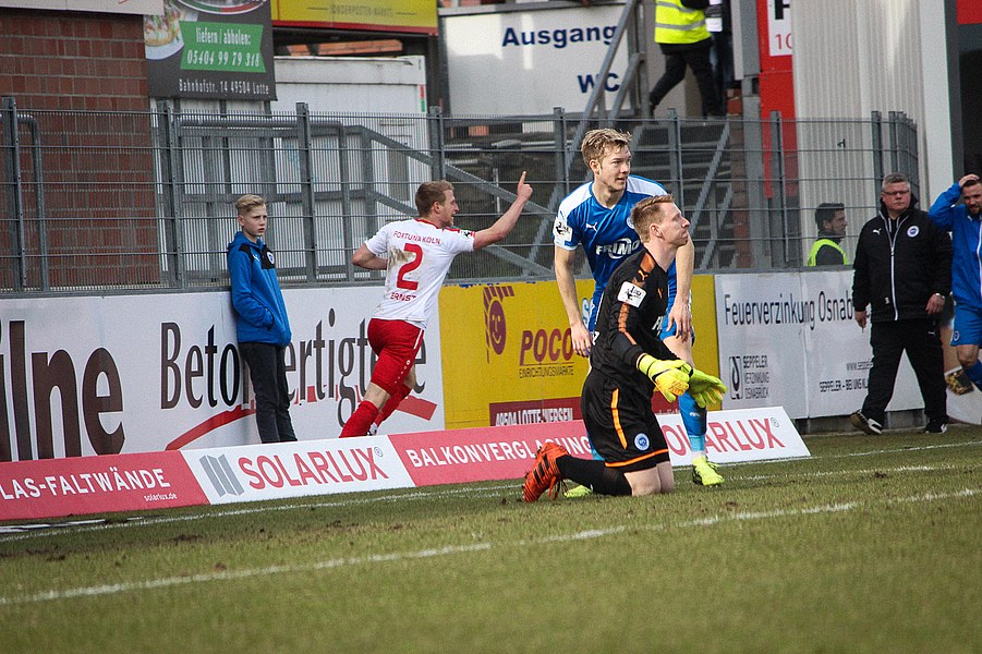 Beiden Mannschaften konnte man zu Beginn der Begegnung die Anstrengungen der englischen Woche anmerken. Während die Fortuna zwei Siege feiern konnte, mussten die Sportfreunde zweimal jeweils spät Gegentreffer hinnehmen. Es entwickelte sich ein Spiel, das Größtenteils im Mittelfeld stattfand. Die erste nennswerte Chance verbuchte allerdings die Fortuna: Nach Zuspiel von Scheu konnte Keita-Ruel in den Strafraum eindrinen. Sein Abschluss wurde jedoch abgefälscht (14.). Danach kamen die Gastgeber besser ins Spiel und setzten per Standards gefährliche Akzente: Osterhelweg verfehlte mit einen Freistoß knapp das Tor (22.). Nach der zweiten Ecke der Sportfreunde zielte Rosinger per Volleyabnahme knapp am langen Pfosten vorbei (25.). Nach der Lotter Drangphase verflachte das Spiel dann wieder, ehe Kegel einen Geniestreich im Fuß hatte: Mit einem punktgenauen Diagonalball hinter Lottes Viererkette spielte er Ernst frei, der Lotte-Keeper Buchholz eiskalt tunnelte und zur Kölner Führung traf (39.). Anschließend konnte sich die Fortuna bei Torhüter Tim Boss bedanken, dass sie nicht den Ausgleich hinnehmen musste: Nach einem Ballverlust tauchte Rosinger frei vor dem Tor auf, aber Boss konnte parieren(41.). So ging es mit der Führung in die Halbzeitpause.