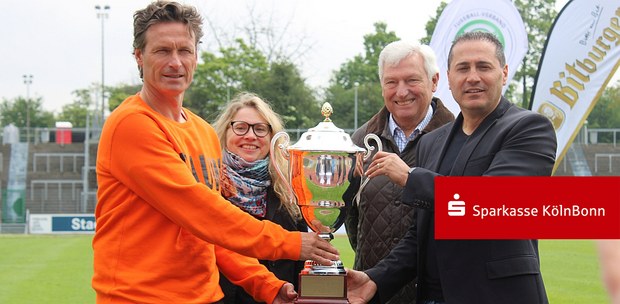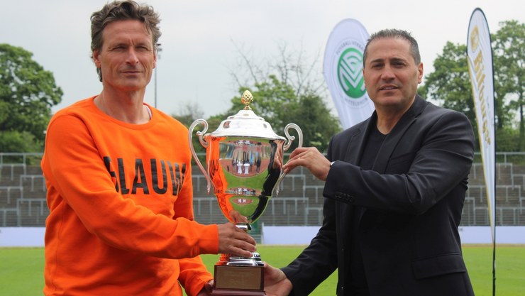 Nach einem gemeinsamen Foto mit Aachen-Coach Fuat Kilic sprach Zapel mit Ellen Bertke, der Referentin Medien & Kommunikation vom Fußball-Verband Mittelrhein e.V., über die aktuelle Situation bei Fortuna Köln und über den Finalgegner Alemannia Aachen.