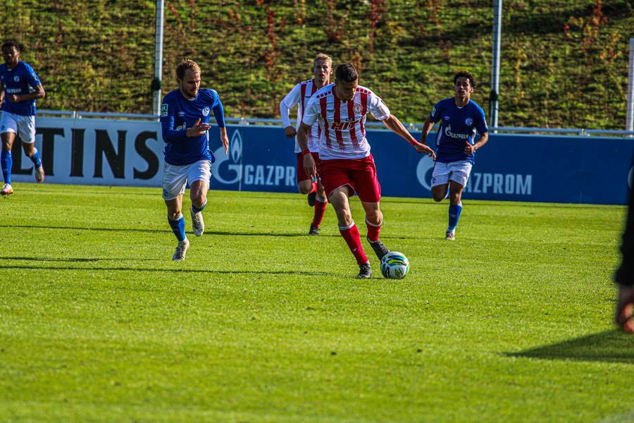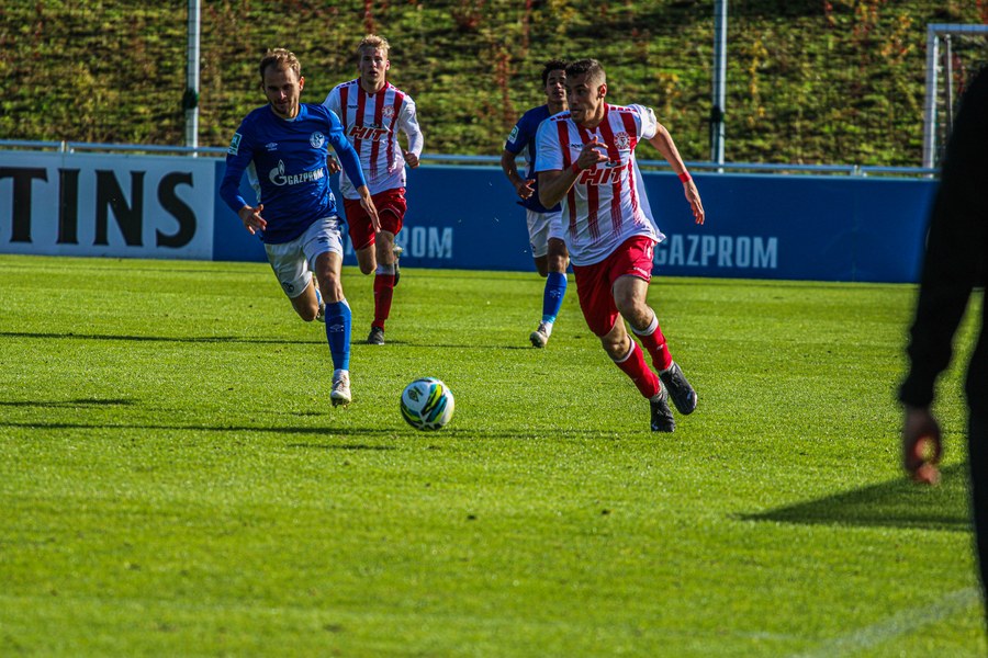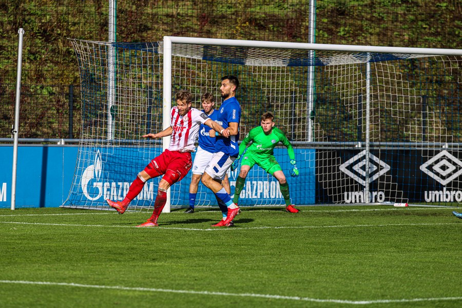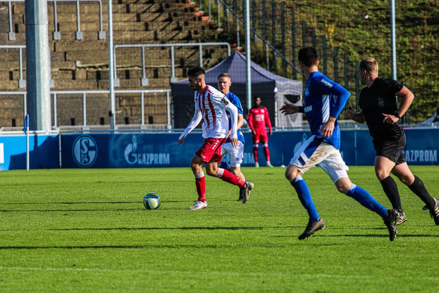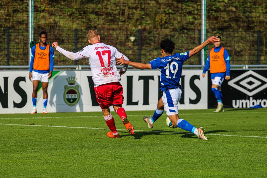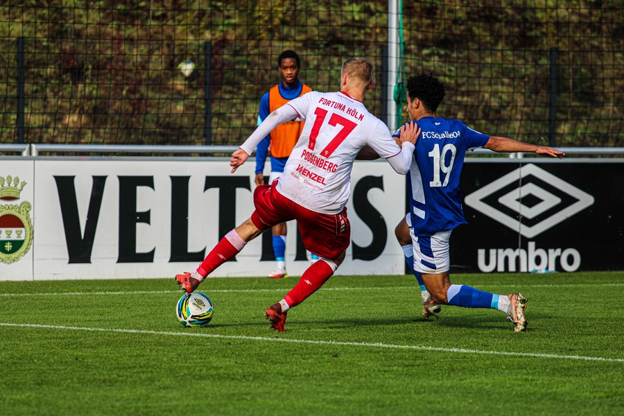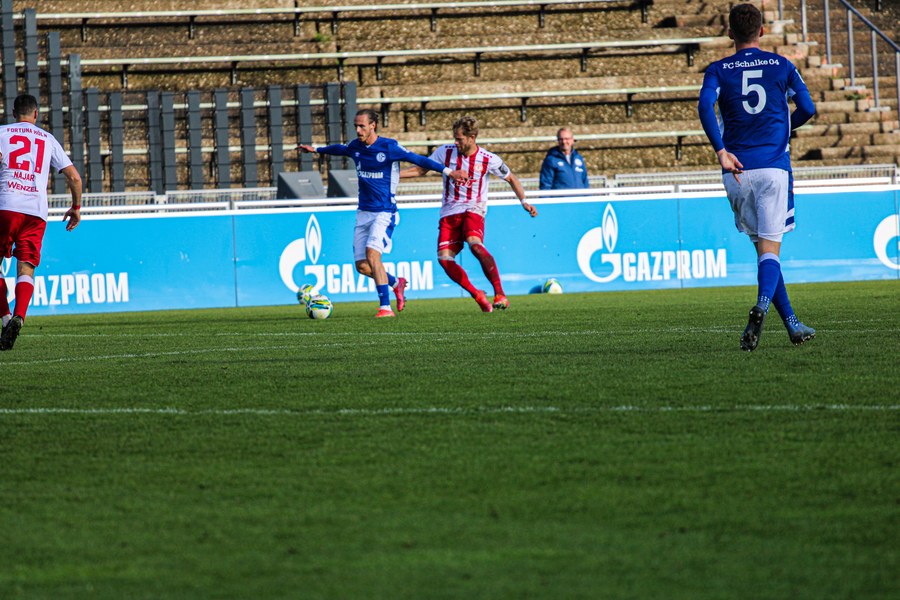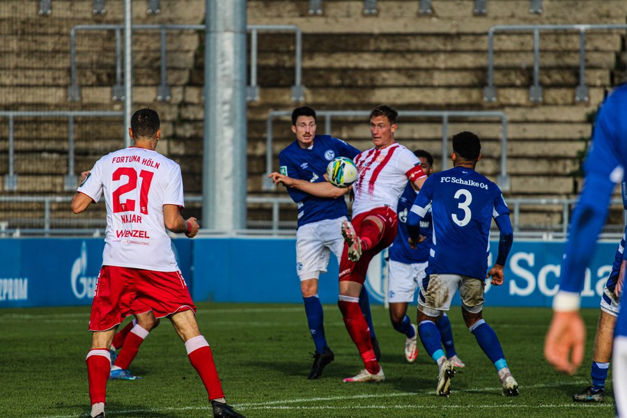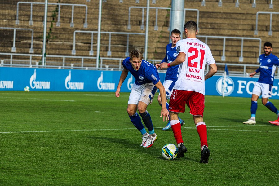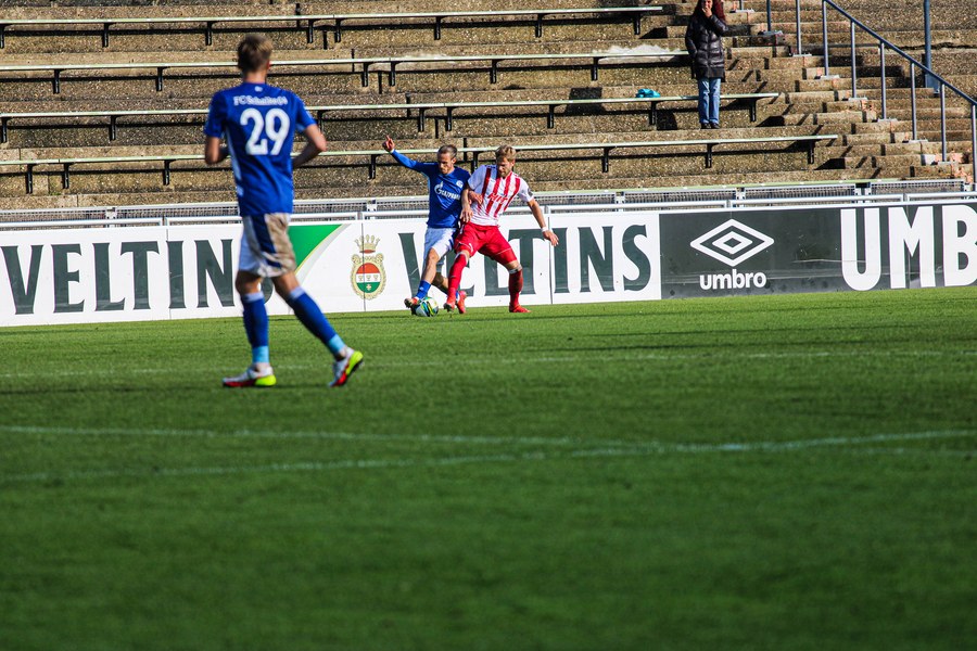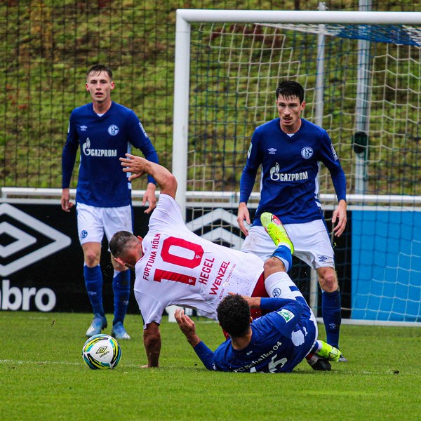 Die Fortuna startete mit viel Ballbesitz in die Partie und konnte das Spiel größten Teils in der gegnerischen Hälfte halten. Bereits in der 4.Minute der Partie erhielten die Kölner einen Freistoß. Der Ball kam zentral in den Sechzehner und Dieckmann versuchte den ersten Ball aufs Tor mit dem Kopf zu verlängern. Allerdings war der Schalker Torwart Felix Wienland zu Stelle. Nach knapp zehn Minuten befanden sich die Schalker erstmals in der tiefen Hälfte der Südstädter und versuchten zum Tor durchzukommen. Maik Kegel konnte den Ball jedoch vorerst für die Kölner klären. Die Kölner konnten das Spiel schnell wieder auf die andere Seite verlagern und Dieckmann probierte es im Alleingang. Er setzte sich auf Höhe des Sechzehners gegen zwei Schalker Gegenspieler durch und schoss aus der Distanz aufs Tor. Der Ball flog gut, doch der Schalker Keeper war zu Stelle und parierte zur Ecke für die Südstädter (12.Minute). Im weiteren Spielverlauf versuchte die Fortunen das Spiel in der gegnerischen Hälfte zu halten, doch die großen Torchancen blieben aus. Owusu versuchte es nach Ballgewinn im Alleingang durch die Mitte. Kurz vor dem Tor kam er zum Schuss doch der Torwart war da und klärte zu einer weiteren Ecke für die Kölner. Die Ecke von der rechten Seite kam zentral in den Sechszehner und Löhden verlängerte mit dem Kopf. Doch hinter im stand kein Mitspieler, der den Ball verwerten konnte (21.Minute). Kurz drauf waren die Gastgeber im Anmarsch auf das Kölner Tor, doch der Linienrichter hob de Flagge zum Abseits und der Angriffs aufs Tor war damit beendet (27.Minute). In der 35. Minute erspielen sich die Kölner die erste riesige Torchance. Najar passte den Ball auf Marquet, der noch weiter in den Torraum lief und schoss. Doch auch hier war der Torwart wieder zur Stelle und klärt zu Ecke. Auch in den letzten fünf Minuten der ersten Hälfte gaben die Kölner nicht auf und versuchten die noch die Führung zu erzielen. Försterling passte gut 25m vor dem Tor auf Owusu. Dieser lief weiter in den Sechzehner, kam allerdings nicht zum Schuss. Hölscher stand jedoch bereit und versuchte sein Glück, doch der Ball landete in den Händen des Schalker Keepers.