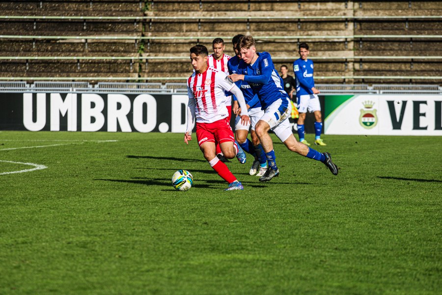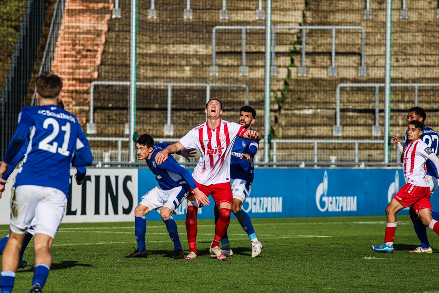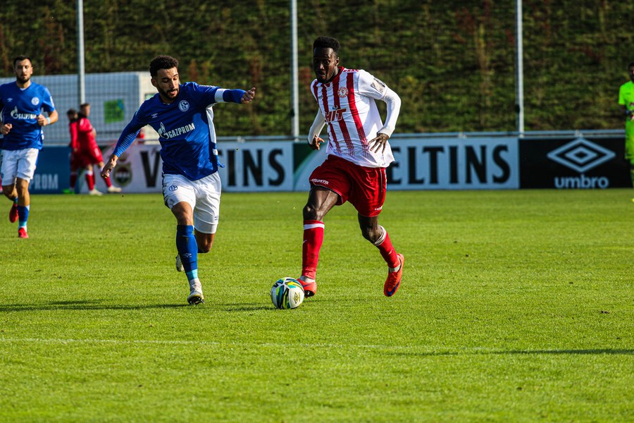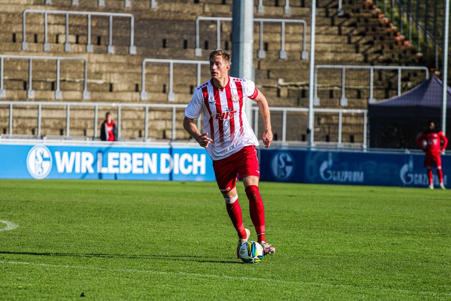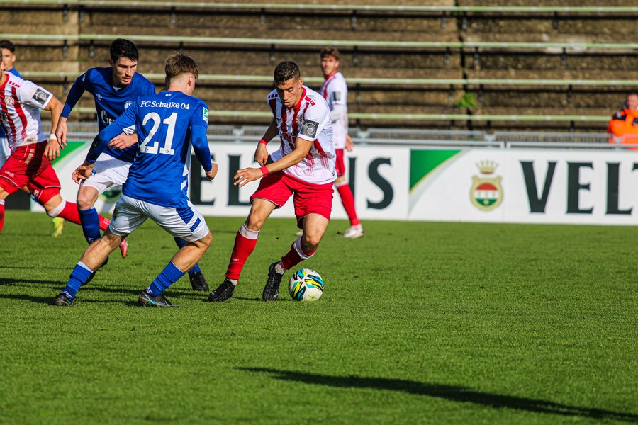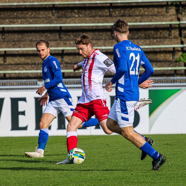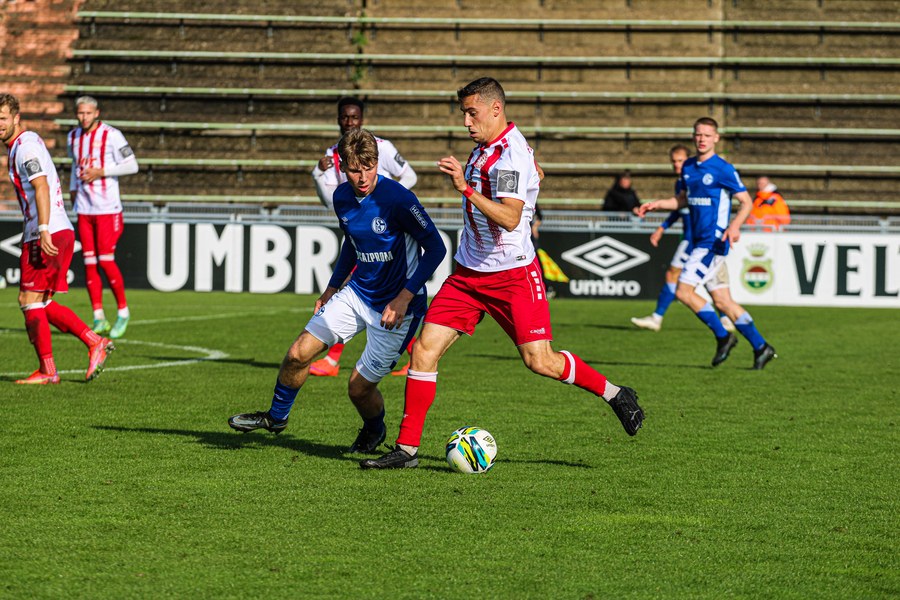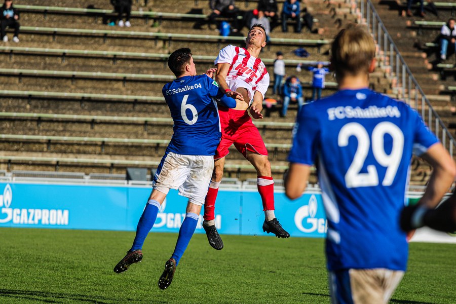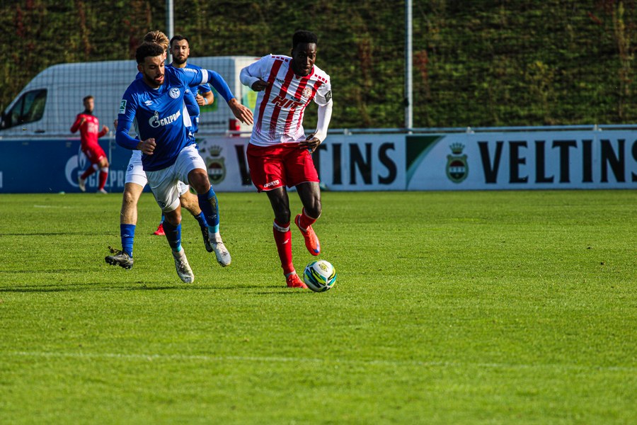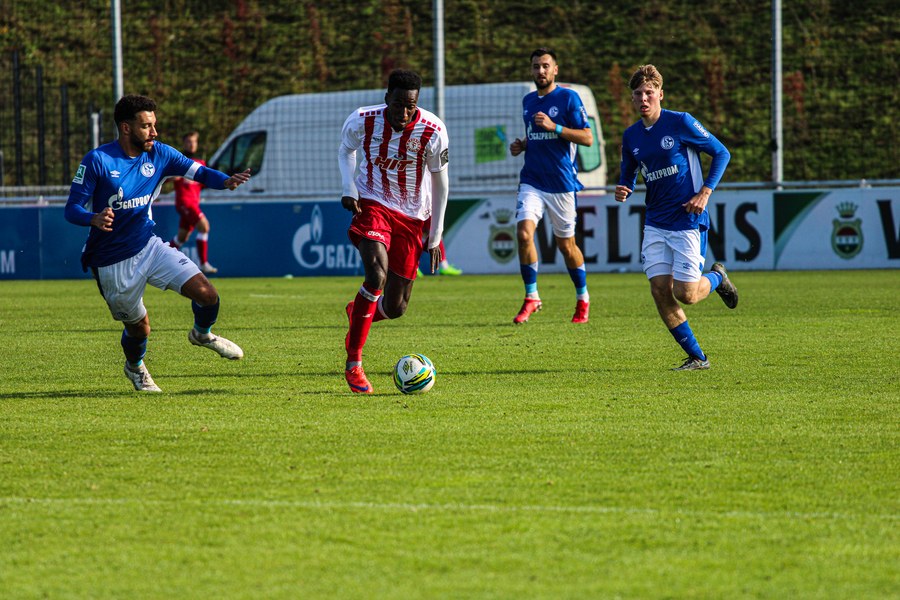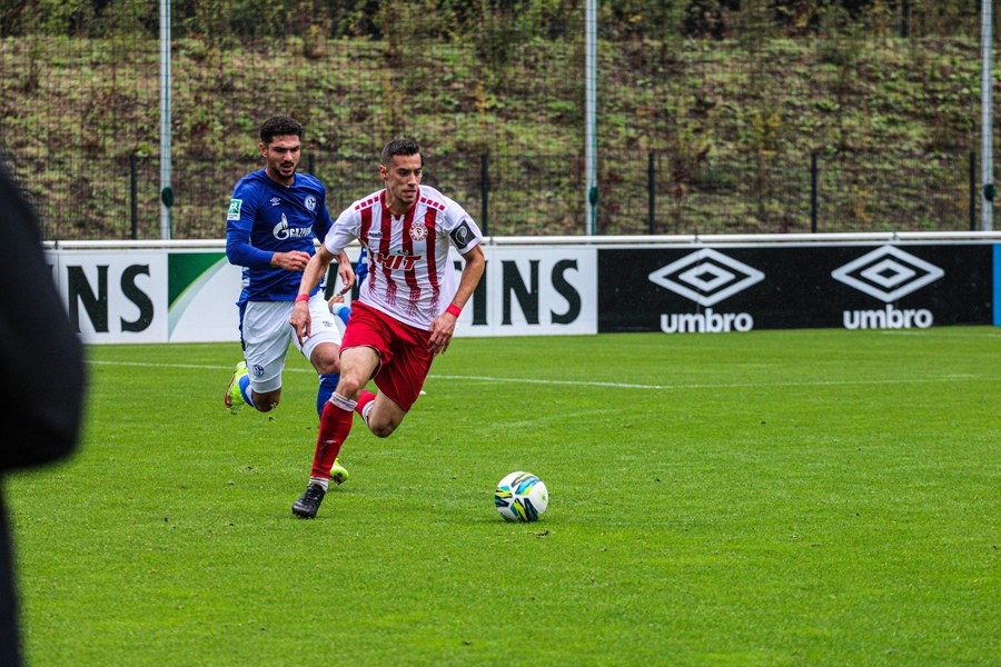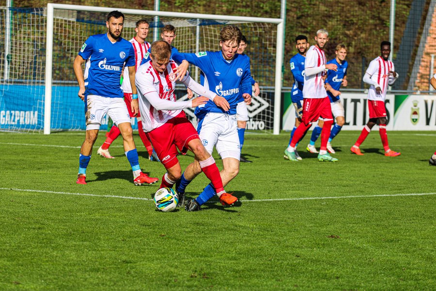 Die Fortuna startete mit viel Ballbesitz in die Partie und konnte das Spiel größten Teils in der gegnerischen Hälfte halten. Bereits in der 4.Minute der Partie erhielten die Kölner einen Freistoß. Der Ball kam zentral in den Sechzehner und Dieckmann versuchte den ersten Ball aufs Tor mit dem Kopf zu verlängern. Allerdings war der Schalker Torwart Felix Wienland zu Stelle. Nach knapp zehn Minuten befanden sich die Schalker erstmals in der tiefen Hälfte der Südstädter und versuchten zum Tor durchzukommen. Maik Kegel konnte den Ball jedoch vorerst für die Kölner klären. Die Kölner konnten das Spiel schnell wieder auf die andere Seite verlagern und Dieckmann probierte es im Alleingang. Er setzte sich auf Höhe des Sechzehners gegen zwei Schalker Gegenspieler durch und schoss aus der Distanz aufs Tor. Der Ball flog gut, doch der Schalker Keeper war zu Stelle und parierte zur Ecke für die Südstädter (12.Minute). Im weiteren Spielverlauf versuchte die Fortunen das Spiel in der gegnerischen Hälfte zu halten, doch die großen Torchancen blieben aus. Owusu versuchte es nach Ballgewinn im Alleingang durch die Mitte. Kurz vor dem Tor kam er zum Schuss doch der Torwart war da und klärte zu einer weiteren Ecke für die Kölner. Die Ecke von der rechten Seite kam zentral in den Sechszehner und Löhden verlängerte mit dem Kopf. Doch hinter im stand kein Mitspieler, der den Ball verwerten konnte (21.Minute). Kurz drauf waren die Gastgeber im Anmarsch auf das Kölner Tor, doch der Linienrichter hob de Flagge zum Abseits und der Angriffs aufs Tor war damit beendet (27.Minute). In der 35. Minute erspielen sich die Kölner die erste riesige Torchance. Najar passte den Ball auf Marquet, der noch weiter in den Torraum lief und schoss. Doch auch hier war der Torwart wieder zur Stelle und klärt zu Ecke. Auch in den letzten fünf Minuten der ersten Hälfte gaben die Kölner nicht auf und versuchten die noch die Führung zu erzielen. Försterling passte gut 25m vor dem Tor auf Owusu. Dieser lief weiter in den Sechzehner, kam allerdings nicht zum Schuss. Hölscher stand jedoch bereit und versuchte sein Glück, doch der Ball landete in den Händen des Schalker Keepers.