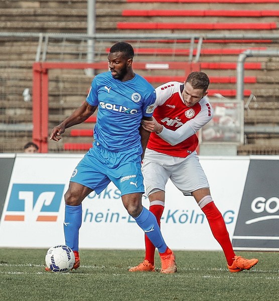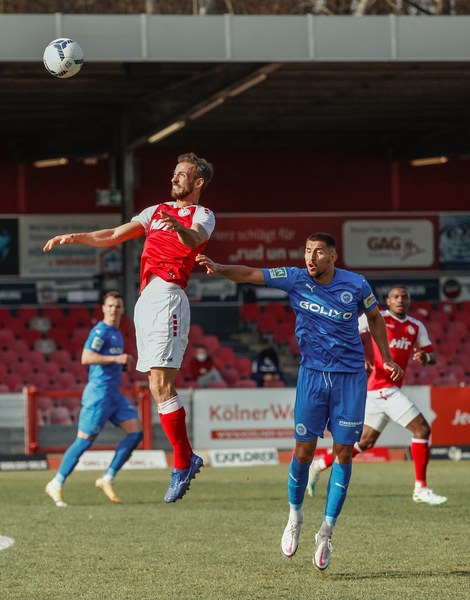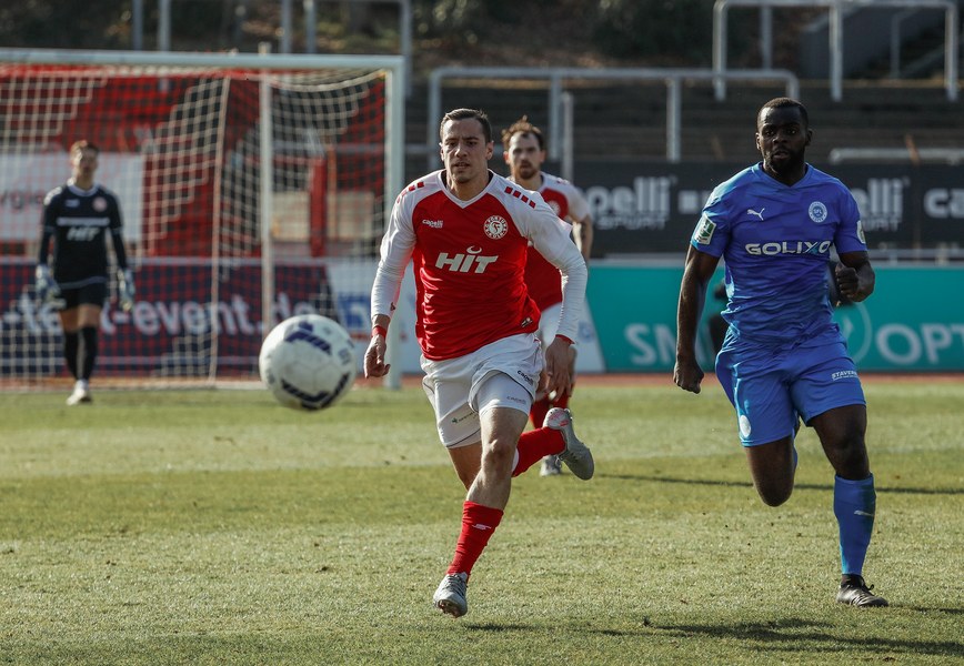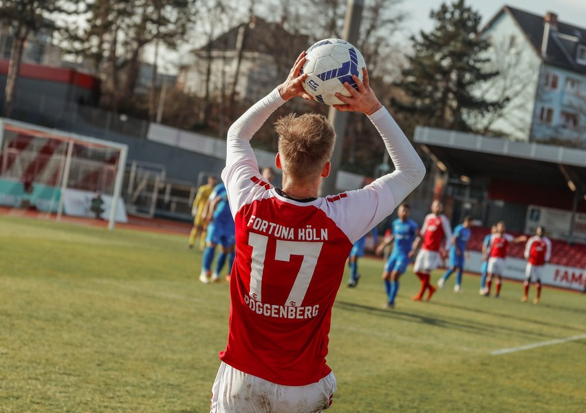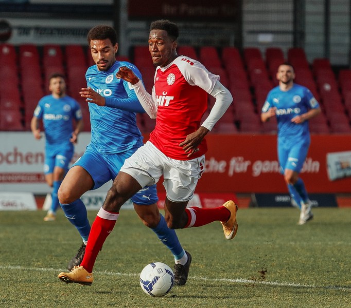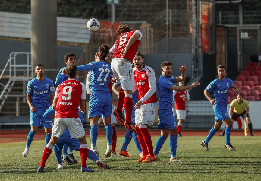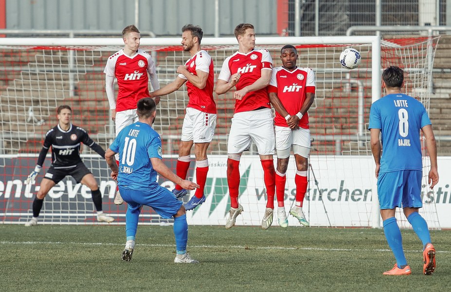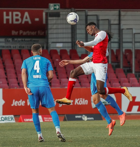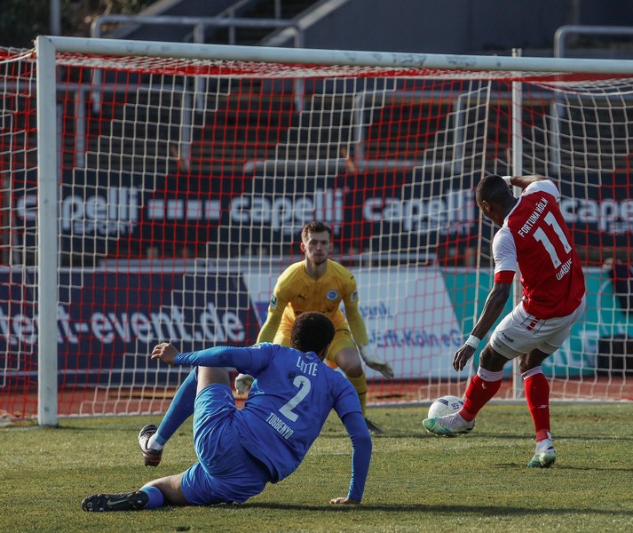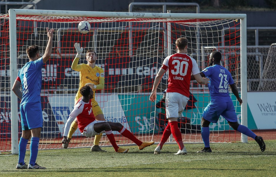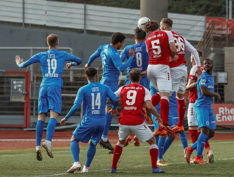 Die Gäste versuchten schon zu Beginn das Spiel der Südstädter früh zu stören und setzten das heutige Innenverteidigerduo, bestehend aus Löhden und Rumpf, bereits bei der Ballannahme unter Druck und wollten die Beiden dadurch zu Fehlern zwingen. Rumpf startete unglücklich in die Partie und verlor in der Vorwärtsbewegung den Ball. Itter kam in der Folge zu spät und konnte den vorangegangenen individuellen Fehler nicht mehr ausbügeln. Der Lotter Spielführer konnte aus der Situation nichts erfolgsbringendes machen und verfehlte das Tor deutlich (3. Min.). So gibt es Abstoß für Fortuna. Die erste Viertelstunde war in Sachen Torraumszenen sehr ereignisarm. Das frühe Anlaufverhalten beider Teams, brachte beide Mannschaften dazu, das Spiel über die Abwehrreihen zu fokussieren und das Spiel in die Breite ziehen zu wollen. Bälle in die Tiefe sind nur all zu selten. Nach 17 gespielten Minuten gab der Gast den ersten Schuss ab. Drilon Demaj kam über die rechte Seite der Gäste zum Abschluss, setzte den Ball jedoch einige Meter rechts am Kasten von Rauhut vorbei. Quasi im Gegenzug kam die Fortuna zu ihrem ersten Torabschluss und dieser landete direkt im Tor von Gästetorhüter Peitzmeier. Roman Prokoph schirmte zunächst kurz vor dem Sechzehner bärenstark den Ball gegen den Innenverteidiger der Gäste ab und legte dann den Ball auf Maik Kegel ab. Dieser sah den in den freien Raum starteten Najar und schickte ihn auf die Reise. Najar blieb vor dem Tor eiskalt und versenkte den Ball rechts an Peitzmeier vorbei zum umjubelten 1:0 Führungstreffer (18.Minute). Fortan nahm das Spiel an Fahrt auf und der Ball durchquerte nun öfter beide Strafräume. Eine gefährlich herausgespielte Aktion konnte in der 28. Minute Dan-Patrick Poggenberg verhindern, indem er seinen Fuß dazwischen hielt und somit das fast sichere 1:1 abwehrte. Nach 35 Minuten kam es noch einmal zu einer Chance für die Fortuna. Timo Hölscher setzte im Mittelfeld nach einem Ballverlust gut nach und eroberte den Ball postwendend zurück. Auf der linken Außenbahn sah er dann den freien Francis Ubabuike welcher sich zunächst gut durchsetzte und per Flanke den Ball zurück auf Hölscher brachte. Hölscher bekam jedoch nicht genügend Druck hinter den Ball und köpfte dem Gästekeeper in die Arme. Die Halbzeit nutzte Trainer Alexander Ende für gleich drei Wechsel. Owusu kam für Salman, Ochojski ersetzte Itter und Lanius betrat für Kegel den Platz, ordnete sich allerdings in die Viererkette ein, so dass Rumpf auf die Position von Kegel vorrückte. Poggenberg drang über die linke Seite in die gefährliche Zone der Gäste und holte mit seinem Vorstoß die erste Ecke für Fortuna Köln heraus. Die von Najar ausgeführte Ecke brachte Gefahr mit sich. Lanius köpfte den Ball in Richtung oberes, linkes Toreck, wo Owusu zwar bereitstand, aber nicht mehr an den Ball drankam. Die Situation wurde aber sofort abgepfiffen, da Owusu dem Torwart die Sicht nahm und sich somit im passiven Abseits befand. Eine vielversprechende Möglichkeit gab es für die Fortuna dann in Form einer Doppelchance. Erst setzt sich Ubabuike gut durch und suchte dann den Abschluss, Peitzmeier pariert den Ball, der auf den Torwart platziert war, aber der Ball fiel anschließend Torschütze Najar vor die Füße, dessen Nachschuss er ebenfalls abwehren konnte, ehe die Gäste den Ball aus der Gefahrenzone entfernen konnten. (54.) Die Gäste aus Lotte kamen immer wieder zu nennenswerten Offensivaktionen, die nicht immer von der Fortuna geklärt werden konnte. So spielte sich Lotte in der 56. Minute um den Kölner Sechzehner, wo Demaj erneut zum Abschluss kam, Rauhut aber rechtzeitig zur Ecke abwehrte. Ochojski köpfte anschließend den Ball hinter heraus, aber an der Strafraumkante wird in aussichtsreicher Position ein Freistoß verursacht. Dieser wurde gefühlvoll in die untere linke Ecke platziert, aber Rauhut zeigt eine unglaublich starke Parade und wehrt den Ball zur Ecke ab. Bei der Aktion verletze sich der Fortuna Torhüter und musste nach einer kurzen Behandlung doch verletzt ausgewechselt werden. Schünemann stellte sich für ihn zwischen die Pfosten und ersetze ihn für die restliche Spielzeit. In der 65. Minute passierte dann das, was sich in den vorangegangenen Minuten bereits abgezeichnet hatte. Lotte wurde in ihrem Angriffsspiel nicht entscheidend genug angegriffen, was dazu führte, dass der stark aufspielende Demaj vor Schünemann zum Abschluss kam und den Ball gekonnt an ihm vorbeischob. Auf den erzielten Ausgleichstreffer hatte die Fortuna dann aber die richtige Reaktion gezeigt. Ochojski zeigte Entschlossenheit, als er sich ein Herz fasste und zum Dribbling ansetze, bevor er den Ball an Hölscher übergab. Der spielte den Ball auf die linke Außenbahn zu Ubabuike, der mittels einer flachen Hereingabe Prokoph in Szene setze. Der schön vorgeführte Angriff wurde nicht mit einem Tor belohnt. Aber die Fortuna setzte nach und wollte die Führung wieder herstellen. Najar wurde im gegnerischen Strafraum freigespielt, zögerte nicht lange und zog ab. Sein Schuss wird erst noch abgeblockt, wodurch sich die Flugrichtung des Balles noch undankbar für den gegnerischen Torwart verändert. So hüpfte der Ball in das rechte Eck des Lotter Kastens und Najar schnürte seinen Doppelpack. Die Sportfreunde aus Lotte wollten unbedingt einen Punkt aus der Kölner Südstadt mitnehmen, das war ihrer Bemühungen deutlich anzumerken. In der 79. Minute rettete dann der Pfosten für die Fortuna. Schünemann musste beinahe wieder hinter sich greifen, aber der Pfosten half ihm dabei, dass der Ausgleich zunächst noch verhindert werden konnte. Das Spiel wurde jetzt immer spannender und packender. Najar hatte sogar noch die Möglichkeit einen Hattrick zu erzielen. Zuvor hatte Owusu einen wichtigen Kopfball an der Mittellinie gewonnen, womit er Najar in den Lauf vorlegte. Der Torschütze sprintete auf das Tor zu und schloss kurz vor dem Tor selber ab, aber visierte dabei den ge