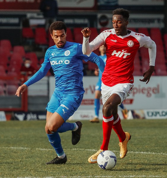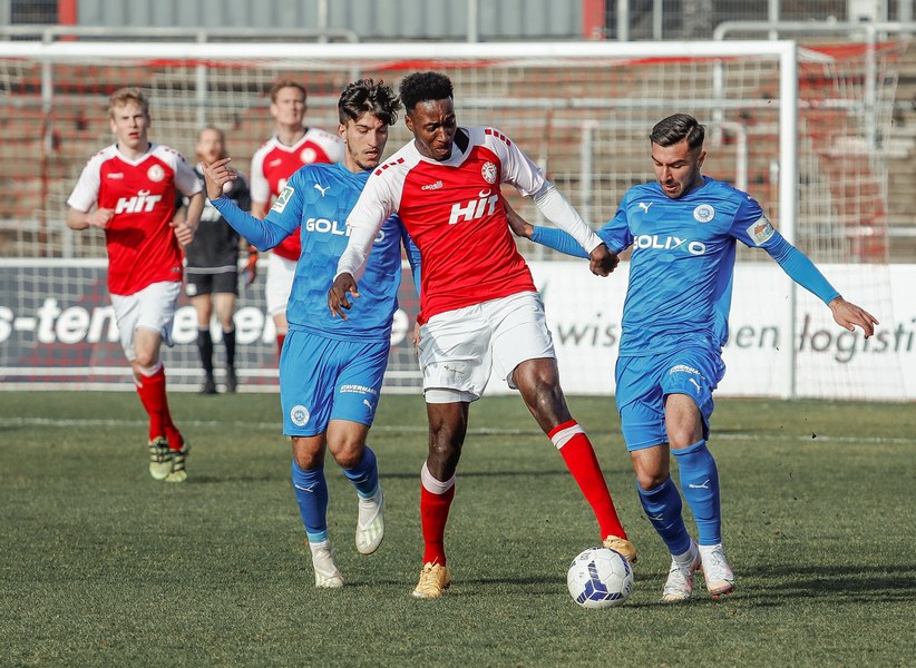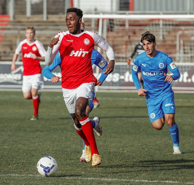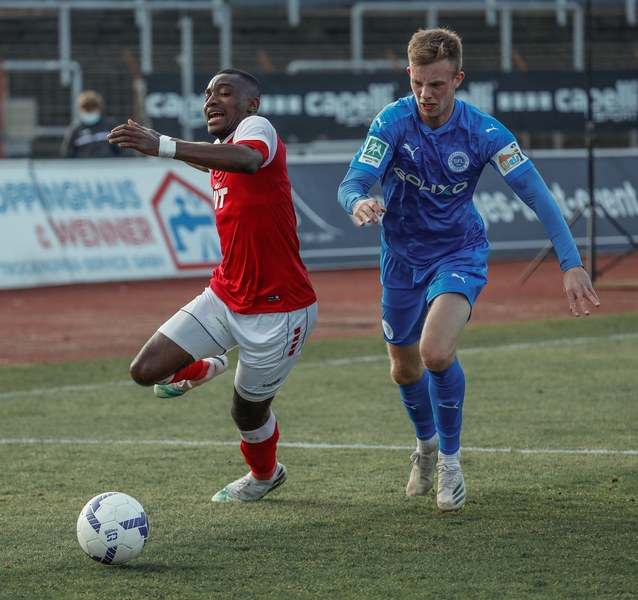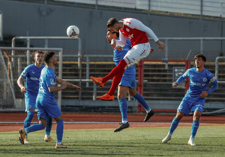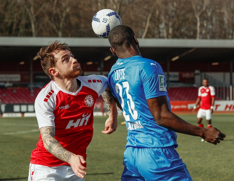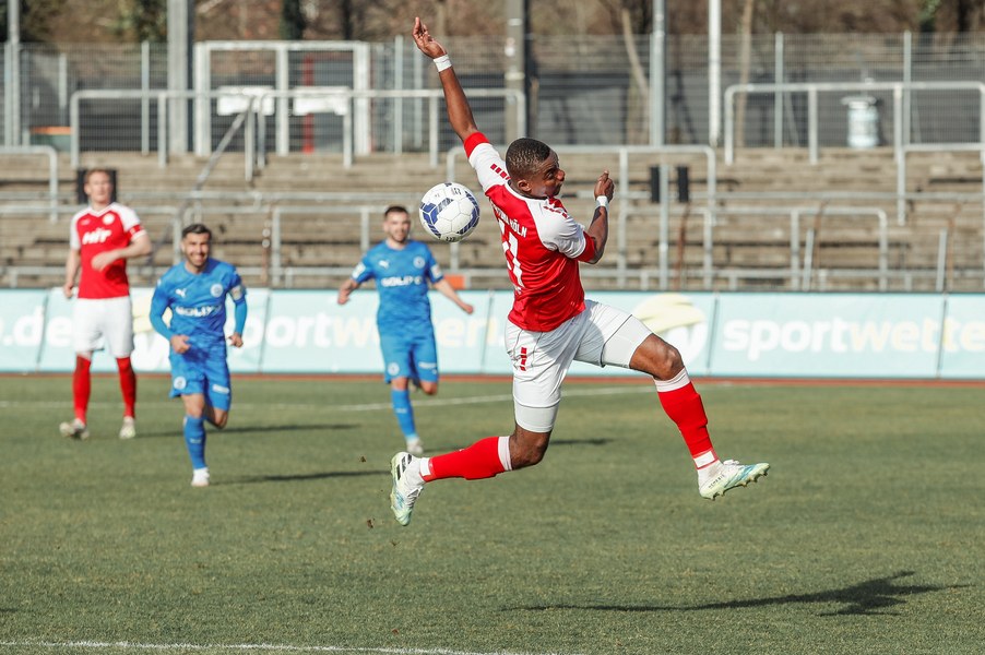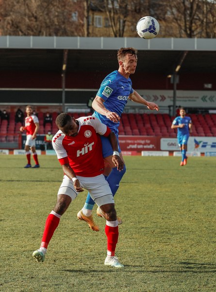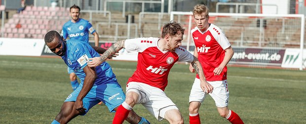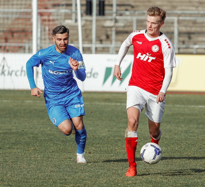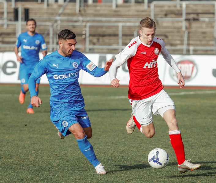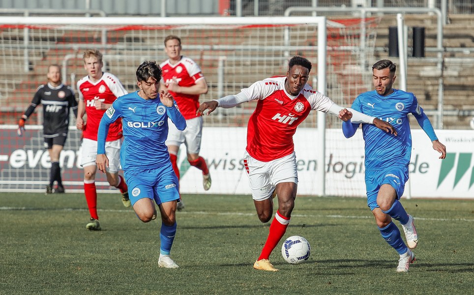 Die Gäste versuchten schon zu Beginn das Spiel der Südstädter früh zu stören und setzten das heutige Innenverteidigerduo, bestehend aus Löhden und Rumpf, bereits bei der Ballannahme unter Druck und wollten die Beiden dadurch zu Fehlern zwingen. Rumpf startete unglücklich in die Partie und verlor in der Vorwärtsbewegung den Ball. Itter kam in der Folge zu spät und konnte den vorangegangenen individuellen Fehler nicht mehr ausbügeln. Der Lotter Spielführer konnte aus der Situation nichts erfolgsbringendes machen und verfehlte das Tor deutlich (3. Min.). So gibt es Abstoß für Fortuna. Die erste Viertelstunde war in Sachen Torraumszenen sehr ereignisarm. Das frühe Anlaufverhalten beider Teams, brachte beide Mannschaften dazu, das Spiel über die Abwehrreihen zu fokussieren und das Spiel in die Breite ziehen zu wollen. Bälle in die Tiefe sind nur all zu selten. Nach 17 gespielten Minuten gab der Gast den ersten Schuss ab. Drilon Demaj kam über die rechte Seite der Gäste zum Abschluss, setzte den Ball jedoch einige Meter rechts am Kasten von Rauhut vorbei. Quasi im Gegenzug kam die Fortuna zu ihrem ersten Torabschluss und dieser landete direkt im Tor von Gästetorhüter Peitzmeier. Roman Prokoph schirmte zunächst kurz vor dem Sechzehner bärenstark den Ball gegen den Innenverteidiger der Gäste ab und legte dann den Ball auf Maik Kegel ab. Dieser sah den in den freien Raum starteten Najar und schickte ihn auf die Reise. Najar blieb vor dem Tor eiskalt und versenkte den Ball rechts an Peitzmeier vorbei zum umjubelten 1:0 Führungstreffer (18.Minute). Fortan nahm das Spiel an Fahrt auf und der Ball durchquerte nun öfter beide Strafräume. Eine gefährlich herausgespielte Aktion konnte in der 28. Minute Dan-Patrick Poggenberg verhindern, indem er seinen Fuß dazwischen hielt und somit das fast sichere 1:1 abwehrte. Nach 35 Minuten kam es noch einmal zu einer Chance für die Fortuna. Timo Hölscher setzte im Mittelfeld nach einem Ballverlust gut nach und eroberte den Ball postwendend zurück. Auf der linken Außenbahn sah er dann den freien Francis Ubabuike welcher sich zunächst gut durchsetzte und per Flanke den Ball zurück auf Hölscher brachte. Hölscher bekam jedoch nicht genügend Druck hinter den Ball und köpfte dem Gästekeeper in die Arme. Die Halbzeit nutzte Trainer Alexander Ende für gleich drei Wechsel. Owusu kam für Salman, Ochojski ersetzte Itter und Lanius betrat für Kegel den Platz, ordnete sich allerdings in die Viererkette ein, so dass Rumpf auf die Position von Kegel vorrückte. Poggenberg drang über die linke Seite in die gefährliche Zone der Gäste und holte mit seinem Vorstoß die erste Ecke für Fortuna Köln heraus. Die von Najar ausgeführte Ecke brachte Gefahr mit sich. Lanius köpfte den Ball in Richtung oberes, linkes Toreck, wo Owusu zwar bereitstand, aber nicht mehr an den Ball drankam. Die Situation wurde aber sofort abgepfiffen, da Owusu dem Torwart die Sicht nahm und sich somit im passiven Abseits befand. Eine vielversprechende Möglichkeit gab es für die Fortuna dann in Form einer Doppelchance. Erst setzt sich Ubabuike gut durch und suchte dann den Abschluss, Peitzmeier pariert den Ball, der auf den Torwart platziert war, aber der Ball fiel anschließend Torschütze Najar vor die Füße, dessen Nachschuss er ebenfalls abwehren konnte, ehe die Gäste den Ball aus der Gefahrenzone entfernen konnten. (54.) Die Gäste aus Lotte kamen immer wieder zu nennenswerten Offensivaktionen, die nicht immer von der Fortuna geklärt werden konnte. So spielte sich Lotte in der 56. Minute um den Kölner Sechzehner, wo Demaj erneut zum Abschluss kam, Rauhut aber rechtzeitig zur Ecke abwehrte. Ochojski köpfte anschließend den Ball hinter heraus, aber an der Strafraumkante wird in aussichtsreicher Position ein Freistoß verursacht. Dieser wurde gefühlvoll in die untere linke Ecke platziert, aber Rauhut zeigt eine unglaublich starke Parade und wehrt den Ball zur Ecke ab. Bei der Aktion verletze sich der Fortuna Torhüter und musste nach einer kurzen Behandlung doch verletzt ausgewechselt werden. Schünemann stellte sich für ihn zwischen die Pfosten und ersetze ihn für die restliche Spielzeit. In der 65. Minute passierte dann das, was sich in den vorangegangenen Minuten bereits abgezeichnet hatte. Lotte wurde in ihrem Angriffsspiel nicht entscheidend genug angegriffen, was dazu führte, dass der stark aufspielende Demaj vor Schünemann zum Abschluss kam und den Ball gekonnt an ihm vorbeischob. Auf den erzielten Ausgleichstreffer hatte die Fortuna dann aber die richtige Reaktion gezeigt. Ochojski zeigte Entschlossenheit, als er sich ein Herz fasste und zum Dribbling ansetze, bevor er den Ball an Hölscher übergab. Der spielte den Ball auf die linke Außenbahn zu Ubabuike, der mittels einer flachen Hereingabe Prokoph in Szene setze. Der schön vorgeführte Angriff wurde nicht mit einem Tor belohnt. Aber die Fortuna setzte nach und wollte die Führung wieder herstellen. Najar wurde im gegnerischen Strafraum freigespielt, zögerte nicht lange und zog ab. Sein Schuss wird erst noch abgeblockt, wodurch sich die Flugrichtung des Balles noch undankbar für den gegnerischen Torwart verändert. So hüpfte der Ball in das rechte Eck des Lotter Kastens und Najar schnürte seinen Doppelpack. Die Sportfreunde aus Lotte wollten unbedingt einen Punkt aus der Kölner Südstadt mitnehmen, das war ihrer Bemühungen deutlich anzumerken. In der 79. Minute rettete dann der Pfosten für die Fortuna. Schünemann musste beinahe wieder hinter sich greifen, aber der Pfosten half ihm dabei, dass der Ausgleich zunächst noch verhindert werden konnte. Das Spiel wurde jetzt immer spannender und packender. Najar hatte sogar noch die Möglichkeit einen Hattrick zu erzielen. Zuvor hatte Owusu einen wichtigen Kopfball an der Mittellinie gewonnen, womit er Najar in den Lauf vorlegte. Der Torschütze sprintete auf das Tor zu und schloss kurz vor dem Tor selber ab, aber visierte dabei den ge