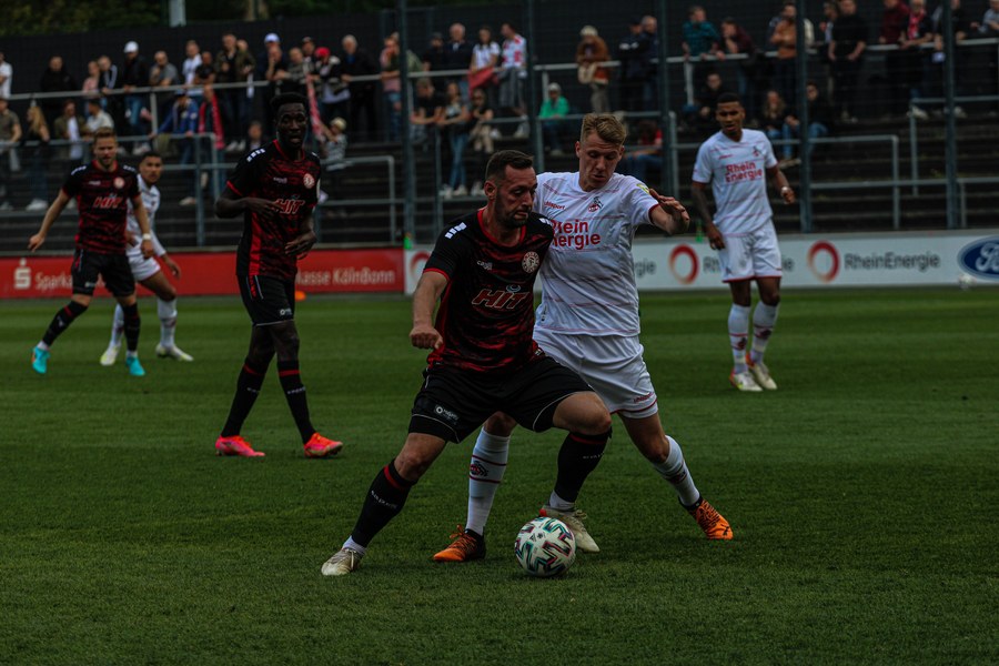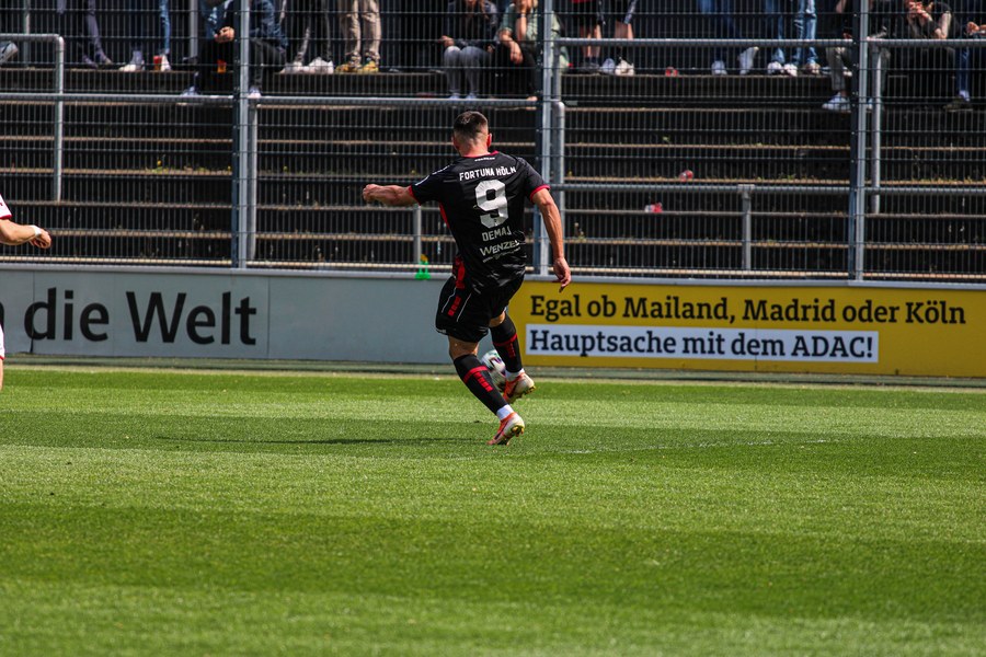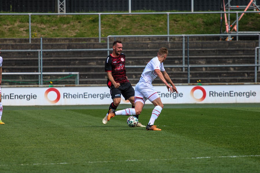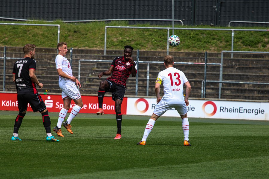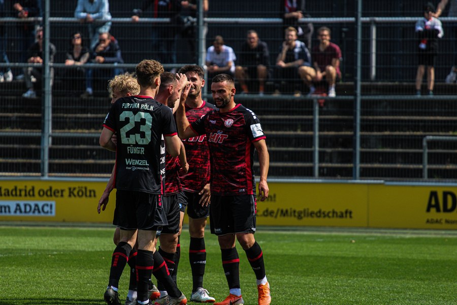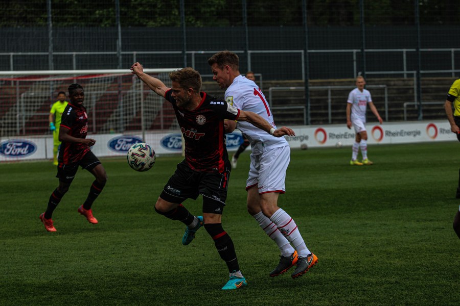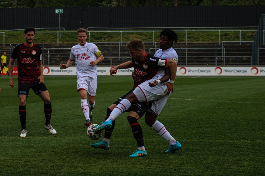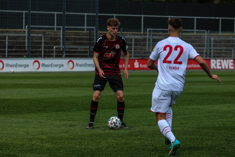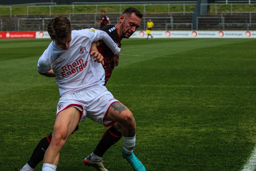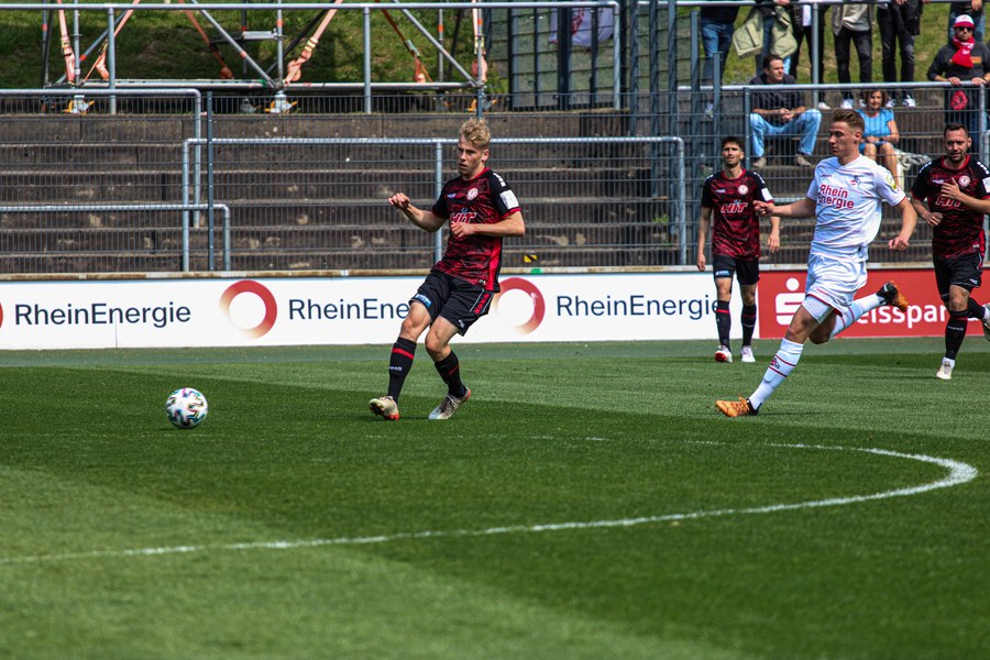 Die Fortuna ging ohne einen weiteren Wechsel in den zweiten Durchgang und machte dort weiter, wo sie vor dem Halbzeitpfiff aufgehört hatten. So hätten sie unmittelbar nach Wiederbeginn die Führung ausbauen können. Über die rechte Seite arbeiteten sich die Fortunen nach vorne. Mike Owusu legte den Ball auf den in der Mitte stehenden Sascha Marquet ab. Dieser schoss den Ball flach ins Tor, doch sein Treffer wurde als Abseitstor gewertet. Auch weiterhin blieb die Partie spannend. Immer wieder kam die Fortuna zu Abschlüssen, doch für ein weiteres Tor reichte es zunächst nicht. In der 61. Minute steckte Maik Kegel, nach einem Pass von Jannik Löhden, den Ball auf Sascha Marquet durch. Er drang hinter die Abwehr der Geißböcke und ließ Jonas Urbing mit seinem Torschuss keine Chance. Doch für den FC war das Spiel noch nicht gegessen und sie bauten immer weiter viel Druck auf die Fortunaspieler auf. Nach einer Ecke wurde der Ball zunächst von den Südstädter entschärft blieb jedoch in den Reihen des FC. David Winke traf mit seinem Schuss aus der Distanz den Pfosten. Hendrik Mittestädt konnte das abgeprallte Spielgerät verwerten und verkürzte auf 1:2 (67.Min). Knapp zehn Minuten später kamen die Geißböcke dem Tor der Fortuna wieder sehr nahe. Nach einer Flanke bekam Mittelstädt den Ball von Ricardo-Oliver Henning quer gelegt und erzielte den Ausgleichstreffer. Kurz darauf versuchte die Fortuna nach einem starken Spielzug von Najar und Batarilo nachzulegen, doch Demaj verfehlte das Tor, nach dem Zuspiel, denkbar knapp. Der Fortuna gelang es trotz vieler Versuche in den letzten Minuten nicht mehr, den vermeintlichen Siegestreffer im Stadtduell zu erzielen.