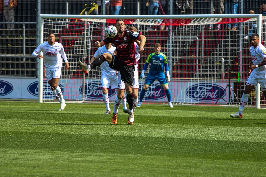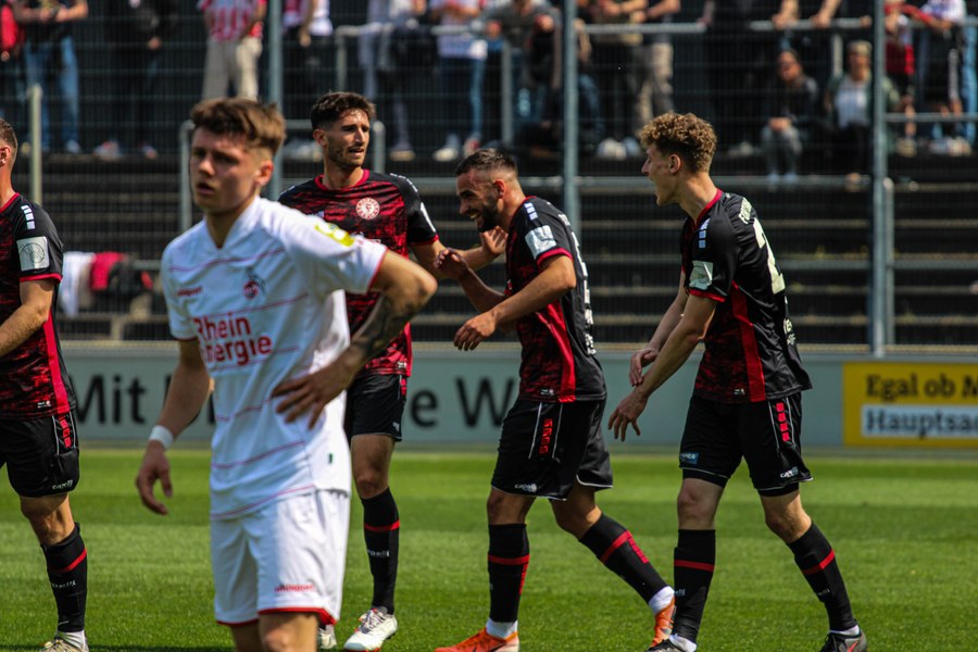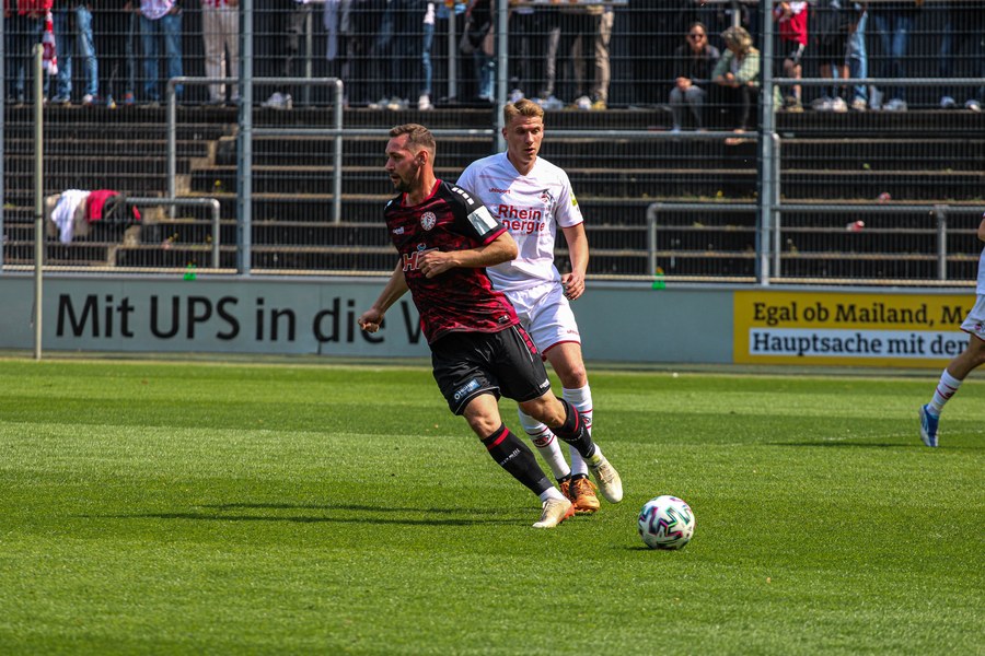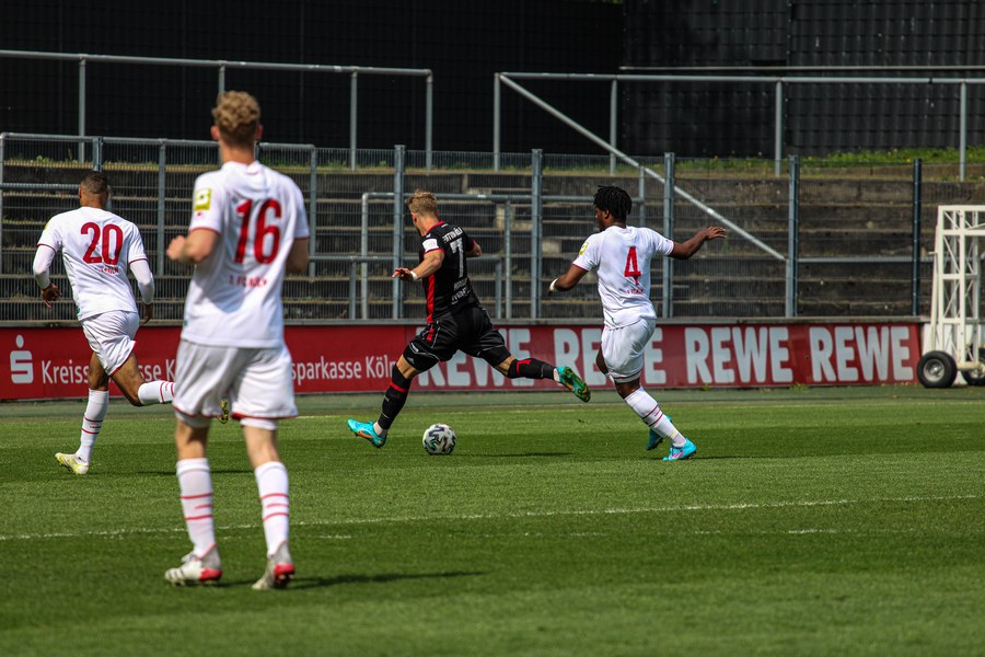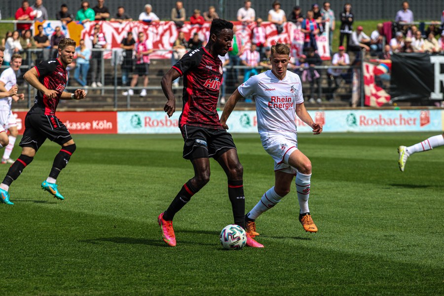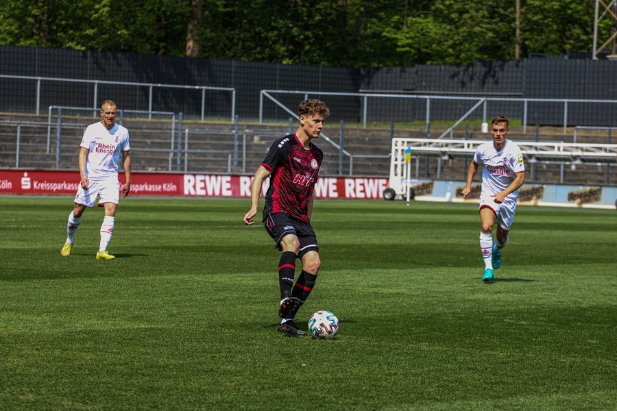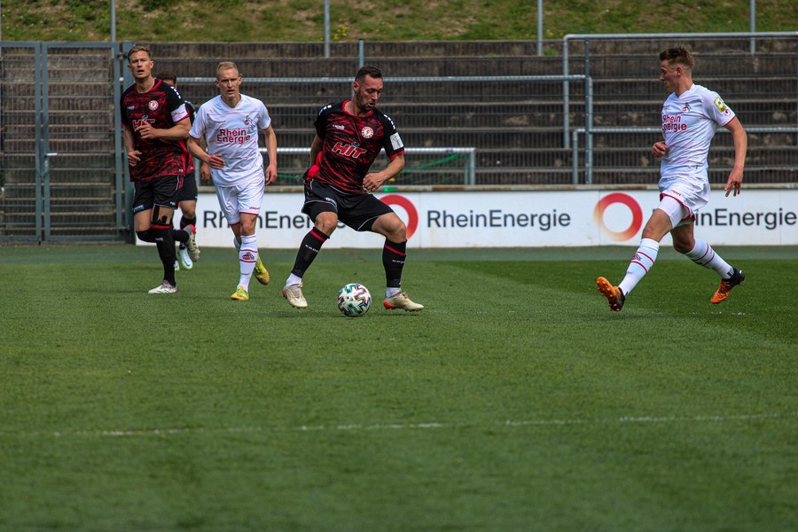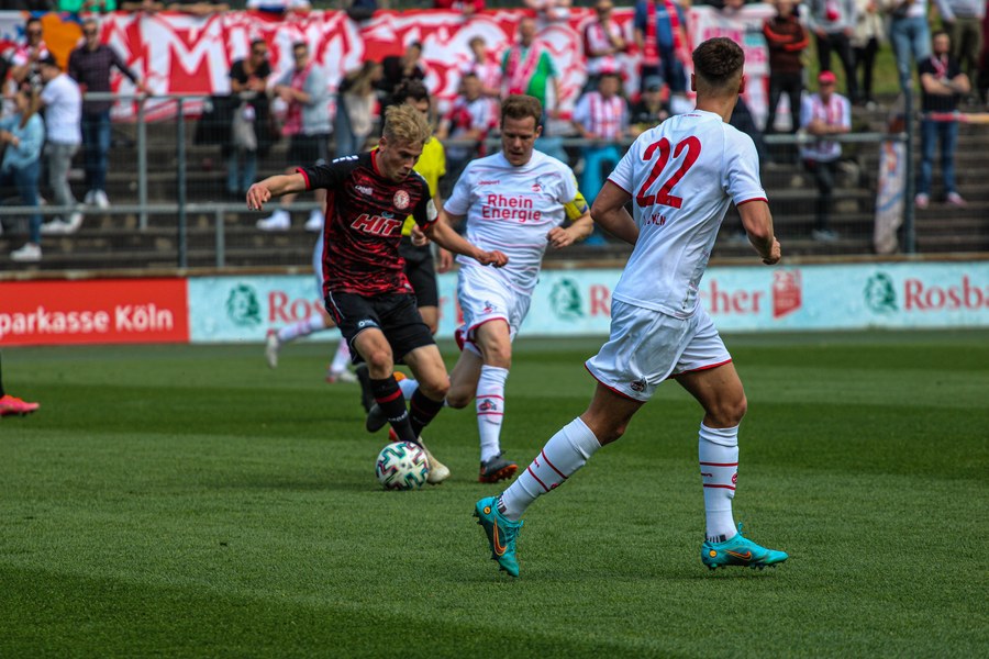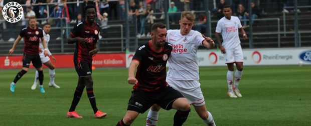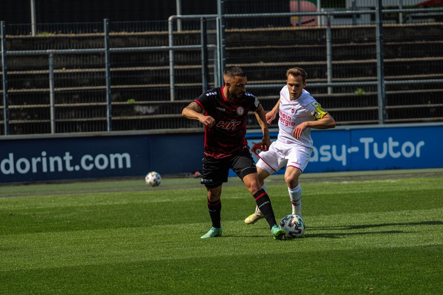 Die Fortuna ging ohne einen weiteren Wechsel in den zweiten Durchgang und machte dort weiter, wo sie vor dem Halbzeitpfiff aufgehört hatten. So hätten sie unmittelbar nach Wiederbeginn die Führung ausbauen können. Über die rechte Seite arbeiteten sich die Fortunen nach vorne. Mike Owusu legte den Ball auf den in der Mitte stehenden Sascha Marquet ab. Dieser schoss den Ball flach ins Tor, doch sein Treffer wurde als Abseitstor gewertet. Auch weiterhin blieb die Partie spannend. Immer wieder kam die Fortuna zu Abschlüssen, doch für ein weiteres Tor reichte es zunächst nicht. In der 61. Minute steckte Maik Kegel, nach einem Pass von Jannik Löhden, den Ball auf Sascha Marquet durch. Er drang hinter die Abwehr der Geißböcke und ließ Jonas Urbing mit seinem Torschuss keine Chance. Doch für den FC war das Spiel noch nicht gegessen und sie bauten immer weiter viel Druck auf die Fortunaspieler auf. Nach einer Ecke wurde der Ball zunächst von den Südstädter entschärft blieb jedoch in den Reihen des FC. David Winke traf mit seinem Schuss aus der Distanz den Pfosten. Hendrik Mittestädt konnte das abgeprallte Spielgerät verwerten und verkürzte auf 1:2 (67.Min). Knapp zehn Minuten später kamen die Geißböcke dem Tor der Fortuna wieder sehr nahe. Nach einer Flanke bekam Mittelstädt den Ball von Ricardo-Oliver Henning quer gelegt und erzielte den Ausgleichstreffer. Kurz darauf versuchte die Fortuna nach einem starken Spielzug von Najar und Batarilo nachzulegen, doch Demaj verfehlte das Tor, nach dem Zuspiel, denkbar knapp. Der Fortuna gelang es trotz vieler Versuche in den letzten Minuten nicht mehr, den vermeintlichen Siegestreffer im Stadtduell zu erzielen.