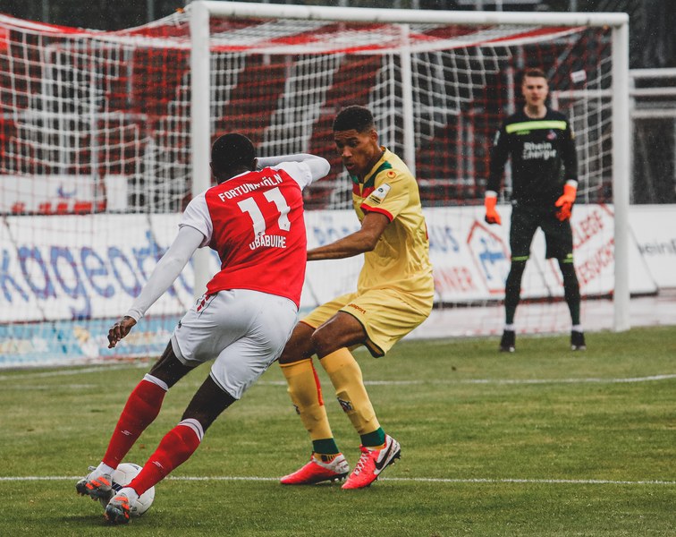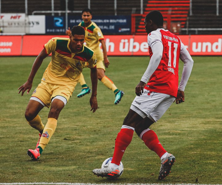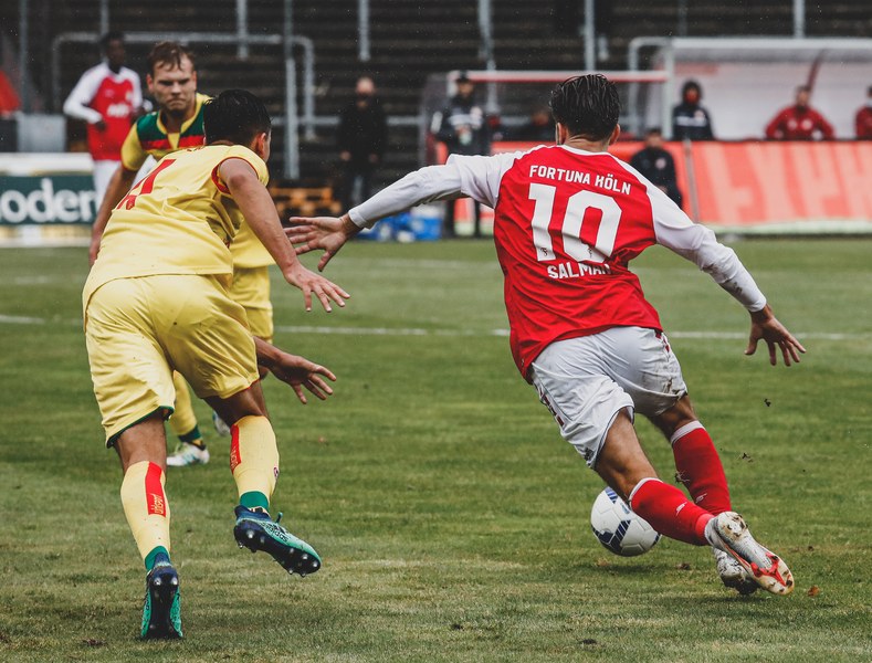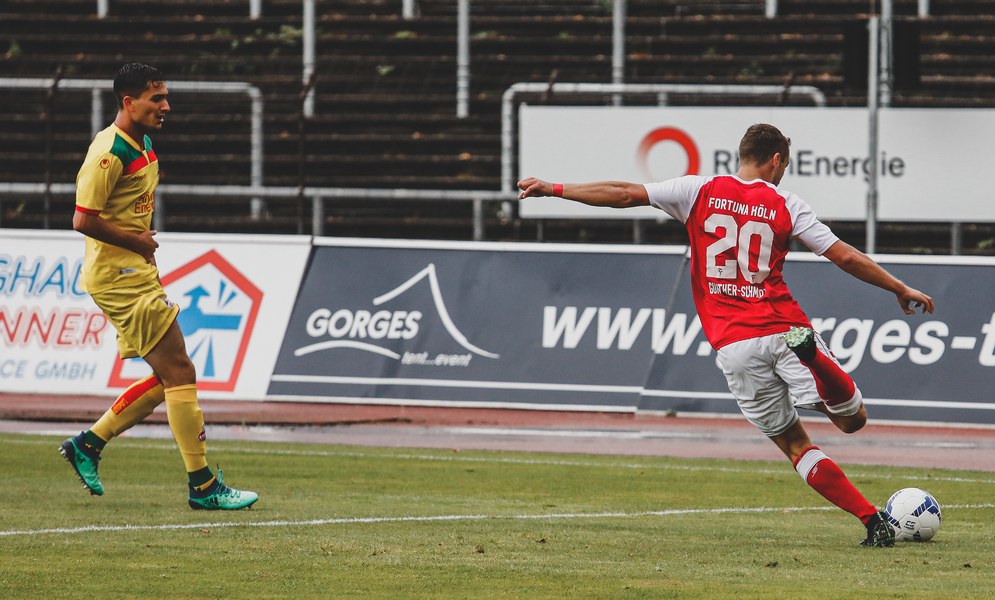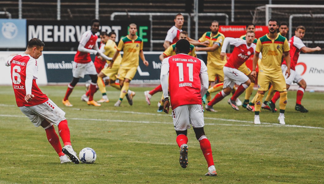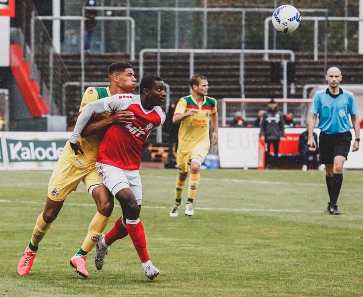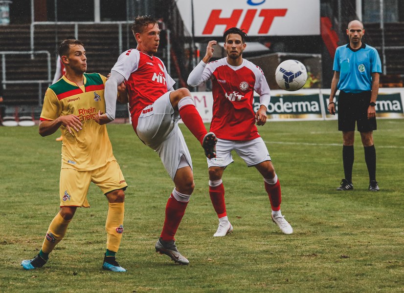 Die zweite Halbzeit startete so, wie die erste endete - nämlich mit Chancen für die Fortuna. Gleich zu Beginn fand Hamza Salman den Abschluss, traf allerdings nur weit über das Tor. In der 47. Minute scheiterte Ubabuike aus kurzer Distanz an Krahl. Quasi im Gegenzug konterte der FC über Christian Clemens, aber der Ball fliegt knapp am Tor vorbei. In der 48. Minute folgte dann eine schöne Kombination über Owusu, Brandenburger, Hölscher, die in Ubabuike seinen Abnehmer fand. Krahl konntrollierte jedoch erneut im Nachfassen den Ball. Owusu drängte in Richtung des gegnerischen Tores und konnte nur durch ein Foul gestoppt werden. Den fälligen Freistoß brachte der Kapitän Franko Uzelac flach vor das Tor des FC, wo Nico Brandenburger die Hereingabe nur um wenige Zentimeter verpasste (48.). Die folgenden Minuten waren geprägt von einigen Ballverlusten im Mittelfeld auf beiden Seiten und brachten so wenige klare Torchancen. In der 54. Minute wurde es dann laut im Südstadion. Francis Ubabuike kam bis zur Torauslinie und spielte den Ball halbhoch in den 5er. Die Fans unter den 930 Teilnehmern im Südstadion forderten einen klaren Handelfmeter, jedoch entschied sich der Schiedsrichter für einen Eckball, welcher allerdings für keine weitere Gefahr sorgen konnte. In der Folge ging es dann richtig schnell auf beiden Seiten. So brachten die Gäste in der 56. Minute den Ball auf den freistehenden Voloder, wessen Direktabnahme im Toraus landete. Auf der anderen Seite brach Julian Günther-Schmidt bis zur Torauslinie durch und legte den Ball quer, doch der Kölner Keeper fing den Ball ab. Nach 59 Minuten war es erneut Günther-Schmidt der bis zur Torauslinie gelang und dann auf den diesmal im 5er stehenden Salman querlegte. Salman schloss zentral ab und brachte den Ball im Tor der Gäste zur verdienten Führung unter. In der 63. Minute wurde es dann laut im Südstadion. Maik Kegel gab nach über anderthalb Jahren sein Comeback und ersetzte den heute erneut starken Timo Hölscher. Ein bewegender Moment für Zuschauer und Team. In den Folgeminuten erstarkte der 1.FC Köln und spielte sich einige Chancen heraus, die aber von Uzelac vereitelt wurden. In der 71. Minute gab es dann erneut eine schöne Kombination von Ochojski, Kegel und Owusu, welcher mit seiner Flanke in den Strafraum jedoch keinen Abnehmer fand. Nach 75 Minuten kam es dann zu einer Großchance auf Seiten der Gäste, die vorerst geklärt werden konnten. Dann aber doch der Schock für die Fortuna. In der 79. Minute zielte Vincent Geimer von der linken Seite auf das Tor und traf etwas glücklich zum 1:1 Ausgleichstreffer. Der Ball wurde noch leicht durch Nico Ochojski abgefälscht, weshalb Kevin Rauhut dem Ball nur noch hinterher schauen konnte. In den letzten zehn Minuten machten die Fortunen nochmal gehörig Druck, scheiterten jedoch mehrfach am gegnerischen Torwart. So auch nach einer Ecke von Maik Kegel, die Krahl noch im Nachfassen entschärfen konnte. Am Ende blieb es bei einem 1:1 gegen einen starken 1. FC Köln. In der nächsten Woche geht es dann mit dem Auswärtsspiel bei den Sportfreunden aus Lotte weiter.