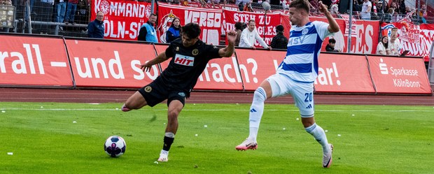 Fortuna hätte in der ersten Halbzeit die Weichen für ein kölsches Fußballfest stellen können. Aber entweder fehlte ein Quäntchen Glück, ein Tick Zielstrebigkeit oder Duisburgs Keeper Maximilian Braune hatte was dagegen. Braune wehrte den Flachschuss von Batarilo (4.) ab, nach Zuspiel von Henri Matter fand Marvin Mika mit einem Schuss in die lange Ecke seinen Meister in Braune (11.). Und Batarilo spitzelte den Ball nach Vorarbeit von Matter am langen Pfosten vorbei (13.).