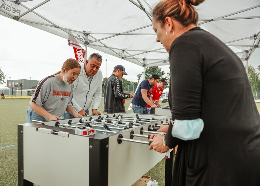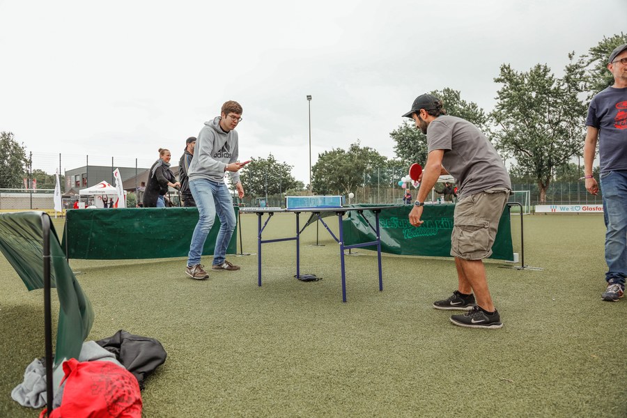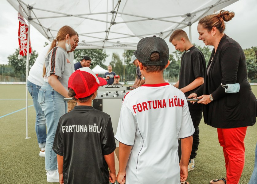 Um 11 Uhr fiel der Startschuss am Vereinsheim und auf dem Kunstrasengelände des Jean-Löring Sportparks. Es gab ein buntes Familienfest, bei dem jeder auf seine Kosten kommen konnte. Für das leibliche Wohl war stets gesorgt und Jung und Alt konnten sich vergnügen. Die verschiedenen Abteilungen des S.C. Fortuna Köln haben sich vorgestellt und Spiele vorbereitet. Die Handballabteilung hat ein Wurfspiel vorbereitet und am aufgebauten Kicker sowie der Tischtennisplatte konnten die Besucher gegeneinander antreten. Auch haben sich einige Unternehmen präsentiert und ihre Stände aufgebaut. Nach dem Familienfest ging es dann im Südstadion zur Sache, wo zum letzten Härtetest vor dem Saisonstart am 14. August, der TSV Steinbach Haiger zu Gast war. Die rot-weißen gerieten früh in Rückstand und lagen bereits nach wenigen Minuten mit 0:2 hinten. Neuzugang Marquet konnte zwar verkürzen, Steinbach legte jedoch noch mal und gewann mit 1:3. Das Highlight war nach dem Spiel dann der Besuch der Mannschaft im Vereinsheim, wobei sie den Abend gemeinsam mit den Fans ausklingen ließen. Das stürmische Wetter und die Niederlage im Spiel haben die gute Stimmung nicht trüben können.
