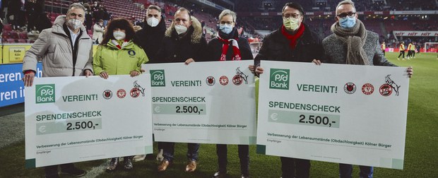 Gemeinsam mit den Vertretern der anderen beiden Kölner Clubs Andreas Rettig (FC Viktoria Köln) und Alexander Wehrle (1.FC Köln) überreichten Hanns-Jörg Westendorf und Benjamin Bruns Spendenschecks im Wert von je 2.500€. Zu Gunsten gingen die Spenden der Emmaus Gemeinschaft Köln e.V., der Überlebensstation GULLIVER, dem Helping Hands Cologne e.V., dem Sozialdienst Katholischer Frauen e.V. Köln und dem Vringstreff e.V.