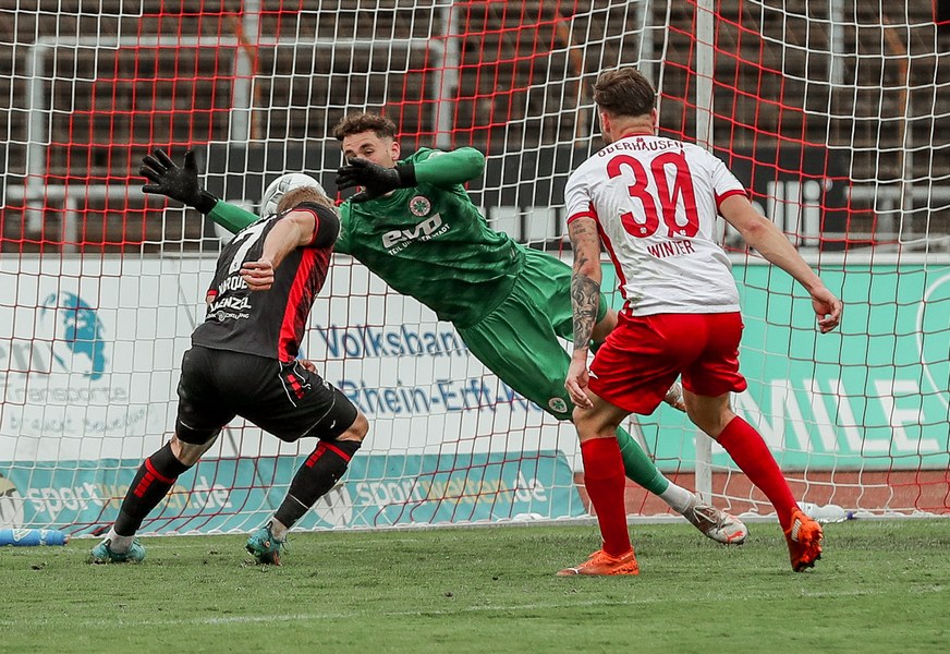 Der erste Abschluss gehörte den Oberhausenern, die nach einem Fortuna-Angriff fix umschalteten und über den schnellen Oubeyapwa von rechts in den Strafraum eindrangen. Aus dem Querpass auf Höhe der Strafraumgrenze machte Kreyer glücklicherweise nichts Zählbares (6.Min). Dem Spiel war es anzumerken, dass keine der beiden Mannschaften sich einen Fehler zu Schulden kommen lassen wollte. Die Folge waren viele Ballstafetten im Mittelfeld und nur wenige Torraumszenen. Für die erste Torannäherung auf Fortuna-Seite sorgte Leon Demaj nach einer guten Viertelstunde mit einem Schuss aus gut 20 Metern. RWO-Keeper Justin Heekeren hielt den flachen Ball ins linke Eck aber sicher fest. Ein Raunen ging nur zwei Minuten später durch das Südstadion. Über den rechten Flügel brach zunächst Demaj mit Tempo durch, ehe er auf Najar ablegte. Najar wirbelte an mehreren Gegenspielern vorbei, drang bis auf die Torauslinie vor und hatte das Auge für den in den Fünfer einlaufenden Sascha Marquet. Marquet verpasste denkbar knapp und so rauschte der Ball links am Tor vorbei. Dies war bezeichnend für die erste Hälfte, in der die Südstädter zwar viel Ballbesitz innehielten, es jedoch kaum schafften den letzten Ball an den Mann zu bringen bzw. in Szene zu setzen. Ähnlich sah es bei den Gästen aus Oberhausen aus, diese nutzten allerdings ihre einzige große Gelegenheit in Person von Sven Kreyer eiskalt aus. Winter schlug aus dem rechten Halbfeld einen halbhohen Ball auf den Elfmeterpunkt. Mittelstürmer Kreyer hielt den Fuß herein, bugsierte den Ball an den rechten Innenpfosten, von welchem er in das Tor von André Weis rollte (33. Min). Damit kassierte die Fortuna nach zwei Spielen zu null erstmals wieder ein Gegentor. Die Fortuna gab sich nach dem unerwarteten Gegentreffer noch lange nicht auf und hatte kurz vor der Halbzeitpause sogar noch die Möglichkeit den Rückstand zu egalisieren. Suheyel Najar hebte zunächst den Ball auf Höhe der Mittellinie leicht über seinen Gegenspieler und zog an diesem vorbei. Anschließend nahm er an Fahrt auf und legte sich den Ball am nächsten Oberhausener vorbei. Erst Stappmann konnte ihn schließlich kurz vor dem Strafraum stoppen und verhinderte den Ausgleich. So ging es mit einem 0:1 Rückstand in die Halbzeitpause.