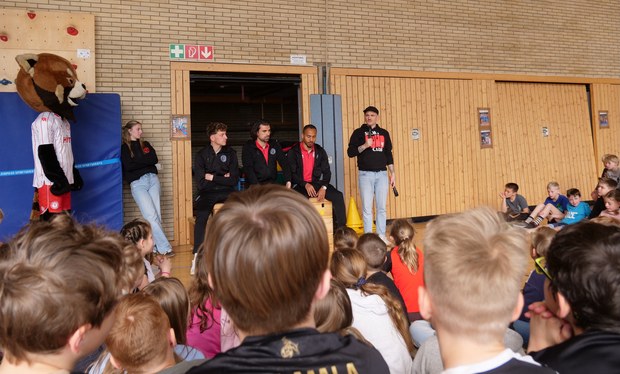 An drei abwechslungsreichen Fußballstationen konnten die Schülerinnen und Schüler ihre Fähigkeiten verbessern: Passspiel, Torschuss, Dribbling. Im Anschluss ging es in die Turnhalle, wo etwa 100 Kinder gespannt auf die Spieler warteten. Bei einer offenen Frage- und Autogrammstunde hatten die Kinder die Möglichkeit, die Profis persönlich kennenzulernen. Typische Fragen waren zum Beispiel: „Was wärt ihr geworden, wenn ihr keine Fußballer wärt?“ „Wie viele Sprachen sprecht ihr?“ „Messi oder Ronaldo?“ „Wie sieht euer Torjubel aus?“