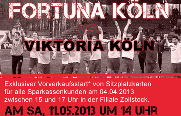 Sparkassen-Kunden aufgepasst - Die Fortuna und ihr Partner „Sparkasse KölnBonn“ veranstalten zum Derby gegen den FC Viktoria Köln eine exklusive Ticket-Aktion. Bereits vor dem offiziellen Verkaufsstart für Sitzplatzkarten haben alle Sparkassen-Kunden die Möglichkeit Tickets zu erwerben. Am kommenden Donnerstag, den 4. April zwischen 15 Uhr und 17 Uhr könnt ihr euch als Sparkassen-Kunde in der Filiale Zollstock (Höninger Weg 206, 50969 Köln) eure Sitzplatztickets sichern. Als Nachweis gilt die Sparkassen-EC Karte. Das Kontingent pro Person ist auf zwei Tickets begrenzt. Nutzt die Möglichkeit und greift zu, solange der Vorrat reicht. Der Preis für ein Sitzplatzticket beträgt 15 Euro (erm. 12,50 Euro).