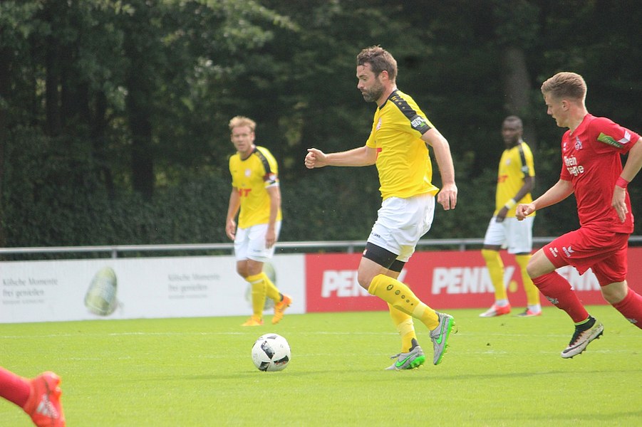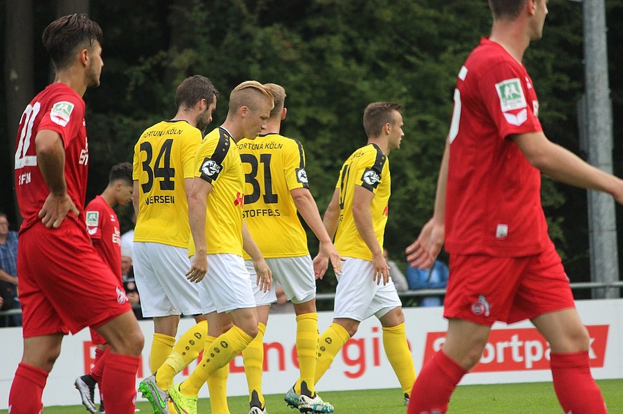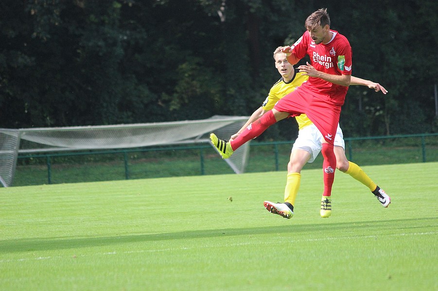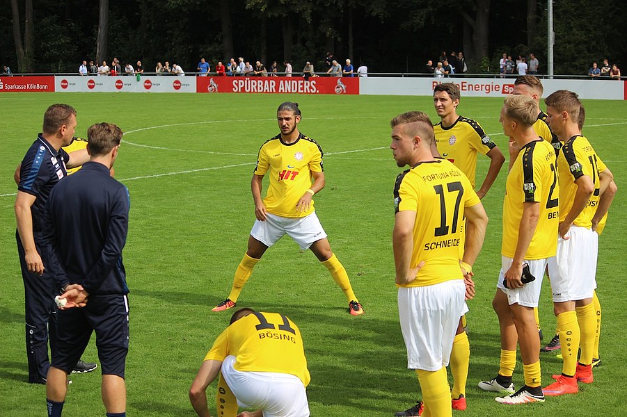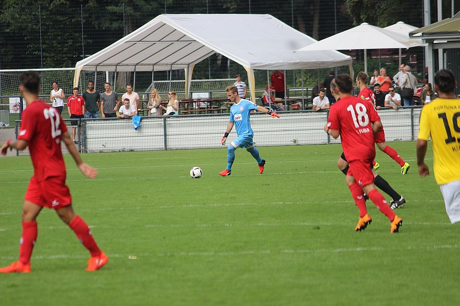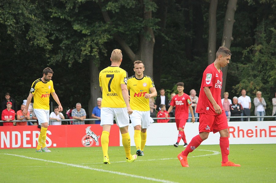Von Beginn an ging die Fortuna mit der notwendigen Ernsthaftigkeit in den Test gegen die jungen Geißböcke. So setzte Röcker mit einem resoluten Zweikampf früh das erste Zeichen. Die Südstädter versuchten von hinten heraus das Spiel zu kontrollieren, lauerten zugleich aber auch auf Kontermöglichkeiten. Den ersten Torschuss gab jedoch der FC in Person von Bauer ab, nach einem Ballverlust der Fortuna (11.). Danach bestimmte der Drittligist jedoch die Partie. Immer wieder versuchte man schnell nach vorne zu spielen. Nach einem Konter des FC schaltete die Fortuna schnell um, sodass sich Rahn aus der Distanz probieren konnte (19.). Wenige Minuten zuvor wurde der Stürmer nach einem blitzsauberen Konter über Engelman in aussichtsreicher Position wegen Abseits zurückgepfiffen. Trotzdem ging die Fortuna anschließend in Front: Nach einem Ballgewinn von Engelman marschierte Andersen in Richtung FC-Tor. Schließlich war es Kessel, der nach Spielverlagerung von Bösing trocken ins kurze Eck verwandelte - 1:0 für die Fortuna (26.). Der Regionalligist kam gegen kompakte und giftige Südstädter nicht zur Entfaltung. Vielmehr hat Stoffels einen Distanzschuss für die Fortuna parat (39.). Dass die jungen Geißböcke aber nicht zur Entfaltung kamen, lag auch an der Aggressivität des Drittligisten. So war es nicht überraschend, das mit Stoffels ein Fortune kurz vor der Pause die einzige Verwarnung in der Partie sah (43.).