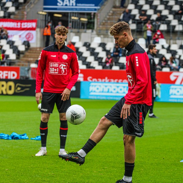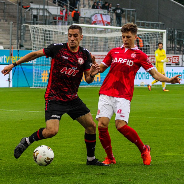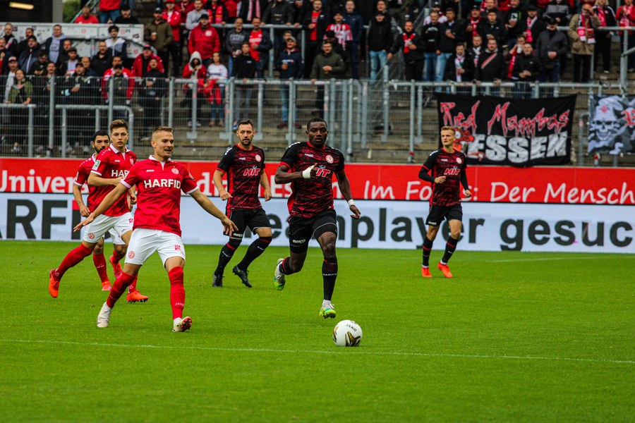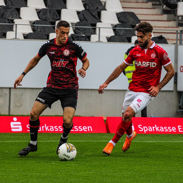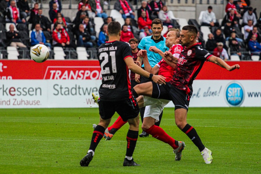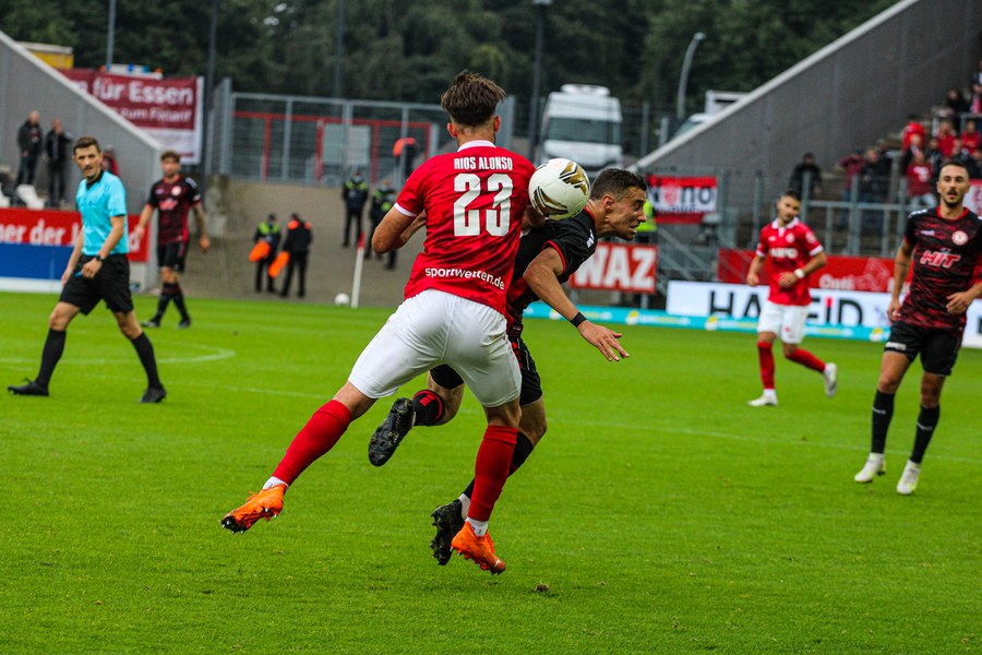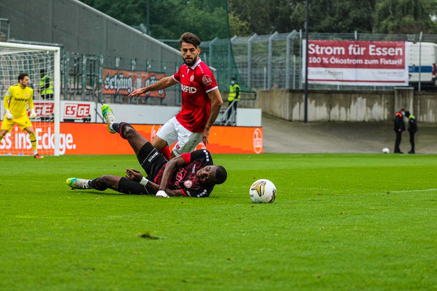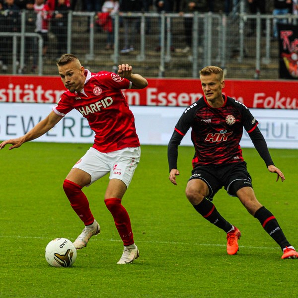 Bereits in der zweiten Spielminute gab es die erste Schrecksekunde für die Fortuna: Plechaty kam nach einem langen Pass über die rechte Seite und schloss in Richtung langes Eck ab. André Weis war schon geschlagen, aber der Ball prallte an den Pfosten. Engelmann schoss den Abpraller ebenfalls an den Pfosten und die daraus resultierende Ecke brachte nichts ein. Nach fünf schnellen Minuten beruhigte sich das Spiel zunächst wieder, bis Essen ab der zehnten Minute mehr Druck machte. Die Fortuna stand sicher, ließ nichts zu und versuchte selber Druck zu machen. Das Spiel war zunächst ein ständiger Wechsel zwischen beiden Hälften, wobei beide Mannschaften ihre stärkeren Phasen hatten. Ab der 20. Spielminute hatte RWE das Spiel dann für einige Minuten fest im Griff und zwang die Fortuna zu Fehlern, die ohne Folgen blieben. Weiterhin blieben beide Mannschaften ohne klare Chancen, Rot-Weiss hatte jedoch optische Vorteile. Die Teams schenkten sich nichts und die Fouls nahmen auch in der Härte zu. Nach einem Foul an Marquet erhitzen sich die Gemüter und Fortuna Coach Alexander Ende musste von seinen Kollegen beruhigt werden. Vor der Pause nahm Ubabuike es allein mit der Essener Verteidigung auf, sein Abschluss segelte allerdings klar über das Tor. In den letzten Sekunden der Nachspielzeit verloren die Essener nach einem Einwurf von Poggenberg den Überblick. Sascha Marquet konnte sich am zweiten Pfosten frei einschieben und konnte die 0:1 Pausenführung für die Fortuna erzielen.