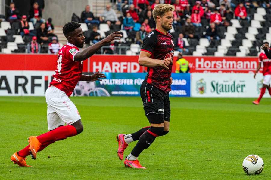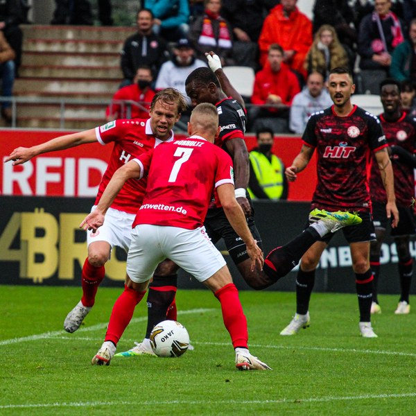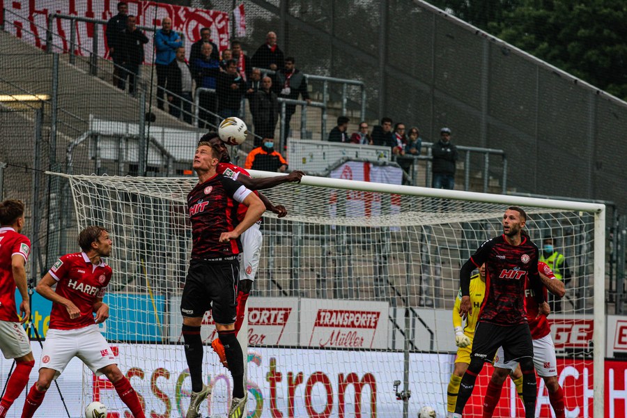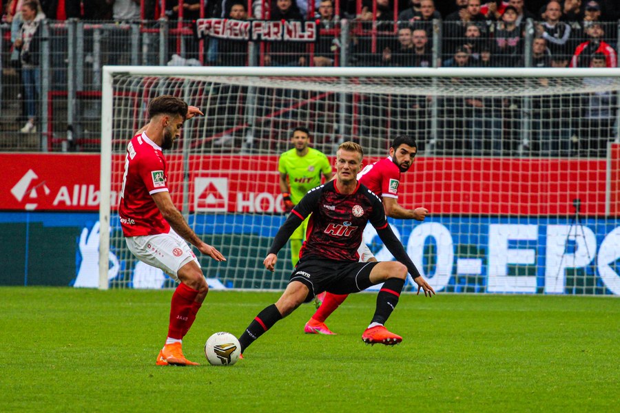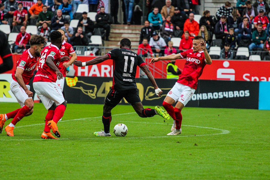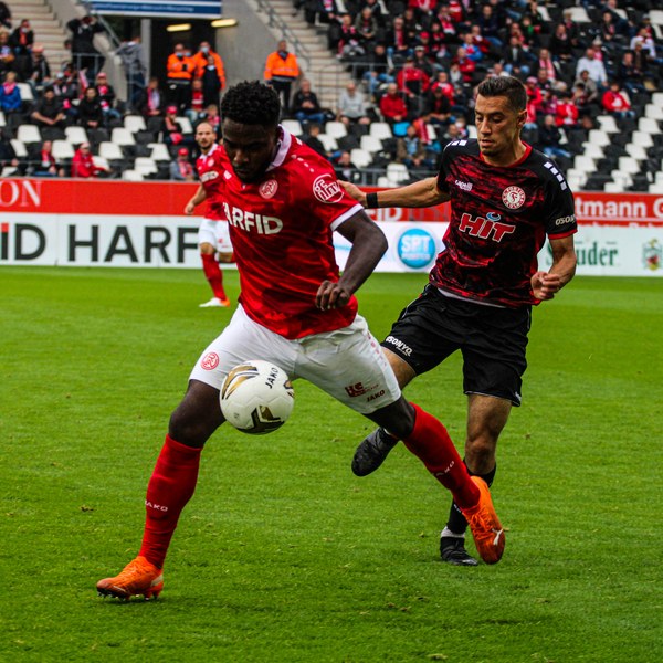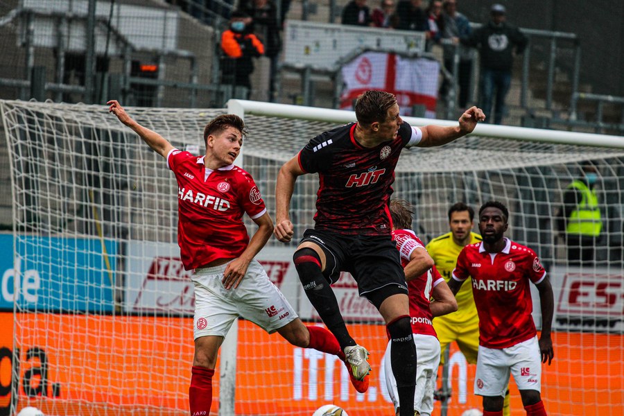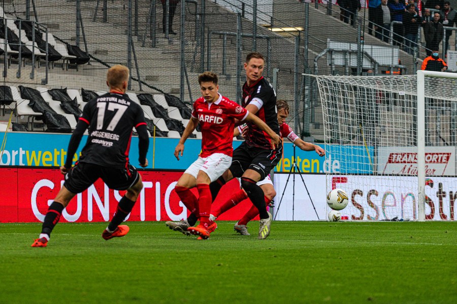 Bereits in der zweiten Spielminute gab es die erste Schrecksekunde für die Fortuna: Plechaty kam nach einem langen Pass über die rechte Seite und schloss in Richtung langes Eck ab. André Weis war schon geschlagen, aber der Ball prallte an den Pfosten. Engelmann schoss den Abpraller ebenfalls an den Pfosten und die daraus resultierende Ecke brachte nichts ein. Nach fünf schnellen Minuten beruhigte sich das Spiel zunächst wieder, bis Essen ab der zehnten Minute mehr Druck machte. Die Fortuna stand sicher, ließ nichts zu und versuchte selber Druck zu machen. Das Spiel war zunächst ein ständiger Wechsel zwischen beiden Hälften, wobei beide Mannschaften ihre stärkeren Phasen hatten. Ab der 20. Spielminute hatte RWE das Spiel dann für einige Minuten fest im Griff und zwang die Fortuna zu Fehlern, die ohne Folgen blieben. Weiterhin blieben beide Mannschaften ohne klare Chancen, Rot-Weiss hatte jedoch optische Vorteile. Die Teams schenkten sich nichts und die Fouls nahmen auch in der Härte zu. Nach einem Foul an Marquet erhitzen sich die Gemüter und Fortuna Coach Alexander Ende musste von seinen Kollegen beruhigt werden. Vor der Pause nahm Ubabuike es allein mit der Essener Verteidigung auf, sein Abschluss segelte allerdings klar über das Tor. In den letzten Sekunden der Nachspielzeit verloren die Essener nach einem Einwurf von Poggenberg den Überblick. Sascha Marquet konnte sich am zweiten Pfosten frei einschieben und konnte die 0:1 Pausenführung für die Fortuna erzielen.