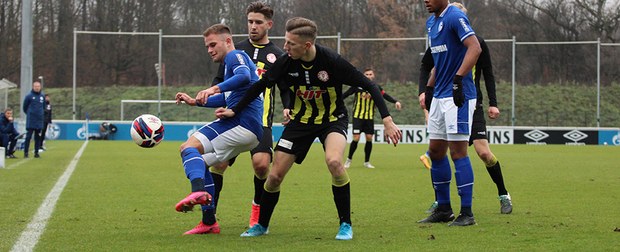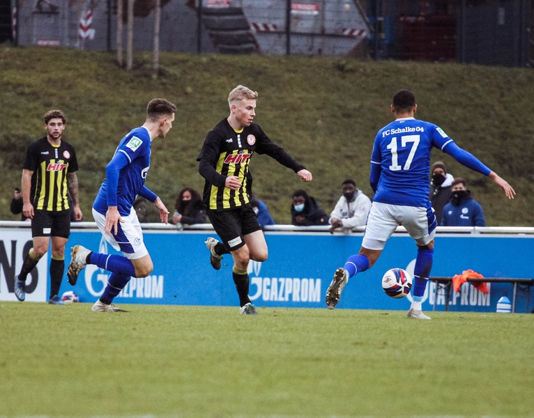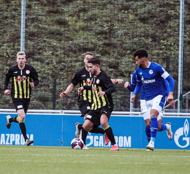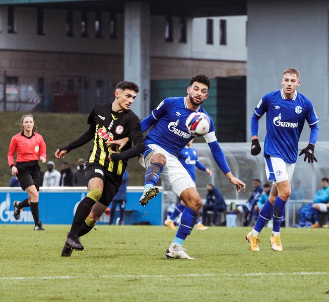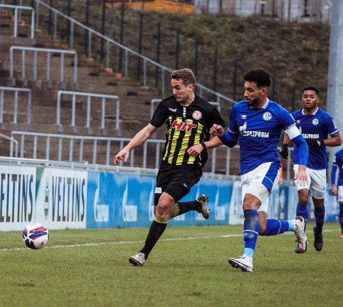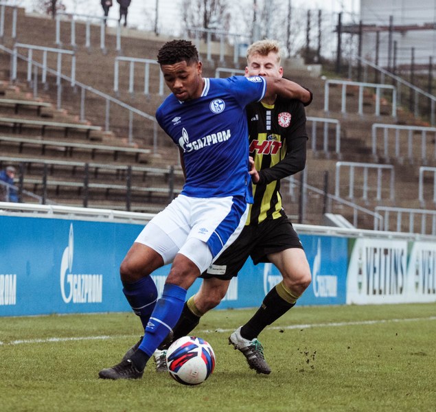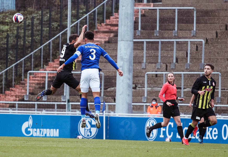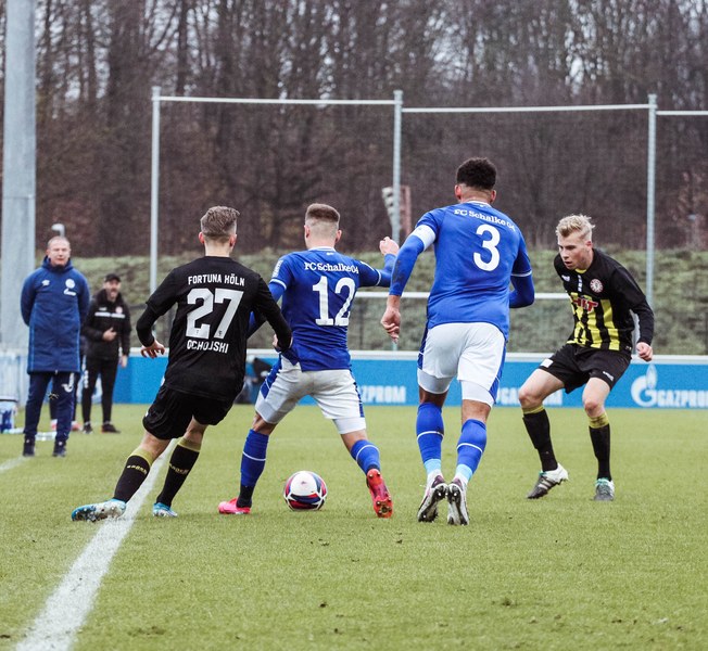 Nach anfänglichem Abtasten kam die Fortuna in der 5. Minute zur ersten Torannäherung. Timo Hölscher verlagerte das Spiel in die Mitte auf Hamza Salman. Der nahm mit einem schnellen Ball Francis Ubabuike mit. Fortunas Nummer 11 suchte aus gut 18 Metern den Abschluss, setzte den Ball aber über den Kasten. Auf der anderen Seite wurde es noch knapper. Weschenfelder-Scienza lief im spitzen Winkel alleine auf Rauhut zu. Fortunas Schlussmann bekam im letzten Moment noch den Fuß dazwischen und lenkte den Ball damit Zentimeter am langen Pfosten vorbei (8.). Die anschließende Ecke klärte die Fortuna und setzte gleich zum Konter an. Der in der Spitze von Prokoph verlängerte Ball landete jedoch in den Armen von Theißen, ehe Günther-Schmidt an das Spielgerät kommen konnte (8.). Es dauerte einige Zeit, bis sich das Spielgeschehen aus dem Mittelfeld wieder vor eines der Tore verlagerte – diesmal vor den Kasten von Kevin Rauhut. Jason Ceka tankte sich durch die Hintermannschaft der Südstädter und spielte auf Schuler ab. Der Schalker kam zwar zum Abschluss, stand dabei jedoch im Abseits (18.). Durch ein taktisches Foul kam die Fortuna zu ihrer nächsten Chance. Nachdem Salman gelegt wurde, setzte Ubabuike zum Freistoß an. Der Ball geriet aber zu lang und segelte an Freund und Feind vorbei (24.). Das weitere Spielgeschehen wurde von vielen kleineren Fouls geprägt, die der Schiedsrichterin immer wieder einen Pfiff entlockten. Ein richtiger Spielfluss kam so nur schwer zu Stande. Zudem setzte Schalke den ballführenden Spieler bereits früh unter Druck, sodass auch Fortunas Abwehr beim Spielaufbau immer wieder aufpassen musste. Nach 30 gespielten Minuten setzten dann Ubabuike und Günther-Schmidt Schalkes Timo Becker an der Schalker Eckfahne gemeinsam unter Druck und sicherten sich so den Ball. Die anschließende Flanke von Brandenburger verunglückte aber sichtlich und fand so in der Mitte keinen Abnehmer. Zwei Zeigerumdrehungen später zielte Diamant Berisha aus der Distanz auf den Kasten von Rauhut, verfehlte diesen aber deutlich (32.). Auch die Fortuna zeigte sich wenig erfolgreich, als sich Prokoph durch starken Einsatz den Ball sicherte, mit seinem Abschluss aber nur ein Schalker Abwehrbein traf. Besser machte es der Stürmer in der 38. Minute. Alleine vor dem Keeper umkurvte er diesen und schob den Ball in Richtung des leeren Tores. Dann aber der Pfiff. Abseits. Und, hier muss man ehrlich sein, das auch deutlich. Dann hieß es durchatmen bei der Fortuna. Wenige Sekunden vor dem Halbzeitpfiff tauchten die Knappen mit einer dicken Dreifach-Chance vor Rauhut auf. Nach einem geblockten Schuss, einem Pfostentreffer und einer weiteren Glanztat von Kevin Rauhut wurde der Ball aus der Gefahrenzone befördert und Fortunas Schlussmann hielt die Null zur Pause (45+1).