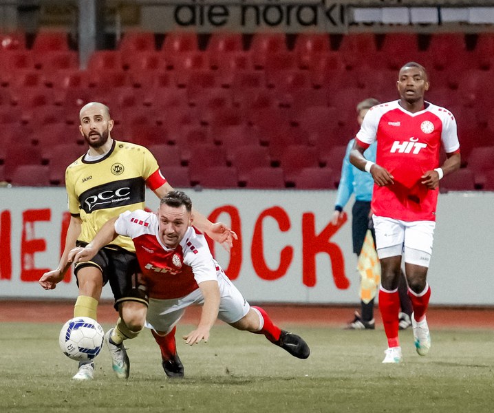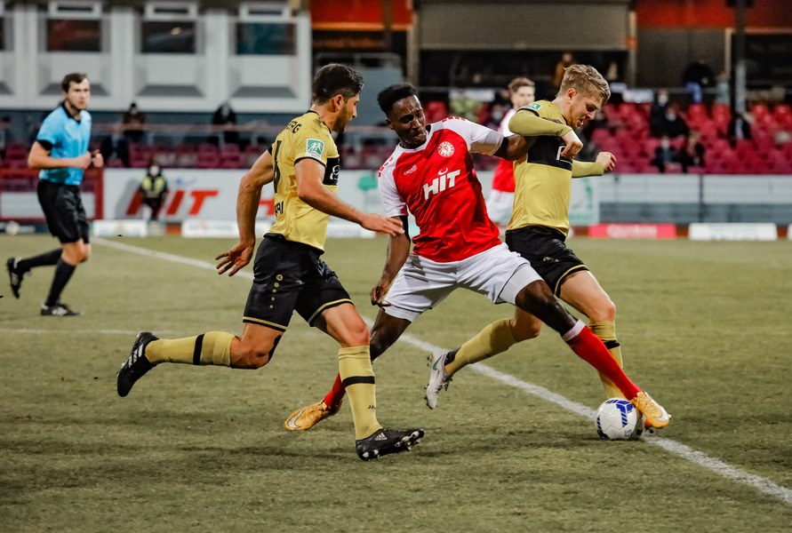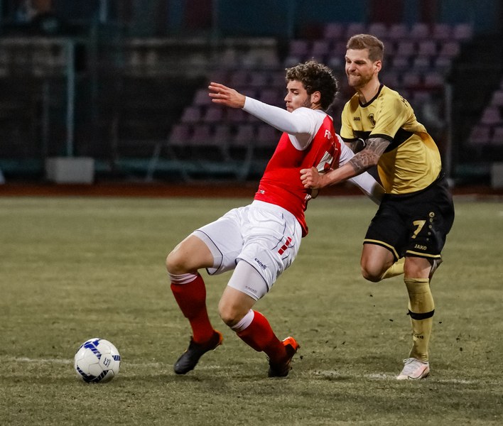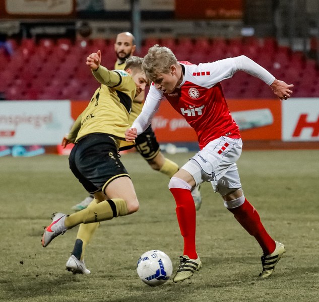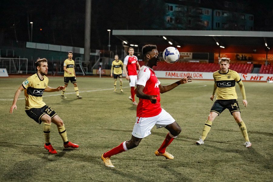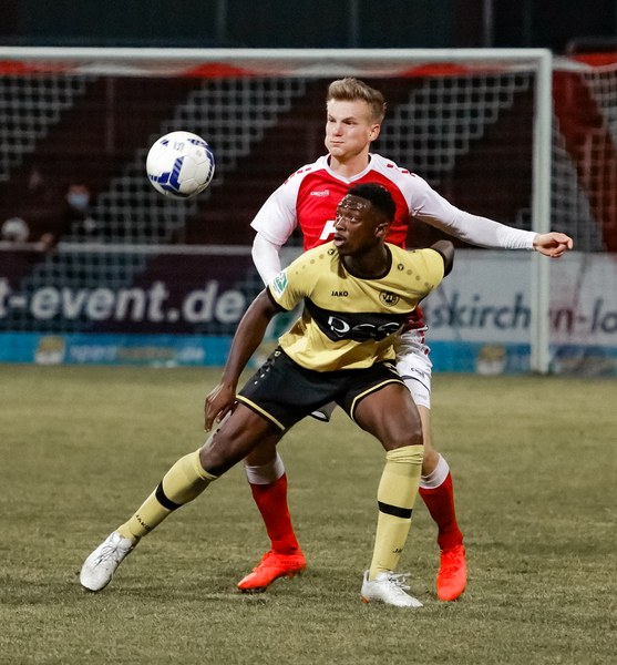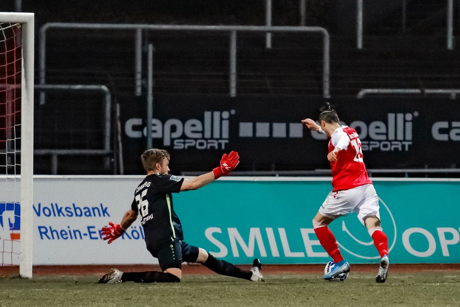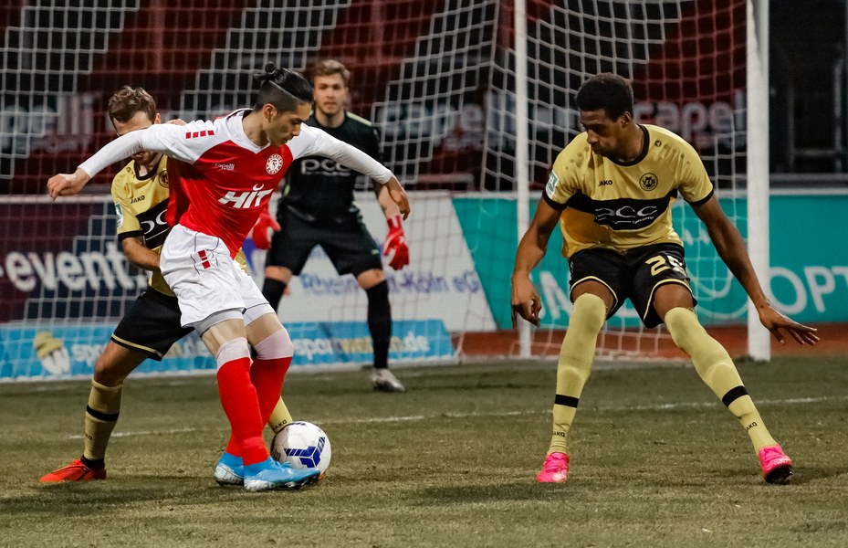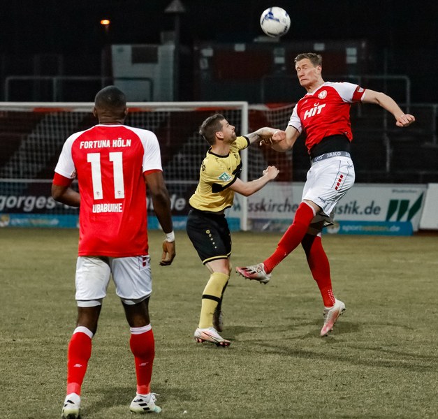 Im Gegensatz zum letzten Pflichtspiel nahm Trainer Alexander Ende vier Veränderung in der Startformation vor. Poggenberg, Itter, Kegel und Ubabuike rotierten in die erste Elf. Dafür nahmen Rumpf, Najar und Hölscher auf der Bank Platz, Prokoph stand nicht im Kader.Bereits nach drei Minuten näherten sich die Fortunen erstmals dem Homberger Tor. Dan-Patrick Poggenberg brachte von der linken Seite eine Flanke scharf vor das Tor, doch ein Homberger Verteidiger konnte per Kopf klären. Die Anfangsminuten gestalteten sich wie erwartet. Die Fortuna lag über weite Strecken in Ballbesitz und versuchte die gutstehenden Homberger Defensive zu durchdringen. In der 10. Minute kamen die Gäste vom Duisburger Rheindeich erstmals zum Abschluss. Nach einem Einwurf brachte Said Harouz den Ball erst in den Sechzehner, in dem es zu Tumulten kam, ehe ein weiterer Homberger den Ball am linken Pfosten verzog. In der 15. Minute nahm es Innenverteidiger Lanius etwas zu genau und traf nach Ecke von Kegel nur den Querbalken. Nach und nach kamen die Duisburger besser ins Spiel und kamen gleich zu mehreren Chancen. Nach einer Freistoßflanke in der 18. Minute flog der Ball erneut links am Tor vorbei. Nur eine Minute später wurde Ahmad Jafari mit einem langen Ball auf die Reise geschickt, doch Jannik Löhden war hellwach und klärte zur Ecke. In der Folge kam es zu weniger Strafraumszenen, da sich der Ball vermehrt im Aufbauspiel der Fortuna befand, jedoch nicht das letzte Drittel eindringen konnte. Nach 28 gespielten Minuten war es erneut Dominik Lanius nach einer Ecke von Maik Kegel, der den Ball auf das Tor, genauer gesagt auf das Tornetz brachte. Nun kam die Fortuna dem Führungstreffer näher. Über die linke Seite flankte Poggenberg den Ball in Richtung Sechzehner und fand in Ochojski einen Abnehmer. Dieser köpfte den Ball an das Lattenkreuz, Schiedsrichter Engelmann hatte jedoch ohnehin schon auf Abseits entschieden (30. Minute). Nach einem taktischen Foul an der Außenlinie, auf Höhe der Mittellinie sieht Nico Brandenburger zurecht die gelbe Karte. Bei seinem Einsatz zog sich der Mittelfeldmann allerdings ebenfalls eine blutige Nase, nach einem Ellbogenstoß seines Gegenspielers Said Harouz zu, welcher daraufhin ebenfalls die gelbe Karte sah (33. Minute). Der Freistoß im Anschluss an die Situation sorgte nochmals für Gefahr vor dem Tor von Kevin Rauhut, denn der 2,02 große Innenverteidiger Cottrell Ezekwem kam unbedrängt zum Kopfball doch verpasste den Kölner Kasten recht deutlich. Kurz darauf wäre es fast der Führungstreffer gewesen. Owusu drang über die rechte Seite durch und brachte den Ball flach und gefährlich in den 16er, doch Francis Ubabuike rutschte knapp am Ball vorbei und so gab es Torabstoß für die Homberger. Nur wenige Minuten vor der Pause sorgte Maik Kegel mit einer verunglückten Flanke für Gefahr vor dem Tor des Homberger Keepers Gutkowski. Dieser passte allerdings gut auf und parierte zu einer weiteren Ecke für die Hausherren (41. Min). Da auch in den restlichen Minuten bis zum Halbzeitpfiff nichts wesentliches mehr passierte, ging es verdient mit einem torlosen Remis in die Pause. Der angeschlagene Nico Brandenburger blieb in der Halbzeit in der Kabine und wurde durch Timo Hölscher ersetzt. In der 52. Minute wurde Hamza Salmans Dribbling auf Höhe der Sechzehnerkante mit einem Foul gestoppt. Maik Kegel trat zum fälligen Freistoß an, traf jedoch nur die Homberger Mauer. Über den eingewechselten Hölscher gelangte der Ball nach einem starknen Dribbling auf die linke Seite, wo sich Poggenberg stark im Laufduell durchsetzte, dessen Flanke kam aber nicht wirklich an, aber Fortuna startete damit auch in die zweite Hälfte mit einer guten Aktion (56. Minute). Die Gäste aus Homberk kamen im Gegnzug zu einer risen Chance: Harouz stand nach einem Steilpass plötzlich alleine vor Rauhut und schießt dann ohne Druck meterweit am Tor vorbei. Die Fortuna hatte zu diesem Zeitpunkt großes Glück, dass der Rheindeicher eine solche zwingende Möglichkeit liegen lies. Dann wechselte Cheftrainer Alexander Ende doppelt. Er nahm Ubabuike und Itter vom Platz und schickte dafür Najar und Isobe auf das Spielfeld (62. Minute). Owusu wurde dann von Hölscher per Chip sehr schön im gegnerischen 16er in Szene gesetzt, sein Schuss aus der Drehung heraus wurde von den Hombergern abgeblockt unnd brachte die nächste Ecke ein. In seinem ersten Spiel für die Fortuna fiel Isobe sofort durch seine Aktionen auf. In der 69. Minute drehte er sich um seine eigene Achse an gleich zwei Gegenspielern vorbei, sein Abschluss wurde aber geblockt. Löhdens Nachschuss landete dann in Torwart Gutkowskis Armen. Anschließend kam Rumpf für Kegel in die Partie (74. Minute). Die Fortuna hatte jetzt deutlich mehr Ballbesitz und erspielte sich in der 75. Minute eine weitere riesige Chance . Nach einem Einwurf setzte sich Najar erst an der Außenlinie durch, drang dann bis zur Torauslinie hervor und lässt mehrer Gegenspieler stehen. Dann legte er den Ball quer auf Isobe, der alles richtig macht und den Ball zunächst am Torwart vorbeilegt und den Ball dann aus einem Meter an den Pfosten setzte. Das zweite Mal Aluminium Glück für die Gäste aus Homberg. Auch die Duisburger kamen noch einmal zu einem aussichtsreichen Vorstoß, dieser wurde unfair von dem zuvor eingewechselten Rumpf gestoppt, was einen Freistoß nach sich zog. Die Gäste vom Duisburger Rheindeich nutzen in der Schlussphase jede Möglichkeiten, um Zeit von der Uhr zu nehmen und ließen sich bei all ihren Aktionen reichlich Zeit. Hölscher sah dann noch aufgrund eines taktischen Fouls zurecht die gelbe Karte (83. Minute) .Die Homberger standen sehr defensiv und ließen der Fortuna kaum Lücken. Löhden wurde vom Innenverteidiger zum Stürmer befördert, um vor dem gegnerischen Tor hoch angespielt zu werden, doch es kamen kaum verwertbare Flanken auf den großen Spieler. Am Ende trennten sich der VfB Homberg und Fortuna Köln 0:0 unentschieden und teil