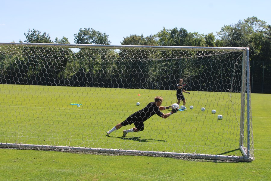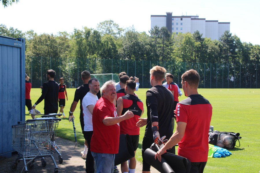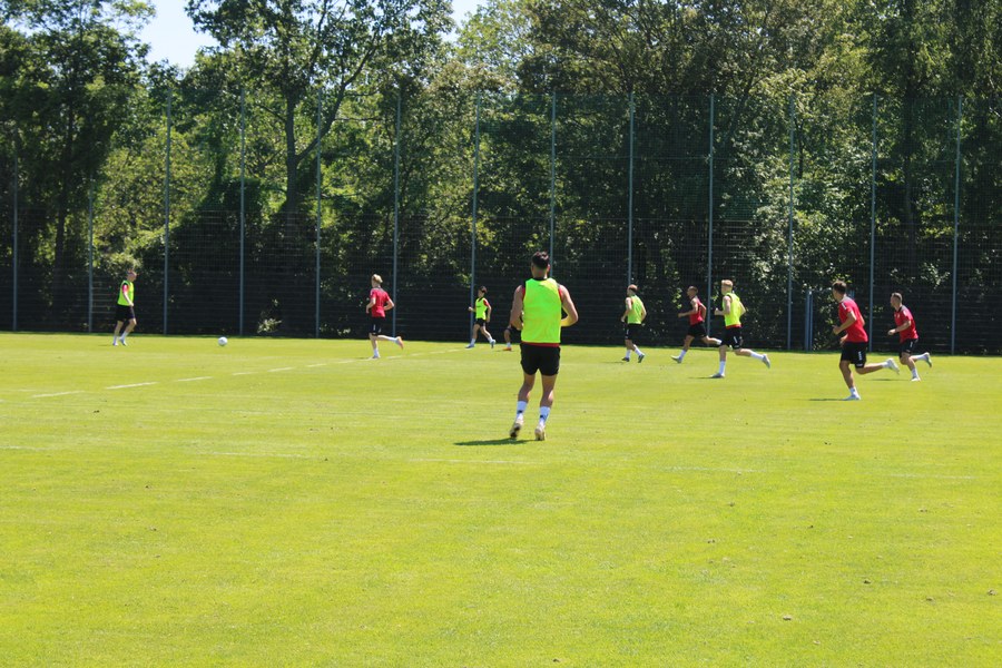 Der Ball rollt wieder im Kölner Süden. Am vergangenen Mittwoch erfolgte bei strahlendem Sonnenschein der Trainingsauftakt für die neue Spielzeit 2023/24 der Fortuna. Erstmals mit dabei die Neuzugänge Tim Brdarić, Marvin Mika und Lennart Winkler sowie der neue Co-Trainer Thomas Kraus. Zusätzlich waren auch einige Spieler aus der U23 auf dem Trainingsplatz im Jean-Löring Sportpark. Während an der Seitenlinie reges Zuschauertreiben stattfand, bereiteten sich die Spieler mit Läufen, Pass- und Torschussübungen sowie eines Trainingspiels auf die neue Saison vor.