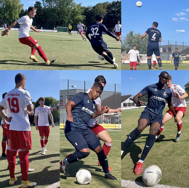 Gegenüber dem 0:0 in Friesdorf gab es drei Änderungen in der Startelf. Für Tim Becker und Dion Wendel (beide auf der Bank) sowie Jean Marie Nadjombe (nicht im Kader) begannen Gianluis Di Fine, Simon Stacey und Marvin Iskra. Kurzfristig musste zudem Luca Schneider aufgrund einer Zerrung passen. Bereits nach 22 Minuten war die Fortuna zu einem Wechsel gezwungen. Gianluis Di Fine war schwindlig, nachdem er aus kurzer Distanz einen Schuss an den Hinterkopf bekommen hatte. Während der Schiedsrichter hüben wie drüben auf einen durchaus möglichen Elfmeterpfiff verzichtete, sowohl der Siegburger Boris Kivoma als auch der Kölner Marvin Iskra wurden regelwidrig zu Fall gebracht, hatte Iskra urplötzlich nach einem langen Ball von Leo Camara das 1:0 auf dem Fuß, aber er lupfte den Ball genau mittig an die Latte (29.). Nach einem unwiderstehlichen Sololauf setzte Philipp Höffler kurz vor der Pause den Ball an den Pfosten (45.).