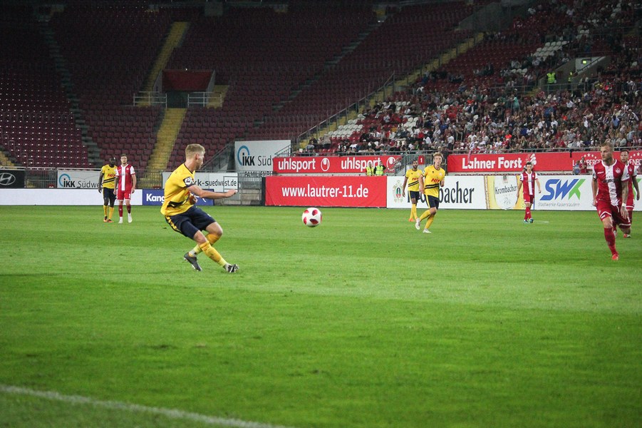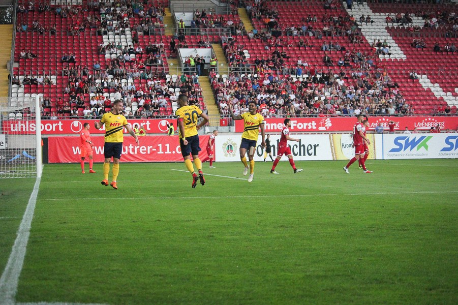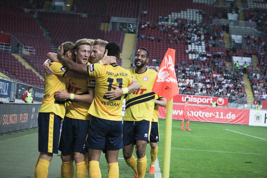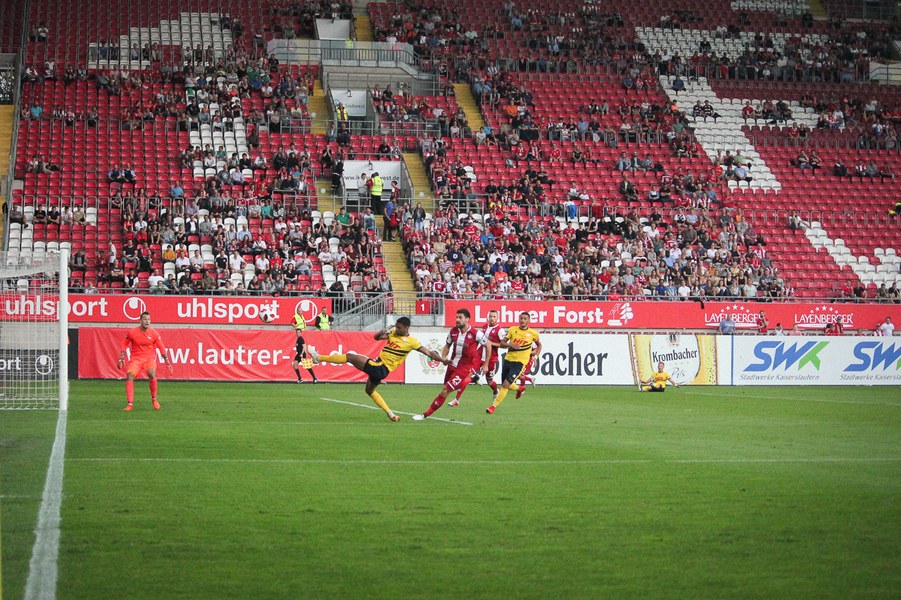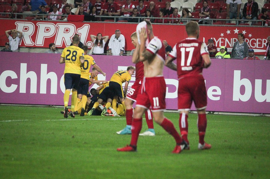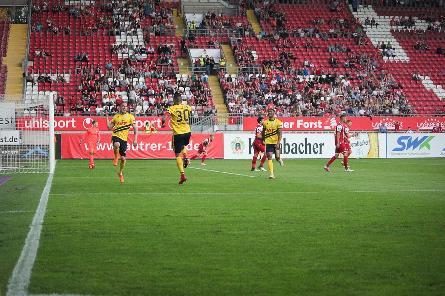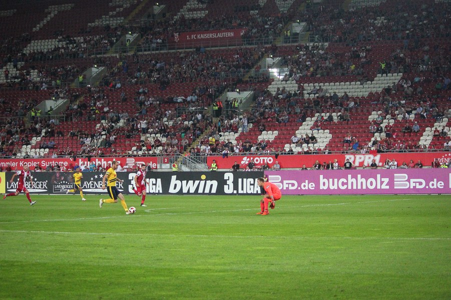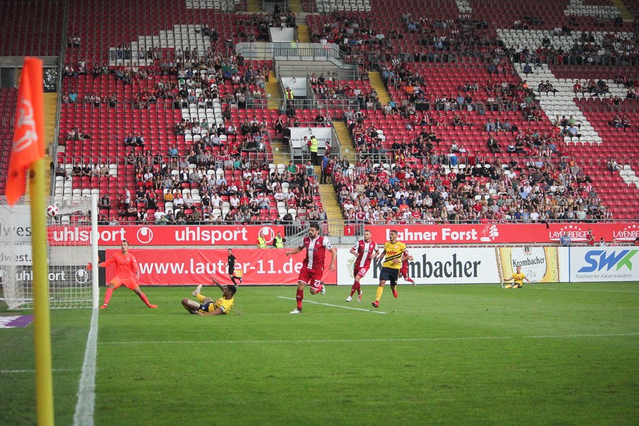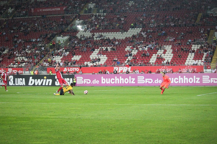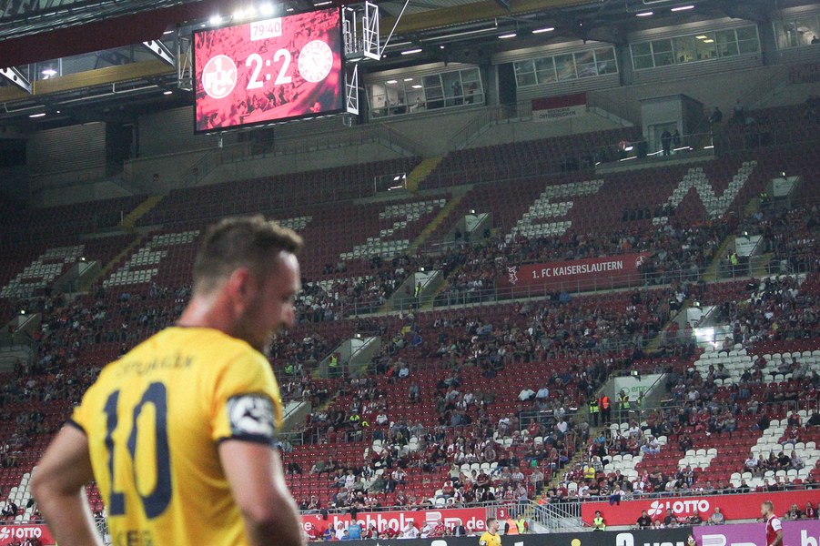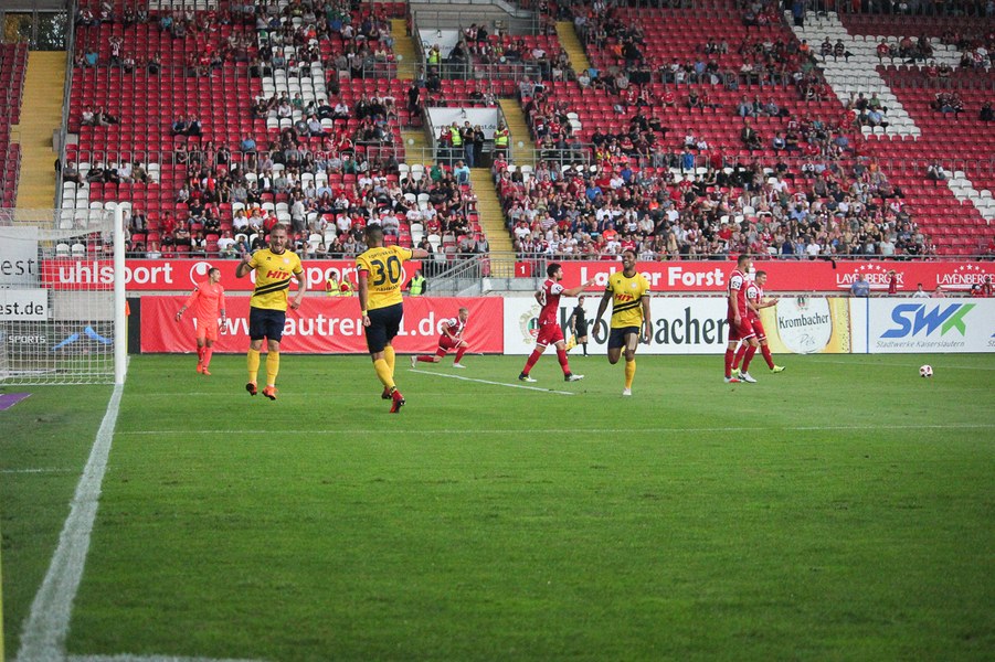 Unter dem gellenden Einsatz von Trillerpfeifen musste sich Schiedsrichter Schröder diesmal besonders bemühen, um den Anpfiff vorzunehmen. Die ersten Chancen ließen danach aber nicht lange auf sich warten. Eine leicht verunglückte Flanke Schieks landete wider Erwarten auf der Latte des Lauterer Kastens (5.). Für die Roten Teufel wirkte das zumindest kurzzeitig wie ein "Wachmacher", denn kurz darauf prüfte Hemlein den Torwart der Fortuna, aber Rehnen parierte (6.). Kurz darauf ließ die Fortuna die Euphorie der Gastgeber aber verstummen. Eine sehenswerte Kombination über viele Stationen endete in einem Tor von Robin Scheu aus spitzem Winkel (9.). Somit kam die Fortuna ihrem Ziel näher, die Heimmannschaft schon früh unter Druck zu setzen und das heimische Publikum in ihrer Ungeduld zu bestärken. Auch die Pfälzer auf dem Platz schien der Gegentreffer ein wenig zu hemmen. Die Fortuna blieb aber dennoch weiter konzentriert und ließ sich auch durch die Kulisse nicht zu sehr beeindrucken. Nach etwas mehr als einer halben Stunde setzte Moritz Hartmann einen weiteren empfindlichen Nadelstich, als er nach Vorlage von Kapitän Dahmani die Führung verdoppelte (31.). Das Spiel kippte in Richtung der Fortuna, sodass der Betzenberg spürbar unruhig wurde. Aus dem Nichts erzielten die Gastgeber dann den Anschlusstreffer von Thiele (35.). Die Mannschaft von Michael Frontzeck konnte die Partie danach immer besser an sich reißen und kurz vor der Halbzeit nach einer Ecke durch den Ex-Fortunen Biada dann doch zum Ausgleich kommen (44.). Mit 2:2 ging es dann in die Kabine.