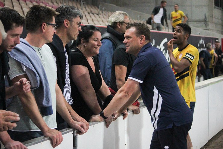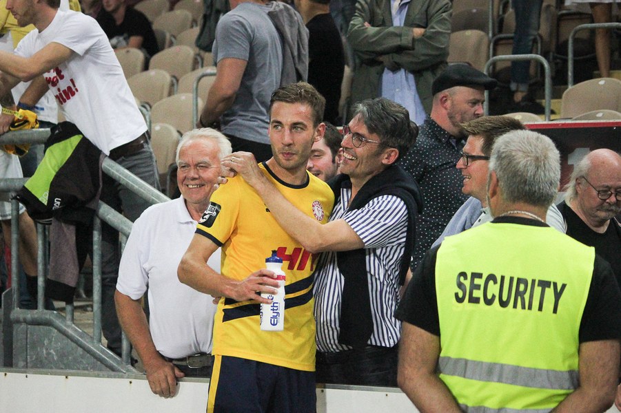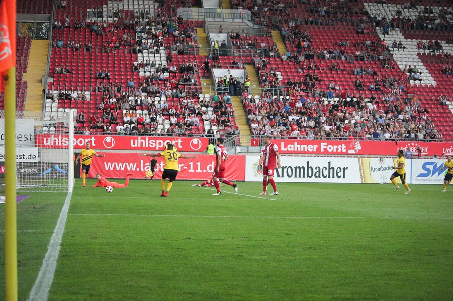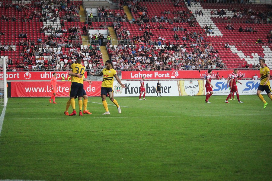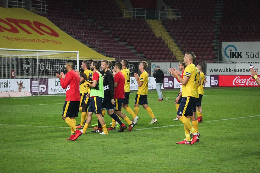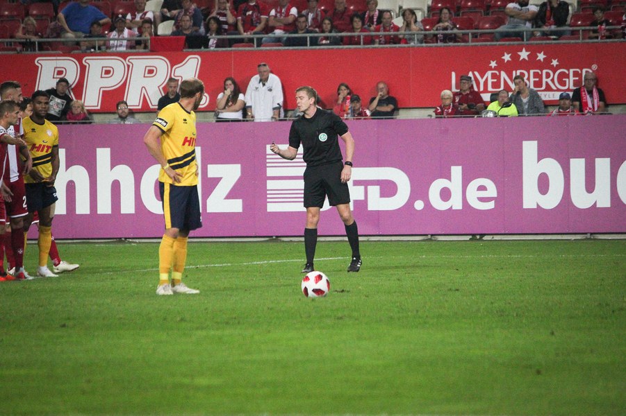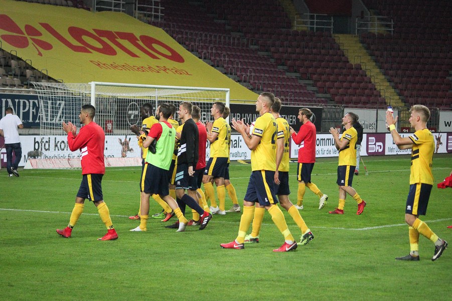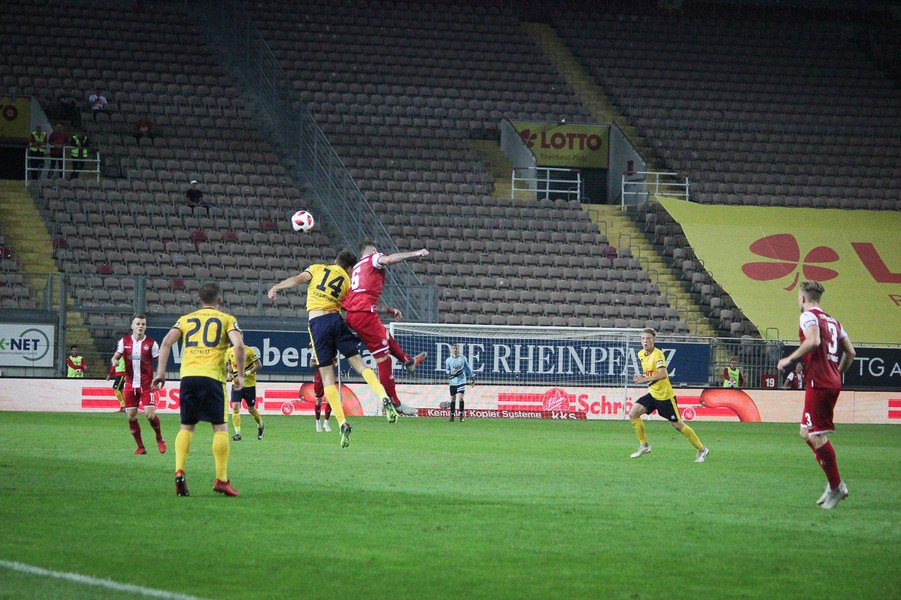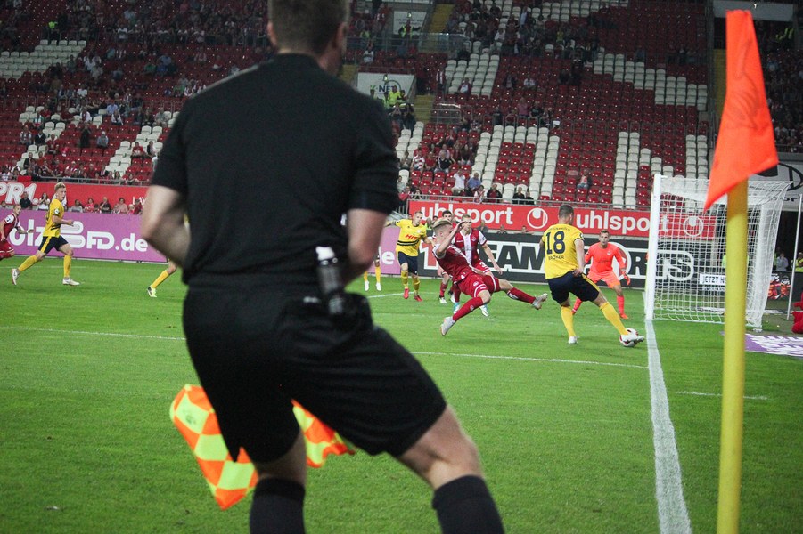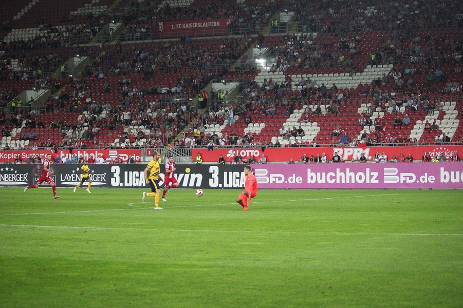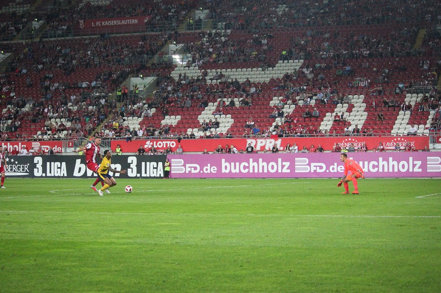 Unter dem gellenden Einsatz von Trillerpfeifen musste sich Schiedsrichter Schröder diesmal besonders bemühen, um den Anpfiff vorzunehmen. Die ersten Chancen ließen danach aber nicht lange auf sich warten. Eine leicht verunglückte Flanke Schieks landete wider Erwarten auf der Latte des Lauterer Kastens (5.). Für die Roten Teufel wirkte das zumindest kurzzeitig wie ein "Wachmacher", denn kurz darauf prüfte Hemlein den Torwart der Fortuna, aber Rehnen parierte (6.). Kurz darauf ließ die Fortuna die Euphorie der Gastgeber aber verstummen. Eine sehenswerte Kombination über viele Stationen endete in einem Tor von Robin Scheu aus spitzem Winkel (9.). Somit kam die Fortuna ihrem Ziel näher, die Heimmannschaft schon früh unter Druck zu setzen und das heimische Publikum in ihrer Ungeduld zu bestärken. Auch die Pfälzer auf dem Platz schien der Gegentreffer ein wenig zu hemmen. Die Fortuna blieb aber dennoch weiter konzentriert und ließ sich auch durch die Kulisse nicht zu sehr beeindrucken. Nach etwas mehr als einer halben Stunde setzte Moritz Hartmann einen weiteren empfindlichen Nadelstich, als er nach Vorlage von Kapitän Dahmani die Führung verdoppelte (31.). Das Spiel kippte in Richtung der Fortuna, sodass der Betzenberg spürbar unruhig wurde. Aus dem Nichts erzielten die Gastgeber dann den Anschlusstreffer von Thiele (35.). Die Mannschaft von Michael Frontzeck konnte die Partie danach immer besser an sich reißen und kurz vor der Halbzeit nach einer Ecke durch den Ex-Fortunen Biada dann doch zum Ausgleich kommen (44.). Mit 2:2 ging es dann in die Kabine.