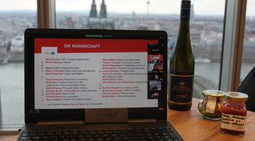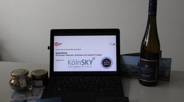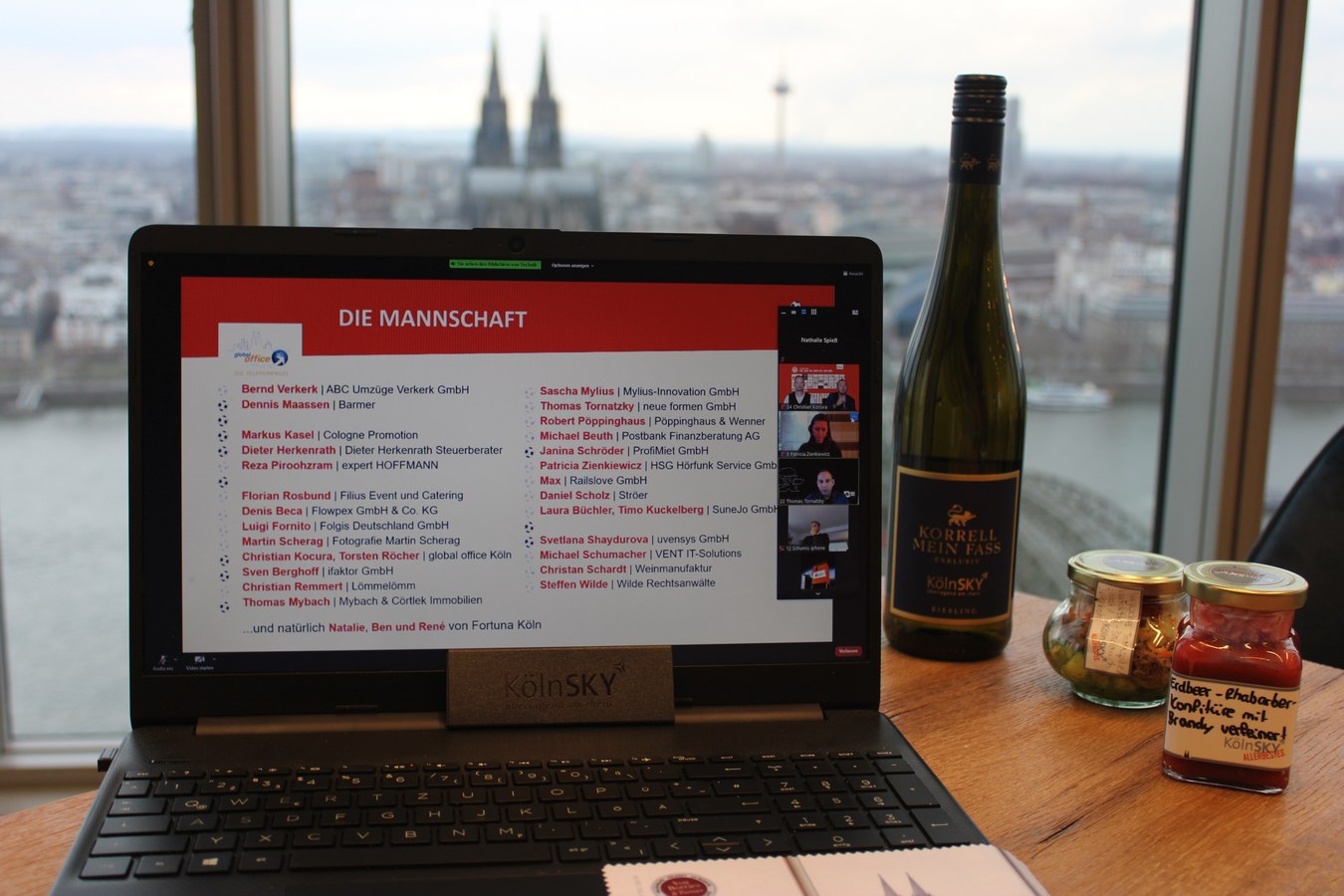 Dieses Mal ging es hoch hinaus. Bei unserem Partner KölnSky fand gestern das dritte Online-Speeddating für die Fortunapartner statt. Aus der 27. Etage des KölnTriangles begrüßten Geschäftsführer Michael Stern, Eventmanager Thomas Sekeres, und Küchenchef Sönke Höltgen über die Plattform Zoom, die teilnehmenden Gäste. Für die 30 Teilnehmer hieß es dann, sich kurz und möglichst prägnant in 60 Sekunden vorzustellen. Für die Halbzeitpause lieferte KölnSky bereits im Vorfeld der Veranstaltung den Teilnehmern ein exklusives Paket nach Hause. Darin enthalten waren, von Küchenchef Sönke Höltgen eigens erstellte Kreationen wie eine mit Brandy verfeinerte Erdbeer-Rhabarber Konfitüre oder bergischer Tafelspitz mit Kartoffel-Bärlauch Salat und Spitzkohl. Dort präsentierten die Gastgeber die zahlreichen Veranstaltungsmöglichkeiten, mit bestem Blick über die Domstadt.