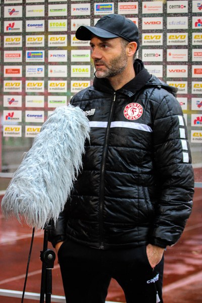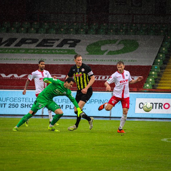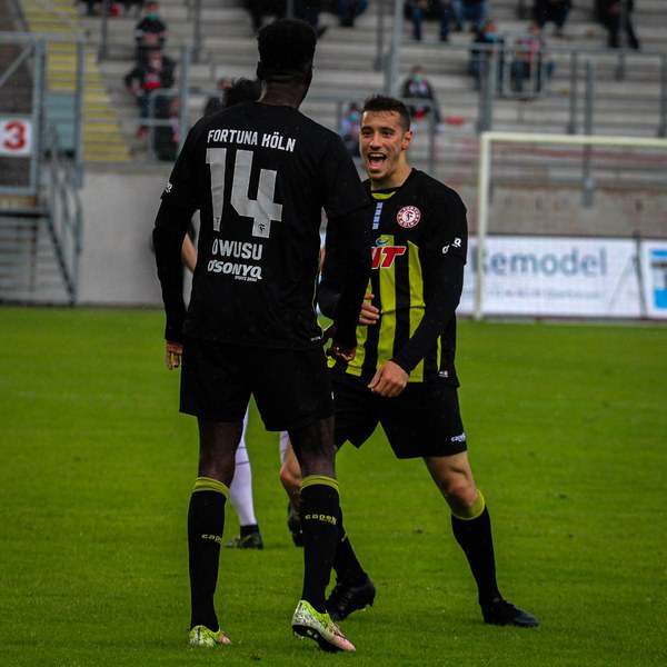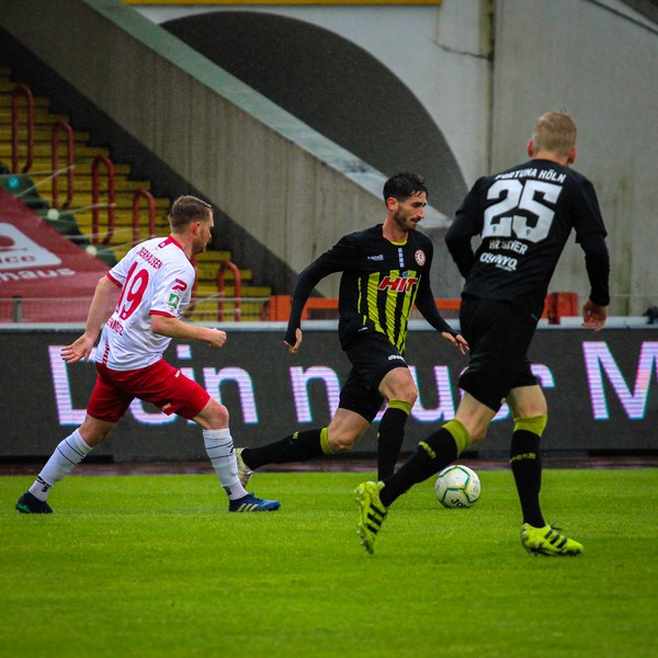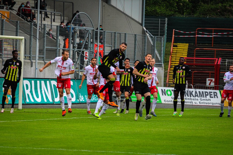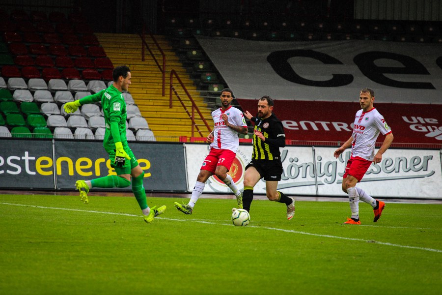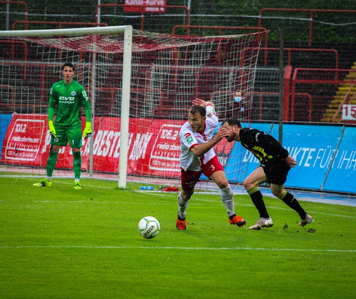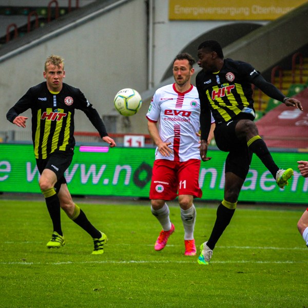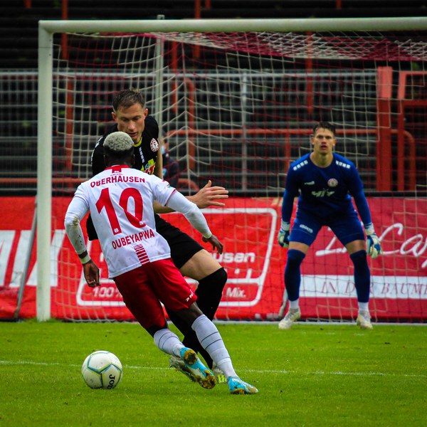Nachdem die Fortuna am Mittwoch noch im Bitburg-Pokal angetreten ist, stand heute wieder Ligaalltag auf dem Programm. Der Tabellensiebte aus Oberhausen durfte heute nach langer Zeit wieder Zuschauer im Stadion begrüßen. 500 Fans empfingen die Mannschaften lautstark auf dem Spielfeld. Im Vergleich zum Pokalspiel vor wenigen Tagen nahm Alexander Ende nur einen einzigen Wechsel vor: Für Hamza Salman stand Pascal Itter in der Startelf. In Oberhausen regnete es auch vor Anpfiff schon ununterbrochen, weshalb einige Spieler auf dem nassen Rasen den Halt verloren und wegrutschten. Jan-Luca Rumpf holte sich in einem intensiven Spiel schon früh die gelbe Karte ab, nachdem er seinen Gegner umgrätschte (7. Min.). Die vielen Ballverluste und die damit verbundenen Ballbesitzwechsel führten dazu, dass der Beginn der Partie sehr hektisch wirkte. Ein leichtsinniger Ballverlust in der Vorwärtsbewegung von Timo Hölscher leitete beinahe die Führung der Gastgeber ein. Ein Steckpass landete bei Oubeyapwa, in seinen Abschluss warf sich Lanius rein und klärte gerade noch zur Ecke. Der anschließende Eckball ließ die Zuschauer dann jubeln. Das Spielgerät wurde an den zweiten Pfosten befördert, dort stand Terada bereit, der per Kopf den 1:0 Führungstreffer erzielte (12. Min.). Die Fortuna lag früh zurück, fand aber auch nach dem Rückschlag nicht wirklich in die Partie. Das Spiel der Fortuna war teilweise sehr überhastet und sie schafften es kaum den Ball über mehrere Stationen laufen zu lassen. Rot-Weiß Oberhausen kam dagegen öfter in die Nähe des gegnerischen Tores und holte zumindest immer mal wieder einen Eckball raus. Die erste gefährliche Aktion auf Seiten der Fortuna leitete Hölscher ein. Der zentrale Mittelfeldspieler spielte einen punktgenauen Ball in den Lauf von Suheyel Najar. Er rannte auf das gegnerische Tor und suchte den Abschluss. Fassnacht, der im Vollsprint angerauscht kam, schmiss sich dazwischen und konnte den Gegentreffer verhindern (25. Min.). Das sollte auch die einzige nennenswerte Chance in Durchgang eins für die Fortuna bleiben. Der Torschütze Terada hätte beinahe einen Doppelpack geschnürt. Ausgang war eine schöne Kombination der Kleeblätter, bevor Terada das Leder knapp rechts am Kasten von Rauhut vorbeisetzte (32. Min.). Fortuna Cheftrainer Alexander Ende wechselte bereits vor dem Pausenpfiff und brachte den von seiner Verletzung zurückgekehrten Maik Kegel. Für ihn räumte Kai Försterling das Feld, der bereits mit einer gelben Karte belastet war (39. Min.). Bevor es für beide Mannschaften in die Kabinen ging, hatten die Oberhausener erneut eine gute Möglichkeit. Kreyer ließ die komplette Abwehr der Fortuna alles andere als gut aussehen und tanzte die Hintermannschaft im Strafraum aus. Sein abgeblockter Schuss landete beim Oberhausener Topscorer Oubeyapwa. Aus guter Position konnte sein Abschluss ebenfalls gerade noch abgewehrt werden (42. Min.). Kurz darauf pfiff Schiedsrichter Schäfer zur Halbzeit.