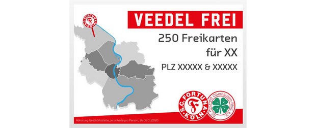 Vor jedem Heimspiel der Südstädter wird ab sofort über die mehr als 90 LED-Screens von Ströer das „Veedel-frei“-Motiv geschaltet. Dort ist neben einem markierten Stadtbezirk auch eine Nennung von Postleitzahlen zu sehen. Alle Kölner, deren Wohnort zu den jeweiligen Postleitzahlen zählt, haben die Chance, sich eine von 250 Freikarten zu sichern. Einfach den Personalausweis in der Fortuna Geschäftsstelle (Am Vorgebirgstor 2, 50969 Köln) vorzeigen und eine der Freikarten ergattern. Das Motto lautet hier: Wer zuerst kommt, mahlt zuerst. Pro Person wird nur ein Ticket vergeben, das Angebot gilt nicht am Spieltag selbst.