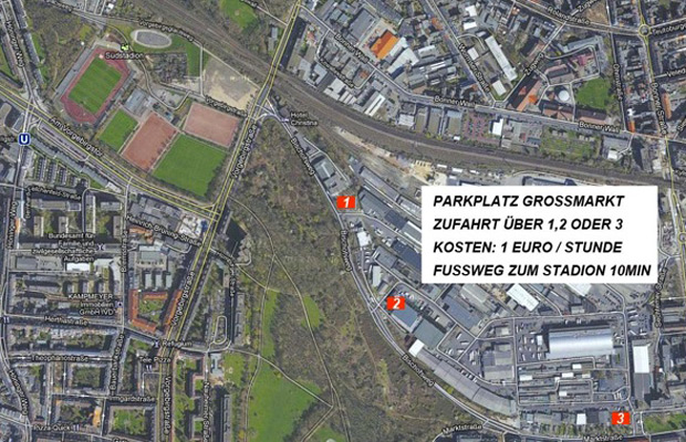 Beim kommenden Heimspiel gegen Fortuna Düsseldorf II steht der große Asche-Parkplatz, aufgrund des 1. Kölner Oktoberfest nicht zur Verfügung. Alternativ könnt ihr euer Auto aber auf dem Großmarkt-Parkplatz (s. Bild) abstellen. Von diesem erreicht man das Stadion zu Fuß in 10 Minuten und die Parkgebühren belaufen sich auf 1€/Stunde.