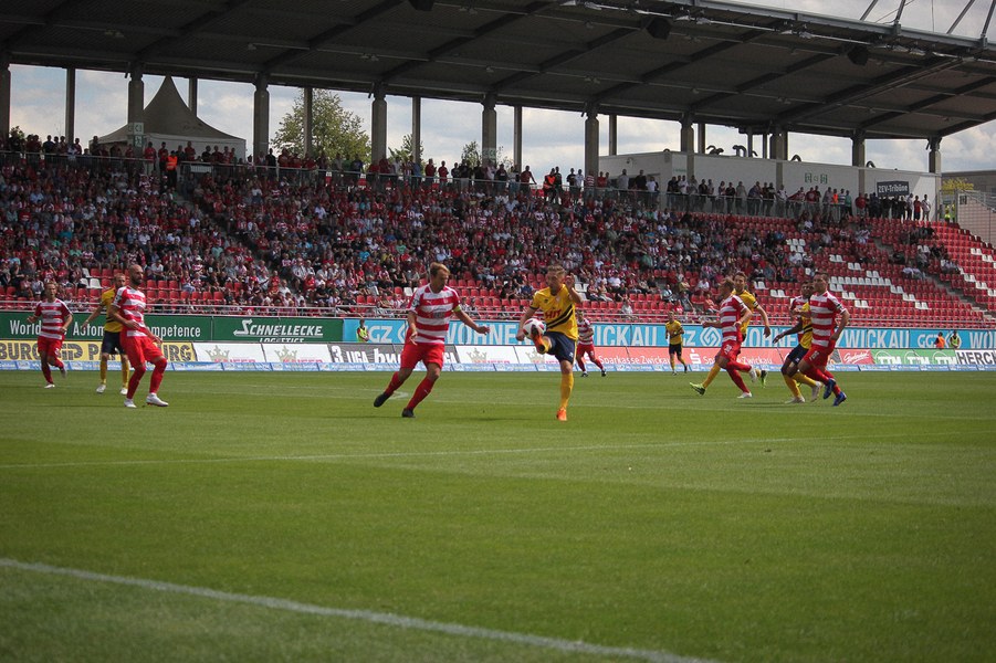 Die Teams ließen sich etwas Zeit, bis sich die Statistikzettel der Medienvertreter füllten. Das Tempo der Partie war zunächst nicht so hoch wie noch bei hochsommerlichen Temperaturen unter der Woche gegen den Karlsruher SC. Die Anfangsphase dieses Auswärtsspiels war geprägt von kleineren Fouls und Ungenauigkeiten. Auch nach einer Viertelstunde waren beide Torhüter noch nicht wirklich gefordert. Die Fortuna versuchte es neben einigen spielerischen Ansätzen auch oft, Michael Eberwein mit einem langen Ball aus der Defensive zu erreichen und so durch den verlängerten Ball per Kopf Moritz Hartmann ins Spiel zu bringen. Nach rund zwanzig Minuten entwickelte die Fortuna ein leichtes Übergewicht in Sachen Ballbesitz. Immer wieder spielte man sich gefällig bis an den Strafraum der Gastgeber heran. Die beste Chance bis dahin hatte Hartmann, als er aus der Drehung an Brinkies scheiterte (27.). Dabei blieb es vorerst auch, auch wenn die Fortuna die langen Bälle seltener werden ließ und sich teils konzentriert in die Hälfte des FSV kombinierte. Dennoch waren es die Schwäne, die gegen Ende der ersten Hälfte so etwas wie eine Chancen hatten, als Reinhardt es flach aus der Distanz versuchte (41.). Das sollte es dann für die erste Spielhälfte gewesen sein.