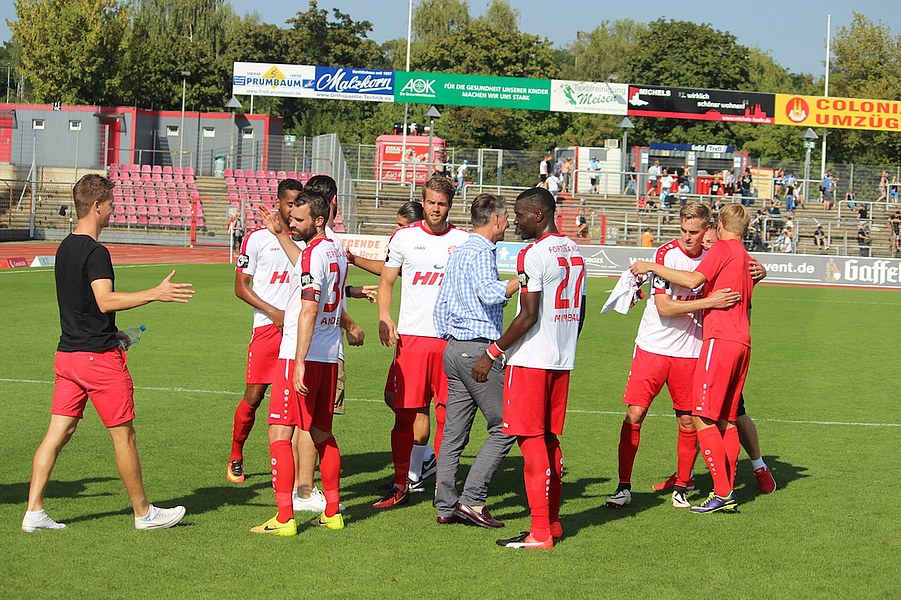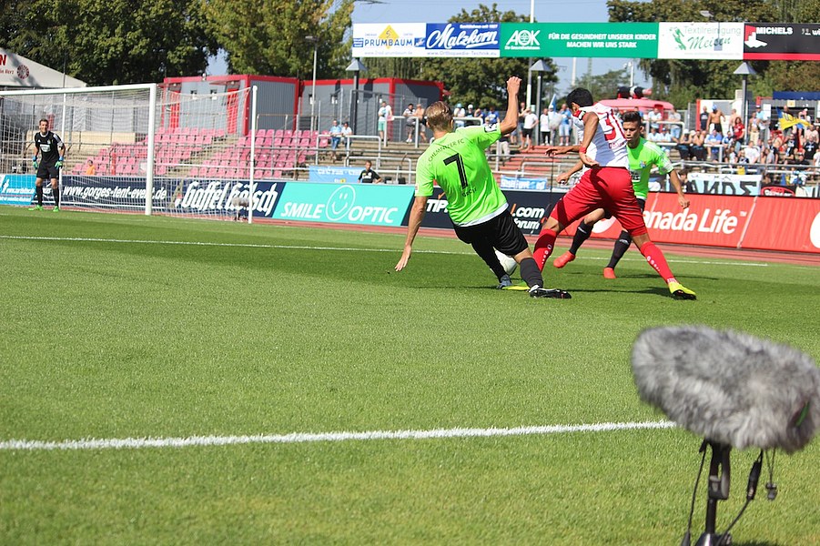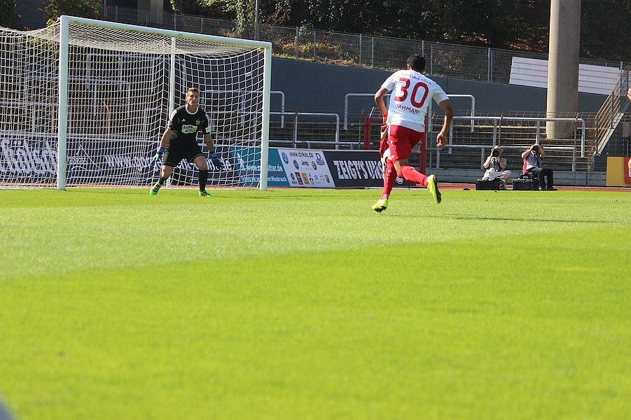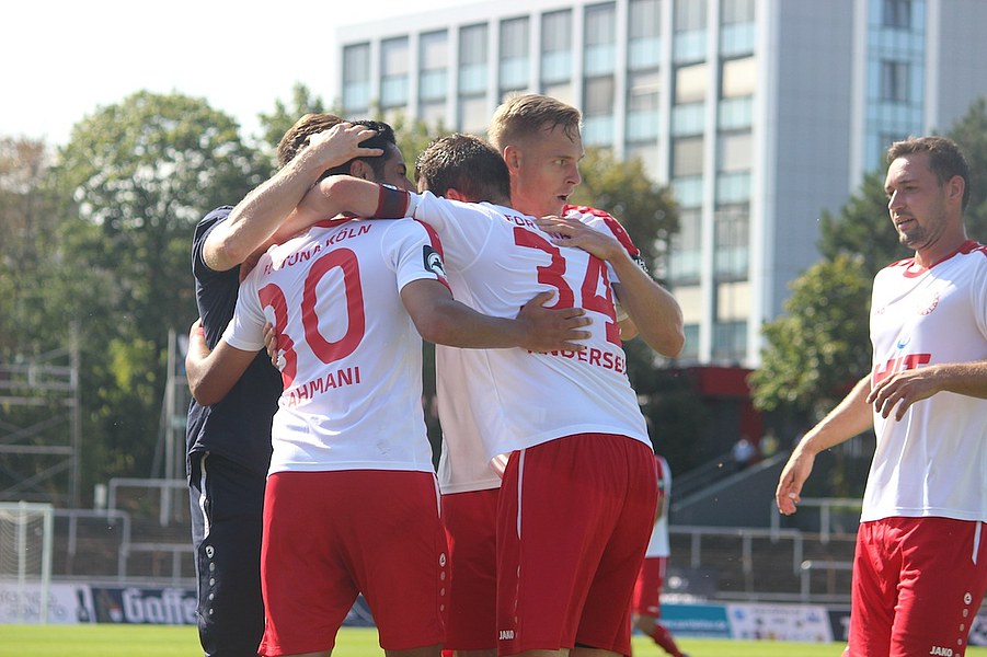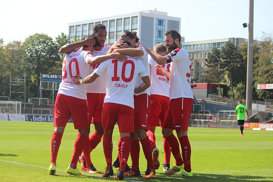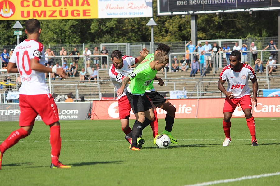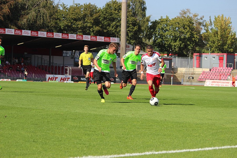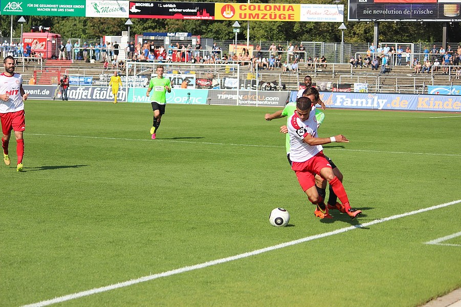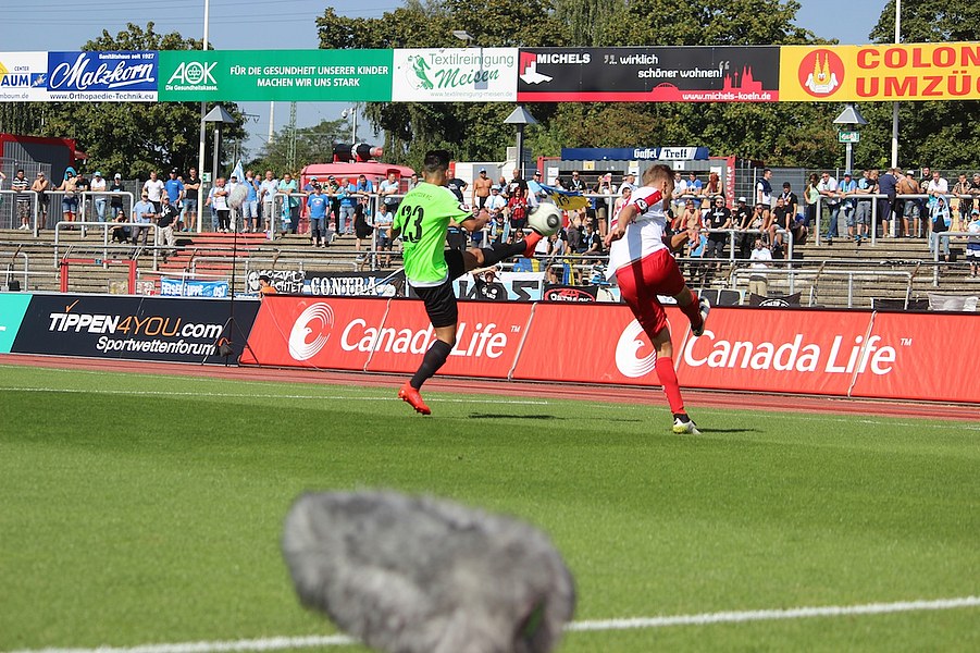 Dabei gab es im Südstadion zunächst eine vorsitichtige Anfangsphase zu sehen, die nur von einem Highlight gestört wurde - das hatte es aber in sich: Nach einem Einwurf hatte Frahn aus nächster Nähe die Führung auf dem Fuß, scheiterte aber an Poggenborg (5.). Ansonsten versuchten beide Teams fußballerisch in die Partie zu finden, auch wenn die Fortuna über Kegel den einen oder anderen Diagonalball einstreute. Beide Teams waren aber auf Kontrolle bedacht und versuchten Fehler zu vermeiden. Erst Mitte der 1. Halbzeit wurde es lebendiger: Nachdem Uaferro nach der ersten Ecke die erste Kölner Offensivaktion verbuchte (13.), hatte Koruk bei seinem Drittliga-Startelfdebüt die Fortuna-Führung nach einem Kegel-Freistoß auf dem Kopf (23.). Es war das Lauern auf das 1:0 im Südstadion, wobei Chemnitz dem Tor in seinen Aktionen näher war: Zunächst streifte ein Schuss von Frahn am langen Pfosten vorbei (23.). Kurz darauf küsste Cincotta mit einem fulminanten Lattentreffer das Südstadion wach (25.). Es war der Weckruf für die Fortuna, die den entsprechend aufnahm: Nach einem Angriff von Chemnitz konterten die Kölner mustergültig: Andersen trieb den Ball durchs Mittelfeld in Richtung Dahmani, der vor dem Tor exakt in den Lauf von Souza legte - 1:0 für die Fortuna (33.). Der Schock saß bei Chemnitz, die sich schwer taten, eine Antwort zu finden. Immer wieder versuchte man das Sturmduo Frahn und Fink zu finden. In gefährliche Abschlusspositionen kamen die beiden aber nicht. So blieb es bei der Führung für die Fortuna zur Pause.