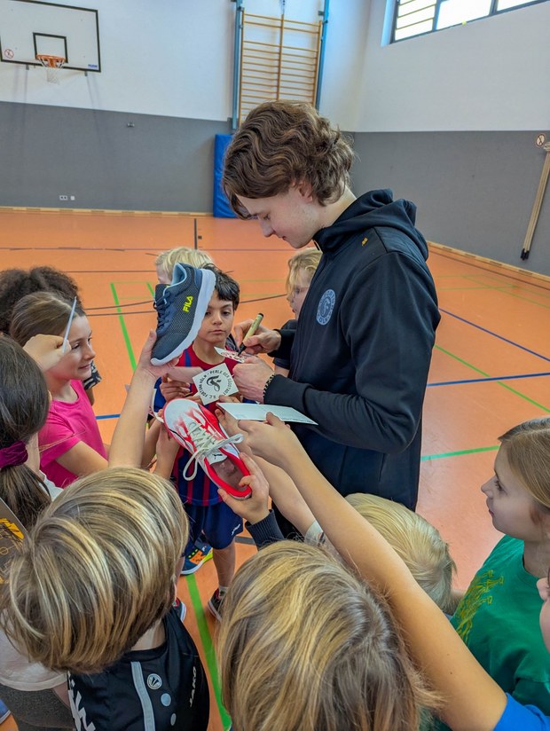 Bereits im Dezember vergangenen Jahres hatten Abdul Bance, Lennart Winkler und Gianluis Di Fine dieser Schule einen Besuch abgestattet. Insgesamt kamen so 120 Kinder aus fünf Klassen, alle aus der vierten Klasse, in den Genuss spannender Challenges wie Elfmeterschießen, Fallrückzieher oder Spiele Klasse gegen Klasse. „In der Turnhalle habe ich früher selbst Sport gemacht. Die Kinder waren alle sehr nett und lustig. Ich musste viele Autogramme schreiben. Leider habe ich keinen meiner alten Lehrer getroffen“, sagte Finn Bauens.