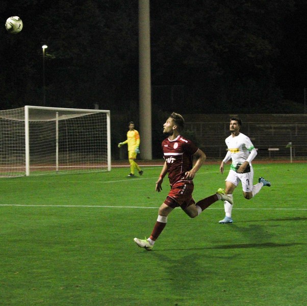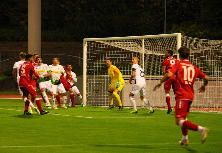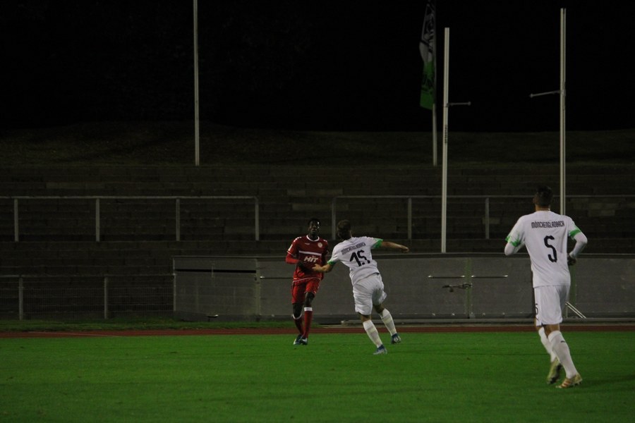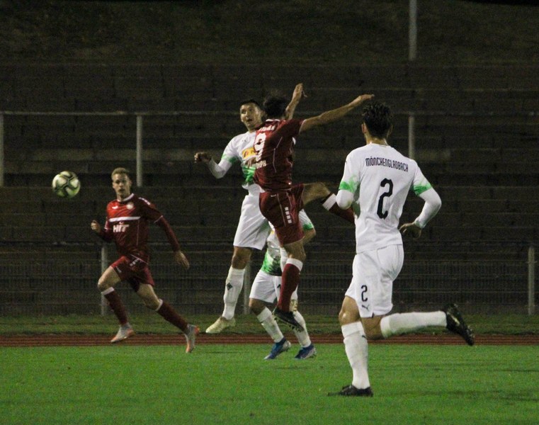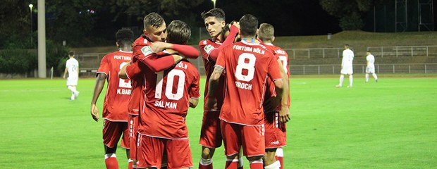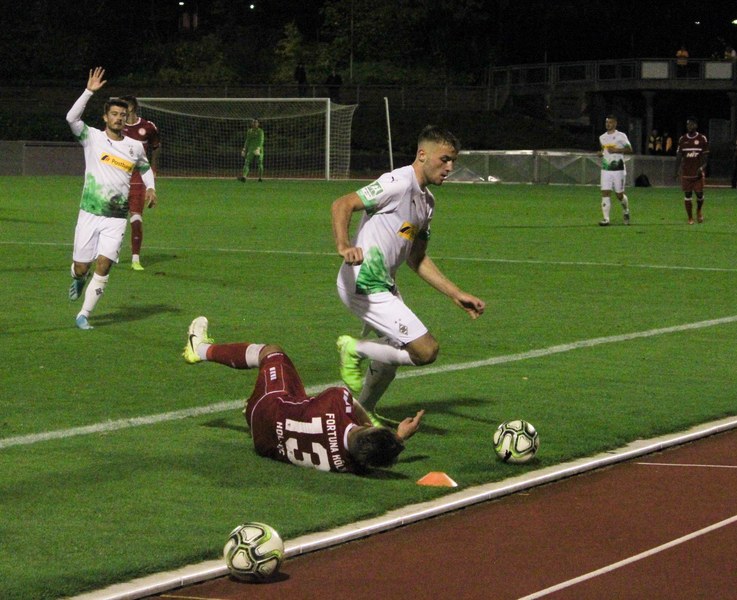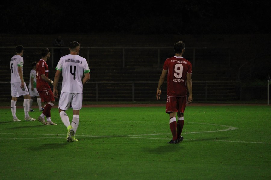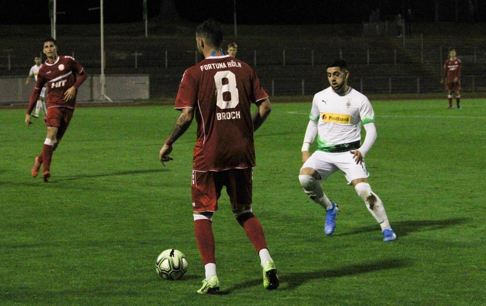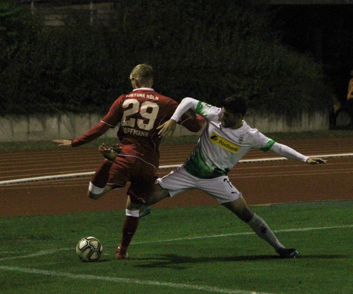 In den Anfangsminuten setzte die Borussia die ersten Akzente des Spiels. Nach Fehlpass von Försterling im Mittelfeld, zog Italiano Richtung Tor und suchte an der Strafraumkante den Abschluss. Kevin Rauhut lenkte den Ball sicher zur Ecke (3.). Nur eine Minute später hatte die Fortuna Glück, als ein abgefälschter Schuss knapp neben dem Kasten landete (4.). Bereits in den Anfangsminuten mussten die Kölner aufpassen, nicht in Rückstand zu geraten. Die Fortuna tauchte durch eine Ecke erstmals gefährlich vor dem Kasten von Max Grün auf. Den hereingeschlagenen Ball klärte Gladbach im ersten Versuch. Prokoph nutzte jedoch die zweite Welle, um den Ball vor das Tor zu köpfen, fand dort aber keinen Mitspieler (8.). Auf der anderen Seite versuchte es Cirillo mit einem Distanzschuss, der nur knapp am langen Pfosten vorbei ging (12.). Jubeln durfte zehn Minuten später dann aber die Fortuna. Nach starker Balleroberung im Mittelfeld machte sich Mike Owusu auf den Weg nach vorne und legte vor dem Kasten noch einmal quer auf Salman, der den Ball mit Hilfe eines Gladbacher Beins im Kasten versenkte (22.). Der Schrei nach dem Tor machte deutlich, wie wichtig dieser Treffer war. Es zeigte sich ein offenes Spiel, in dem die Fortuna mehr Kontrolle hatte, als noch zu Beginn der ersten Halbzeit. Gladbach versuchte es immer wieder aus der Distanz, fand seinen Meister aber oftmals in Kevin Rauhut, während Fortuna schnelle Konter nutzte, um für Akzente zu sorgen. So war es Alem Koljic, der über die rechte Offensivseite das Tempo anzog und an der Kante zum Strafraum flach vor das Tor spielte, wo Roman Prokoph im Hereinrutschen knapp verpasste (39.). So ging es mit der knappen Führung der Südstädter in die Pause.
