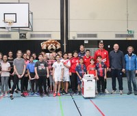 Startschuss der Schulaktion war um 9 Uhr in der Dreifach-Turnhalle der Schule. Torwart Nikolai Rehnen und Mittelfeldspieler Ali Ceylan empfingen die Kinder gemeinsam mit Geschäftsstellenmitarbeitern an...