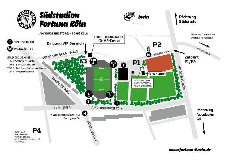 Von der A1 bzw. A3 nehmen Sie die Ausfahrt A4 Richtung Köln. Am Kreuz Köln-Süd (A4) nehmen Sie die Ausfahrt Richtung Bayenthal. Anschließend folgen Sie dem Straßenverlauf auf der linken Spur Richtung Innenstadt bis zum Kreisverkehr. Im Kreisverkehr nehmen Sie die zweite Ausfahrt auf die Bonner Straße. Der Bonner Straße folgen Sie bis zur Kreuzung Brühlerstr. / Bonner Str./ Marktstr. und biegen links in die Marktstraße (Richtung Großmarkt). Folgen Sie dem Straßenverlauf. Biegen Sie an der Ampel nach links ab und direkt wieder nach rechts zur Einfahrt zum Südstadion. Sie befinden sich nun am Südstadion.