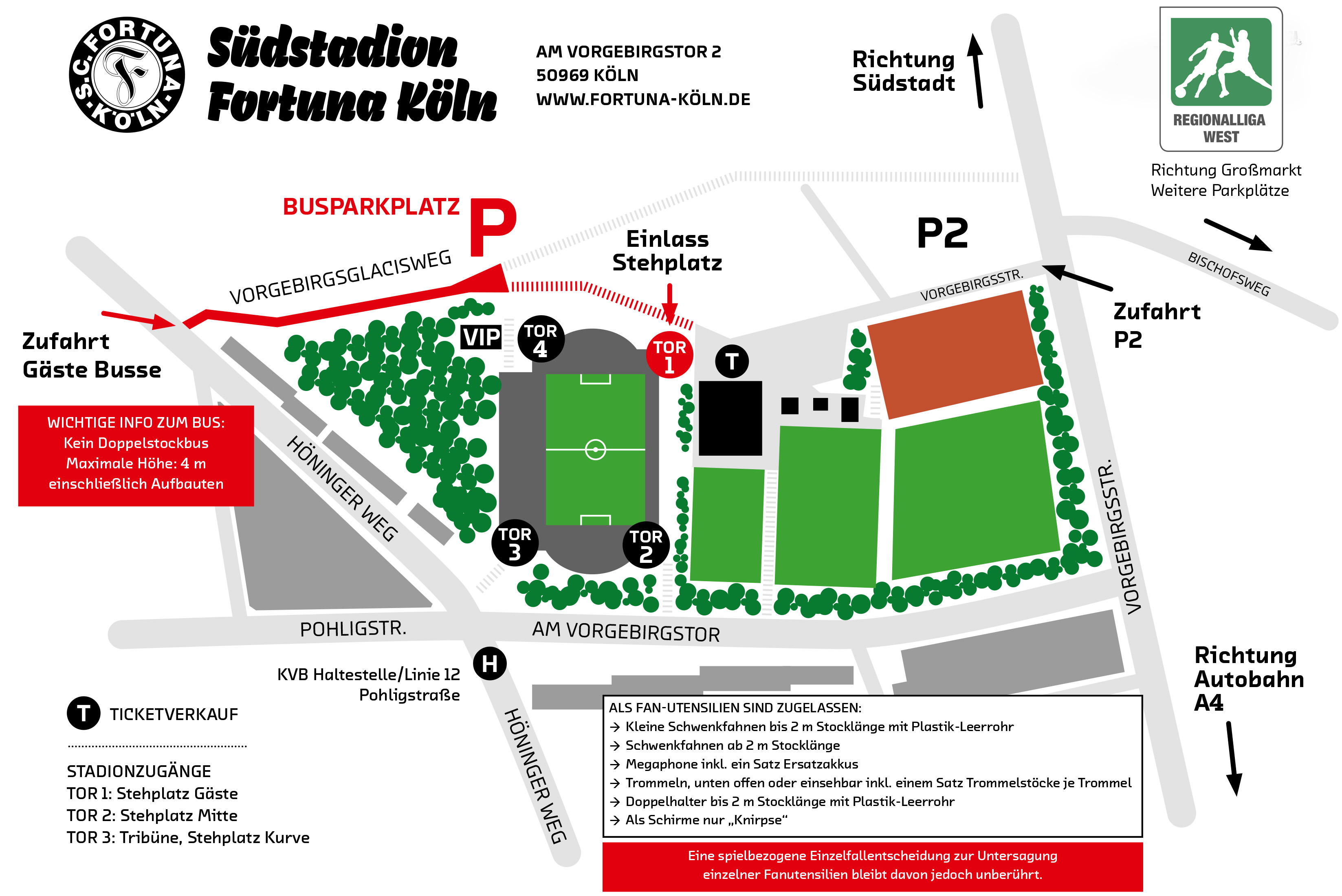 Nachfolgend findet ihr zusammengefasst einige hilfreiche Informationen für alle, die ihre Mannschaft im Zuge eines Auswärtsspiels nach Köln ins Südstadion begleiten möchten. Alle Informationen könnt ihr noch einmal ausführlich im Lageplan und der Stadionordnung des Südstadions nachlesen. Diese stellen wir euch ebenfalls zur Verfügung. Beides kann mit einem Klick auf die entsprechende Miniaturansicht geöffnet werden. Bitte lest euch die Informationen sorgfältig durch, um euren Aufenthalt so angenehm wie möglich zu gestalten. Bei weiteren Fragen stehen euch außerdem unsere Fanbeauftragten Frank Heller, Annika Onkelbach und Malte Petrikat gerne zur Verfügung.
